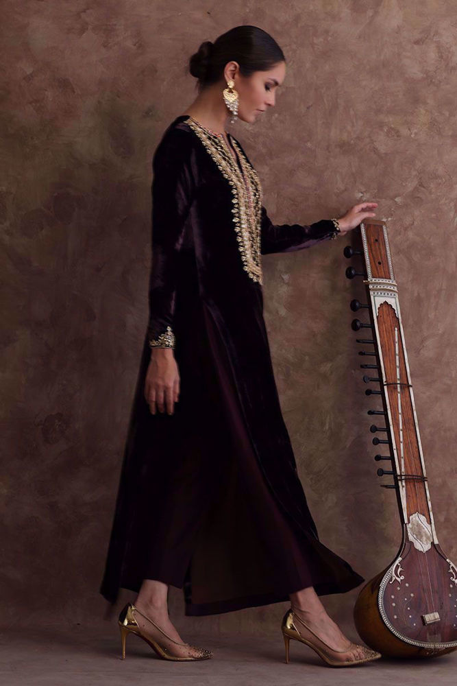 The bronze mist long shirt in pure velvet has eye-catching handwork details on the neckline. This beautiful piece has delicate handwork of zardozi, gota, sequins, naqshi, and cutdana. The attire has the same color pure raw silk pants and a pure organza dupatta with a zari work border to be purchased at an additional cost.