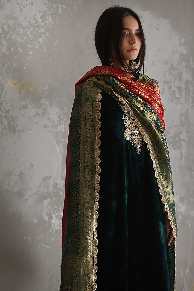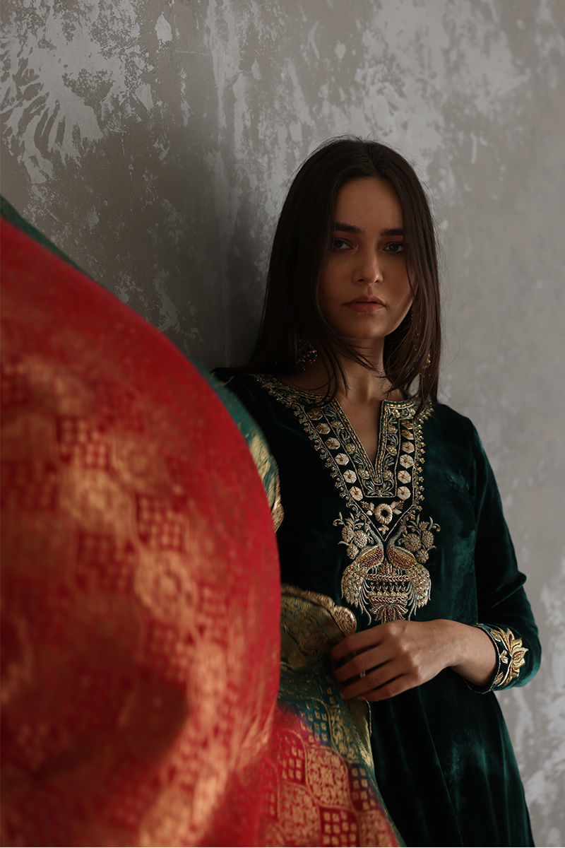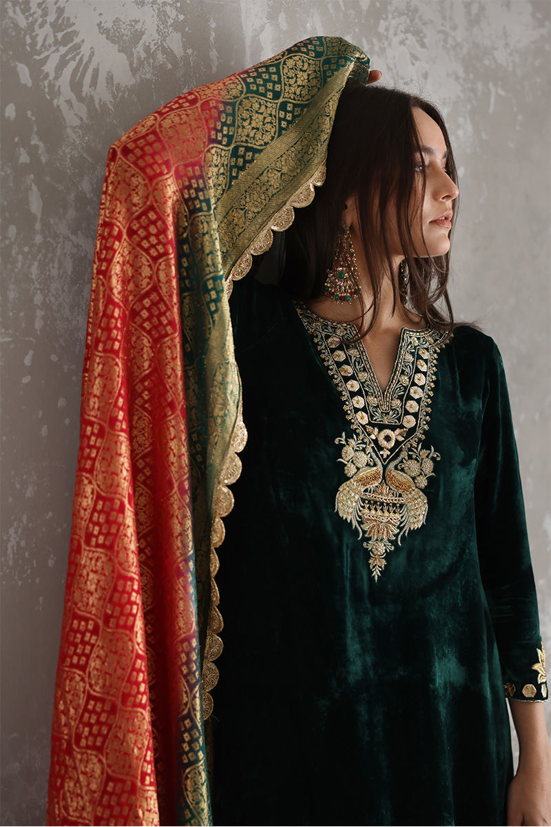 This Emerald Green pure velvet long shirt is a must have for winters wardrobe with beautiful neckline and sleeves of zari, gota, sequins, stones and zardozi work. Matching color pure banarsi chiffon chadar and same color pure raw silk pants are paired on additional cost to give a regal look to the attire.