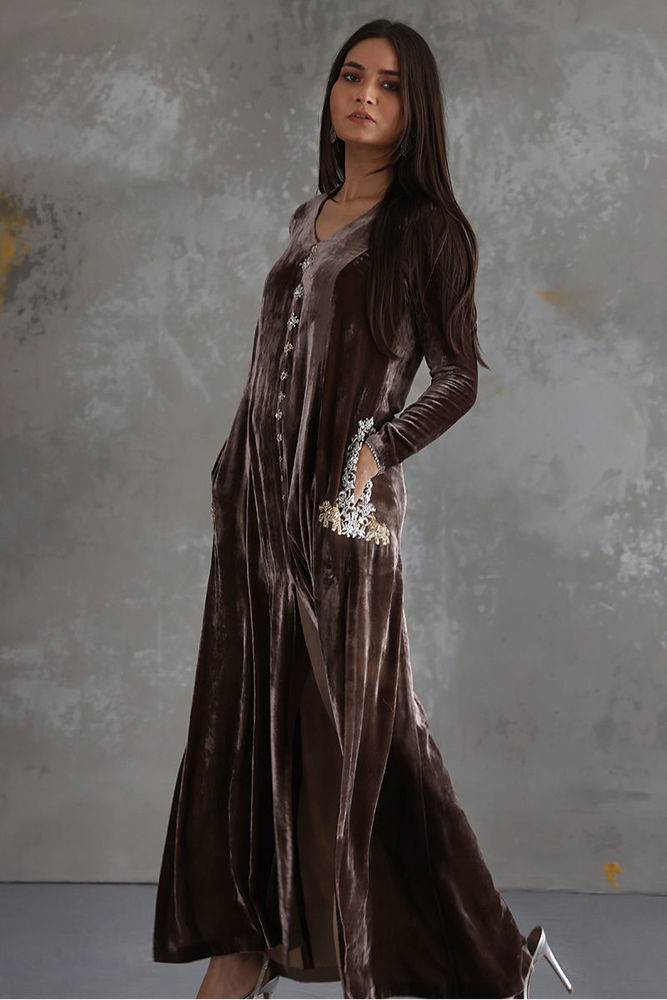 Pinewood color Pure velvet in a prince panel and centre cut style is an elegant and richful piece. The shirt has uplifted with the refine zardozi work on pockets and front line. It is paired with pure raw silk pants in same color, to be purchased at additional cost.This outfit includes pants.