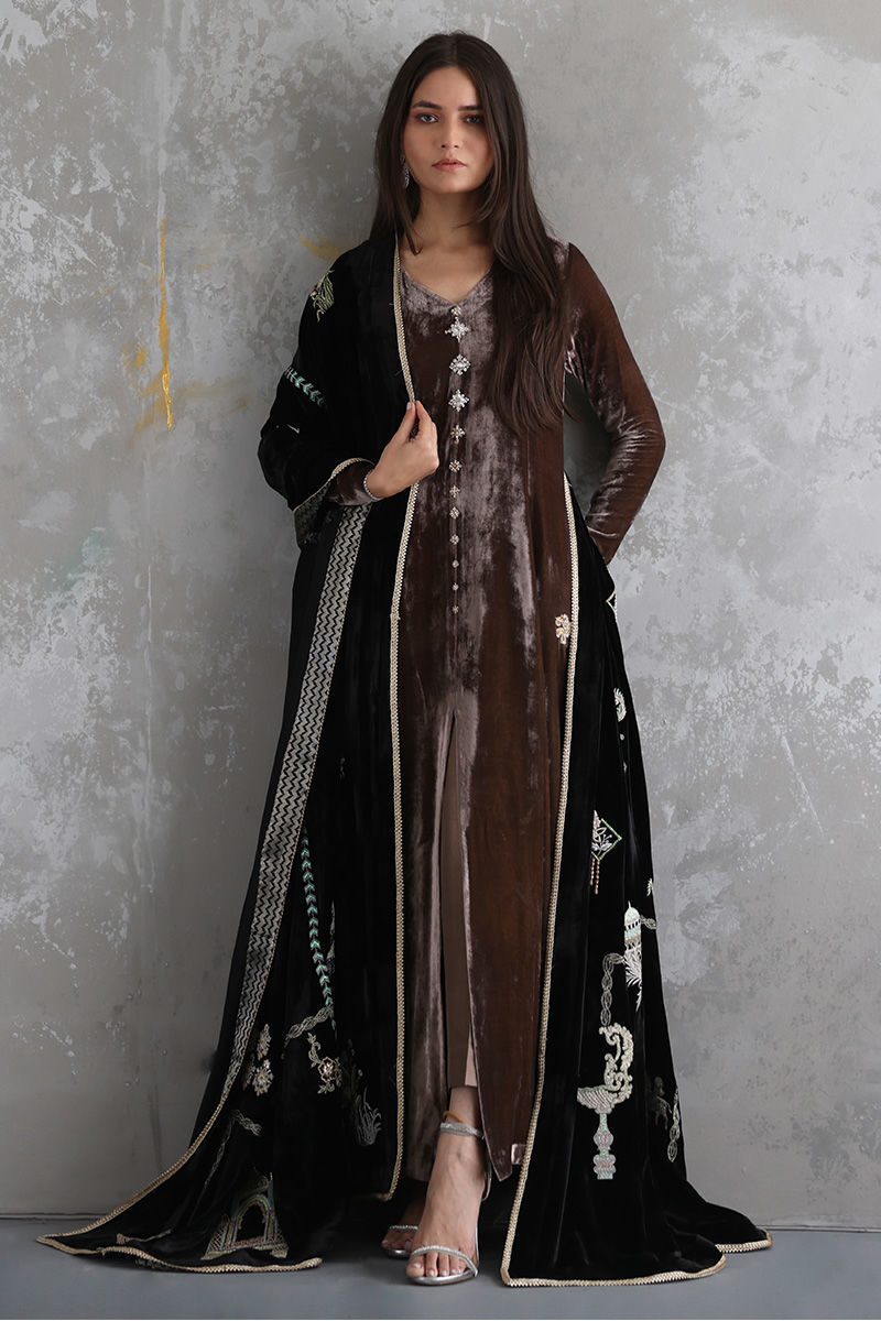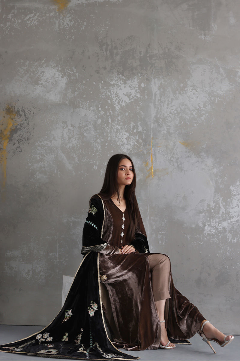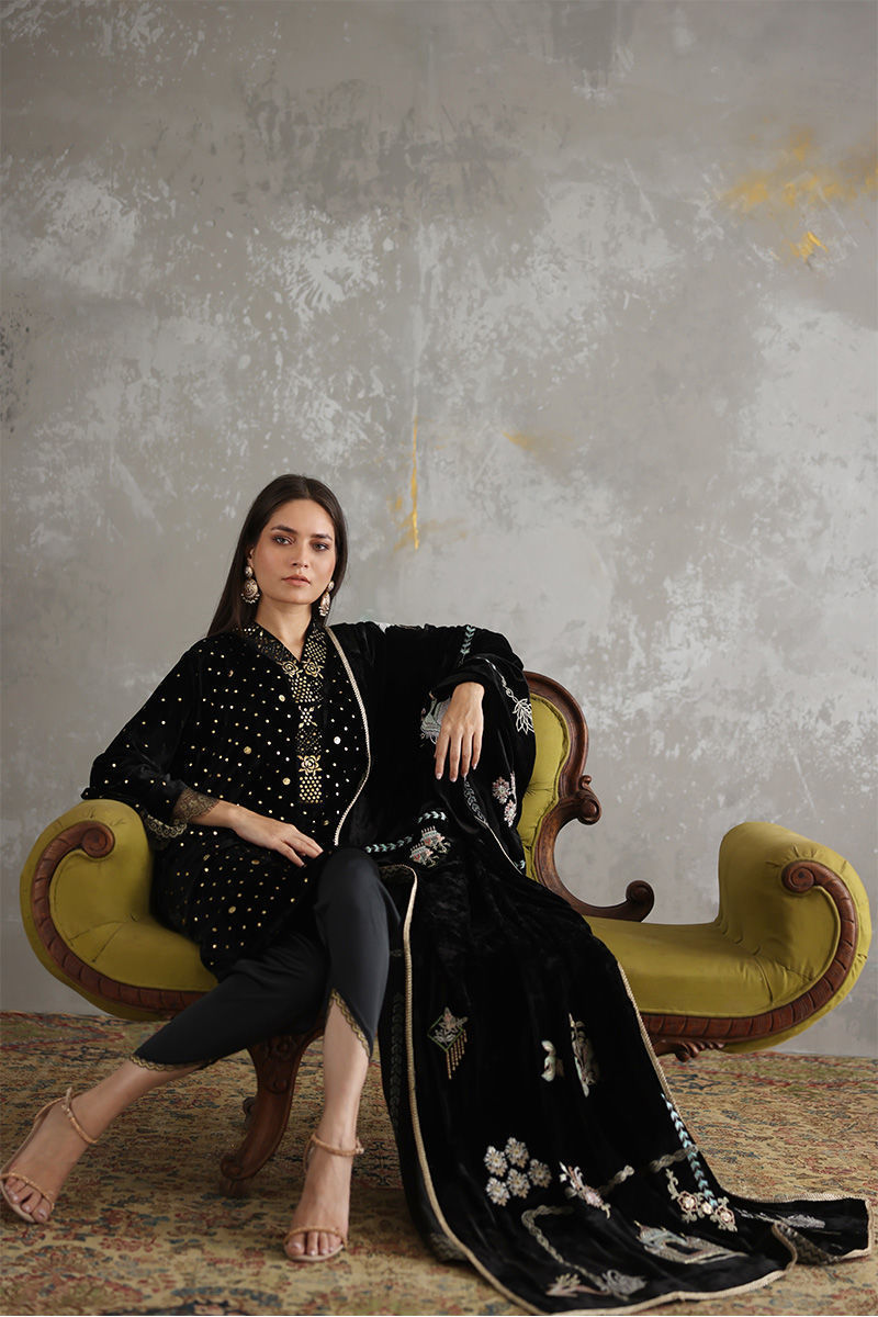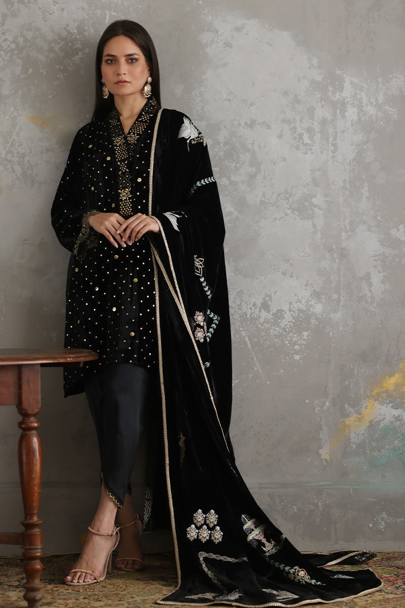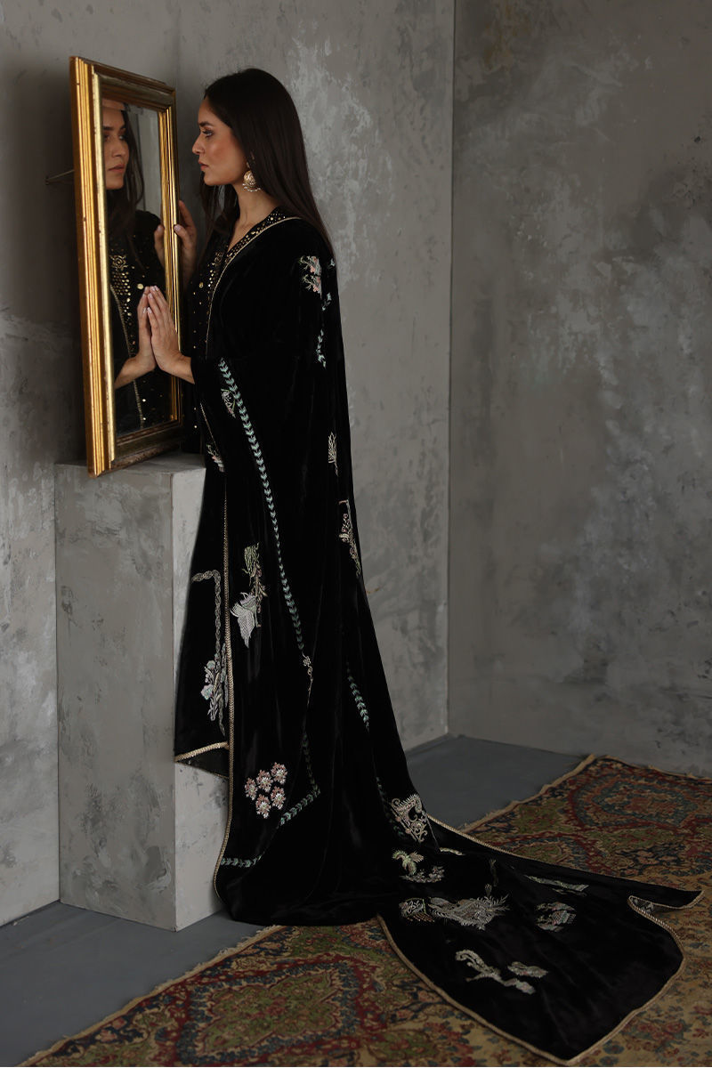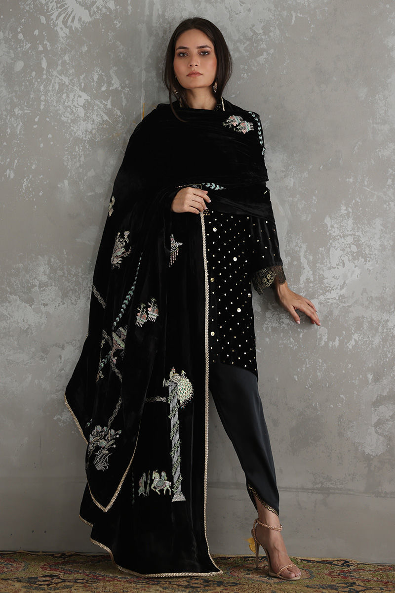 This timeless black pure velvet Shawl acts as the canvas with artwork of Floral and Mughal theme with fine Zari and thread work by talented Craftsman of RM.