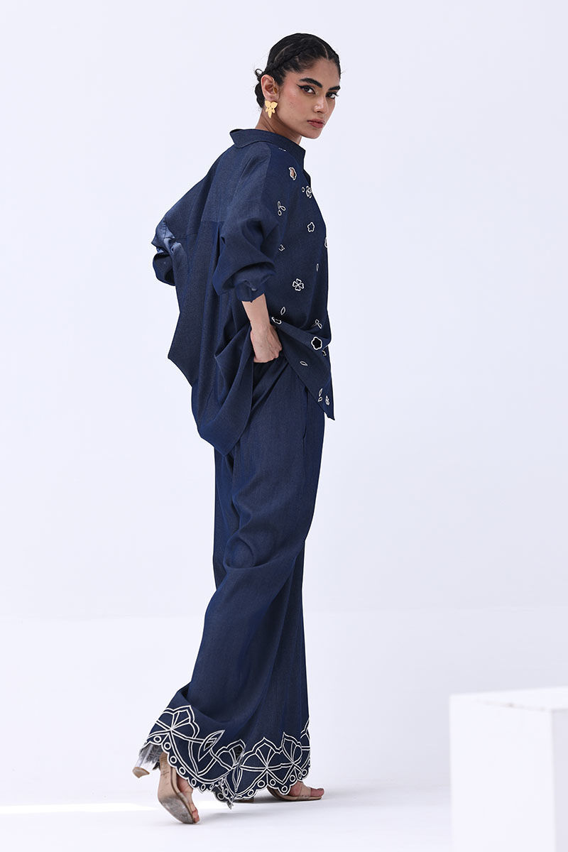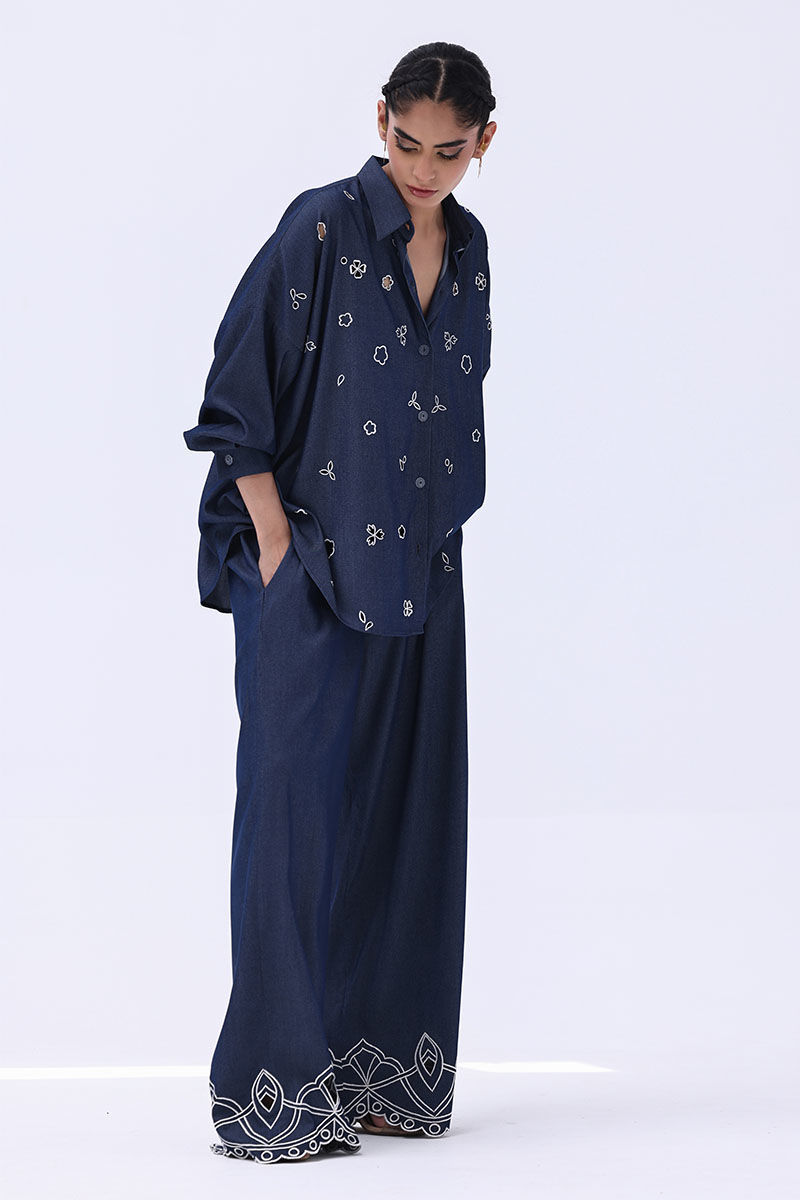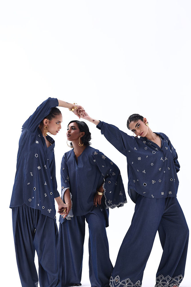Refined and effortlessly chic, this Dark Blue Tencil Denim co-ord set features a shirt with all-over Resham embroidery and intricate cutwork, offering a richly textured, artisanal look. The coordinated culottes are finished with delicate Resham-embroidered scalloped hems, bringing harmony and elegance to the silhouette. A perfect blend of structure and softness, this top-and-culottes ensemble is ideal for contemporary festive wear or elevated everyday styling.
