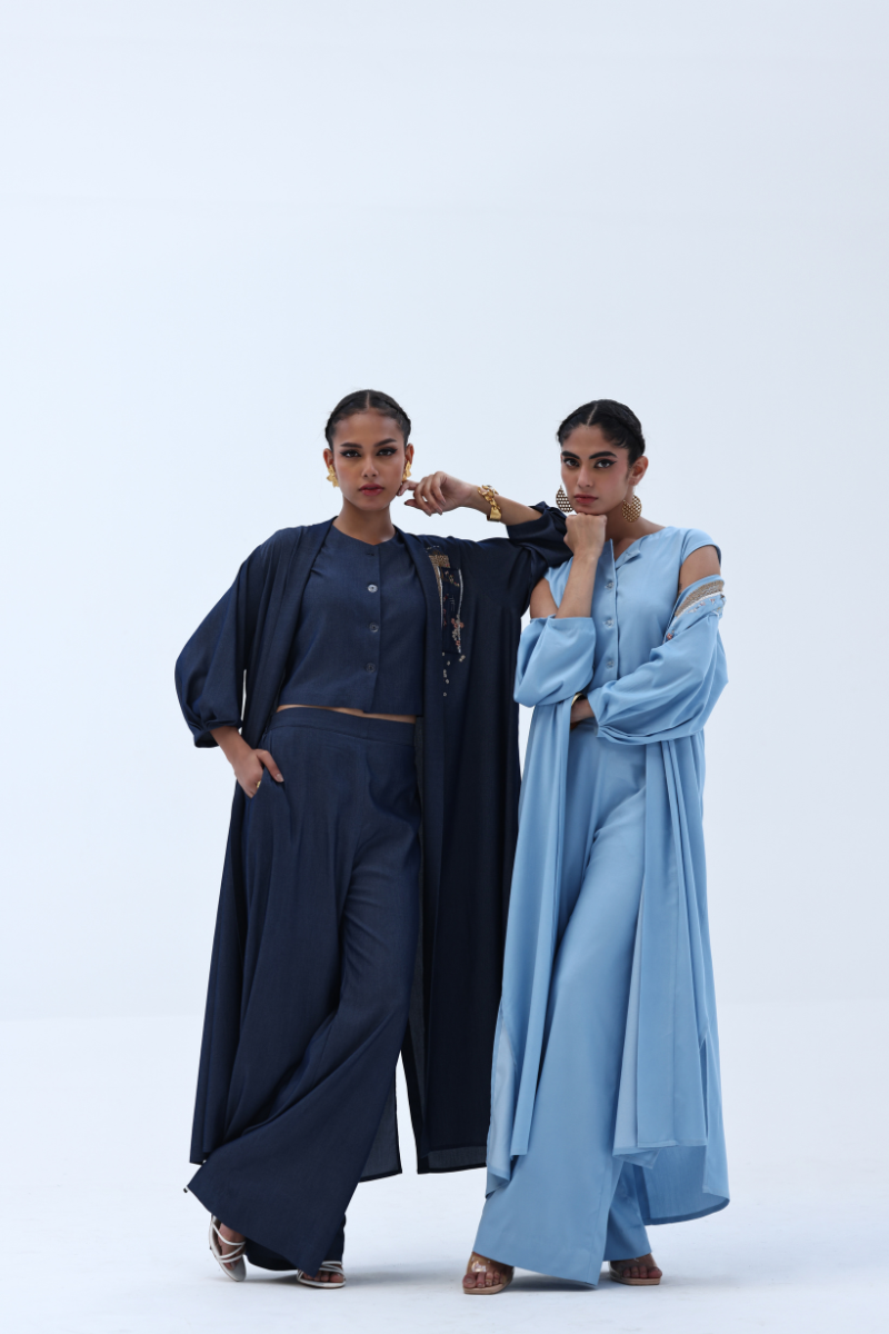 Artisanal flair meets modern design in this Dream Blue Tencil Denim ensemble. The button-down jacket is the centerpiece, featuring a striking handcrafted bunch crafted with jute, denim, zari, and vibrant Resham embroidery, adding depth and texture to the look. Paired with a clean inner top and matching culottes, this three-piece set blends structure with statement-making detail ideal for stylish daywear or contemporary festive dressing.