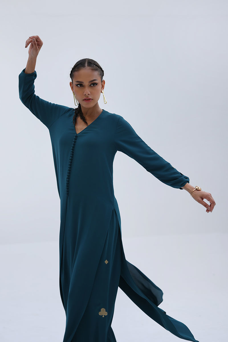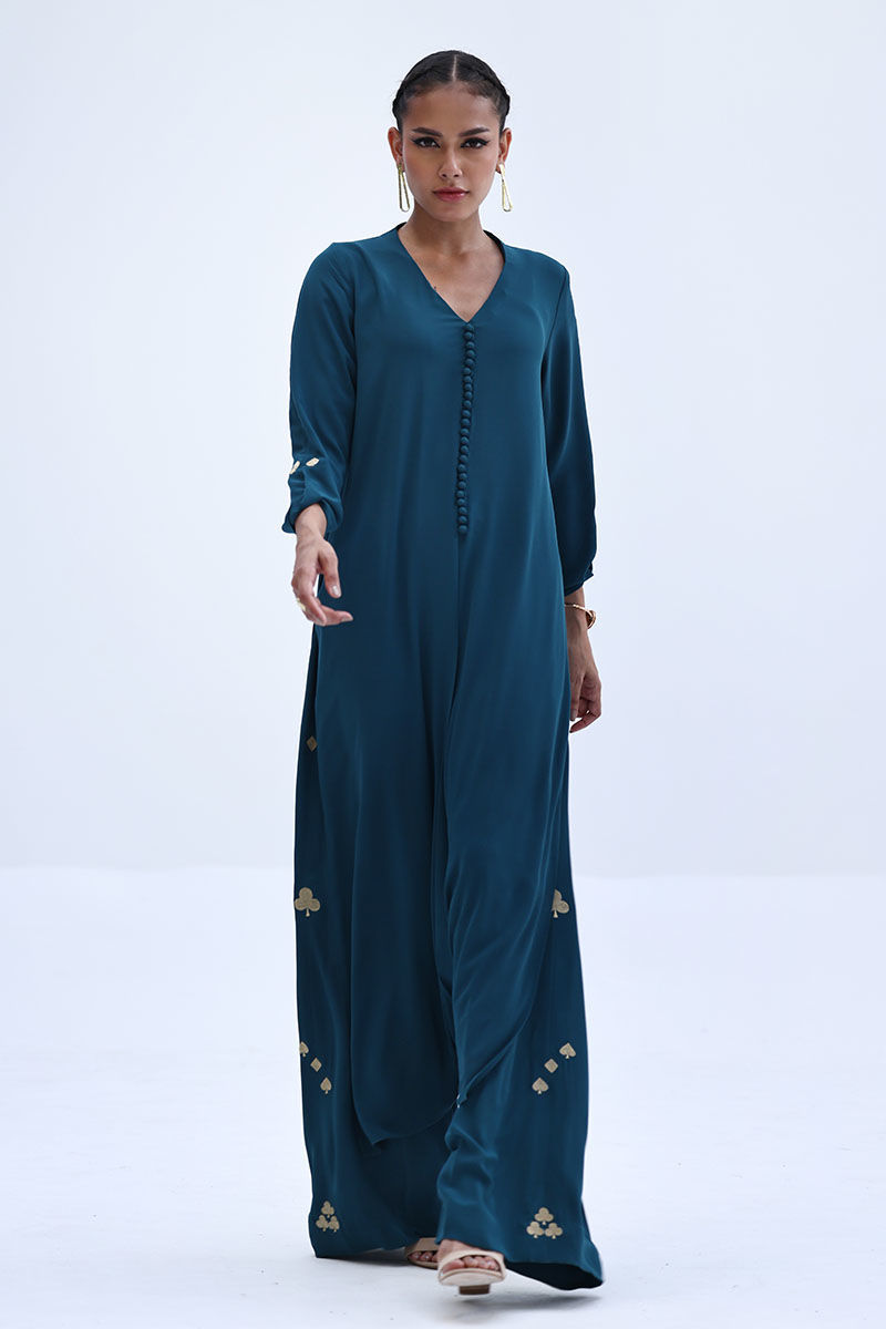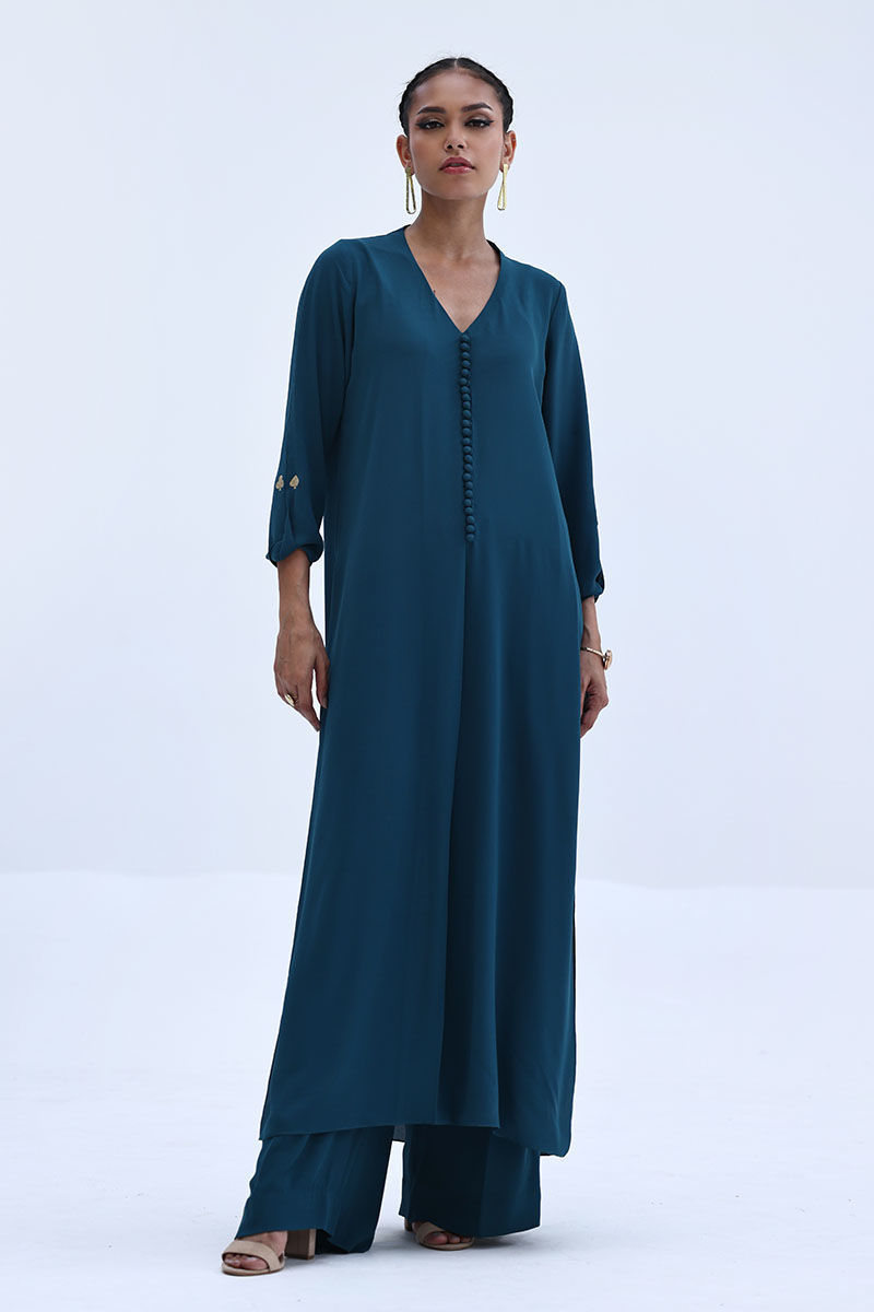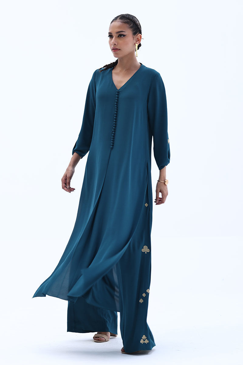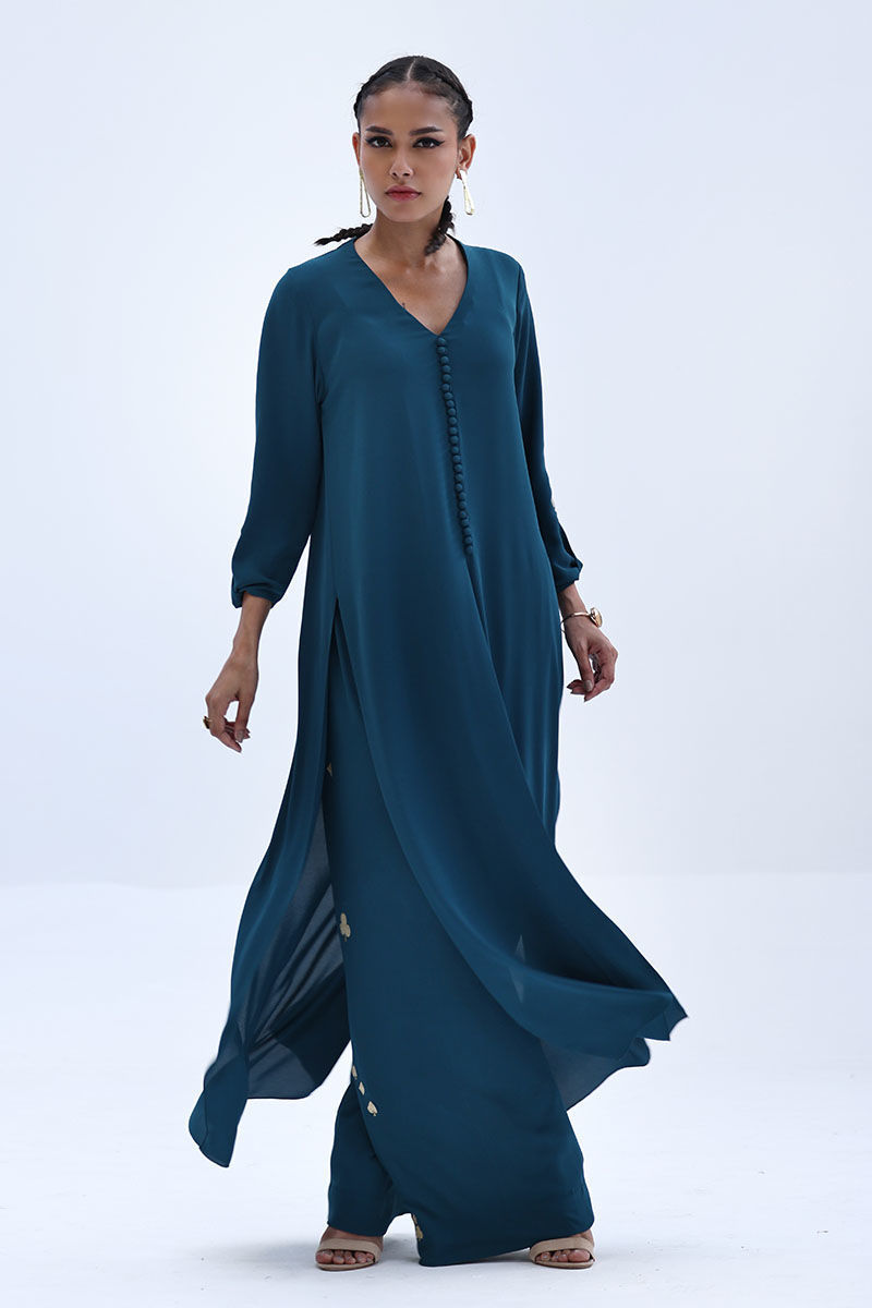 Crafted in airy Deep Teal Georgette, this co-ord set features a relaxed shirt with Resham embroidery on the sleeves, offering a clean yet detailed look. The matching culottes are accented with Resham embroidery along both sides, adding subtle texture and balance. Ideal for everyday elegance and easy, polished styling.