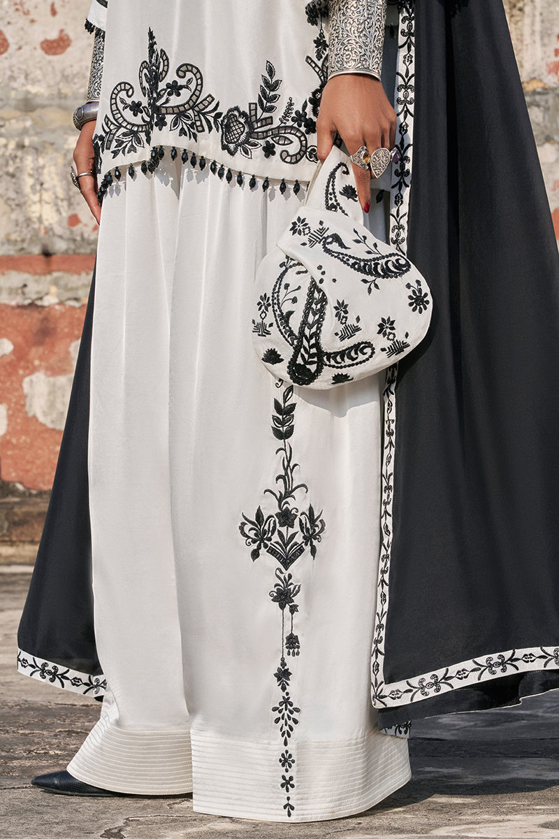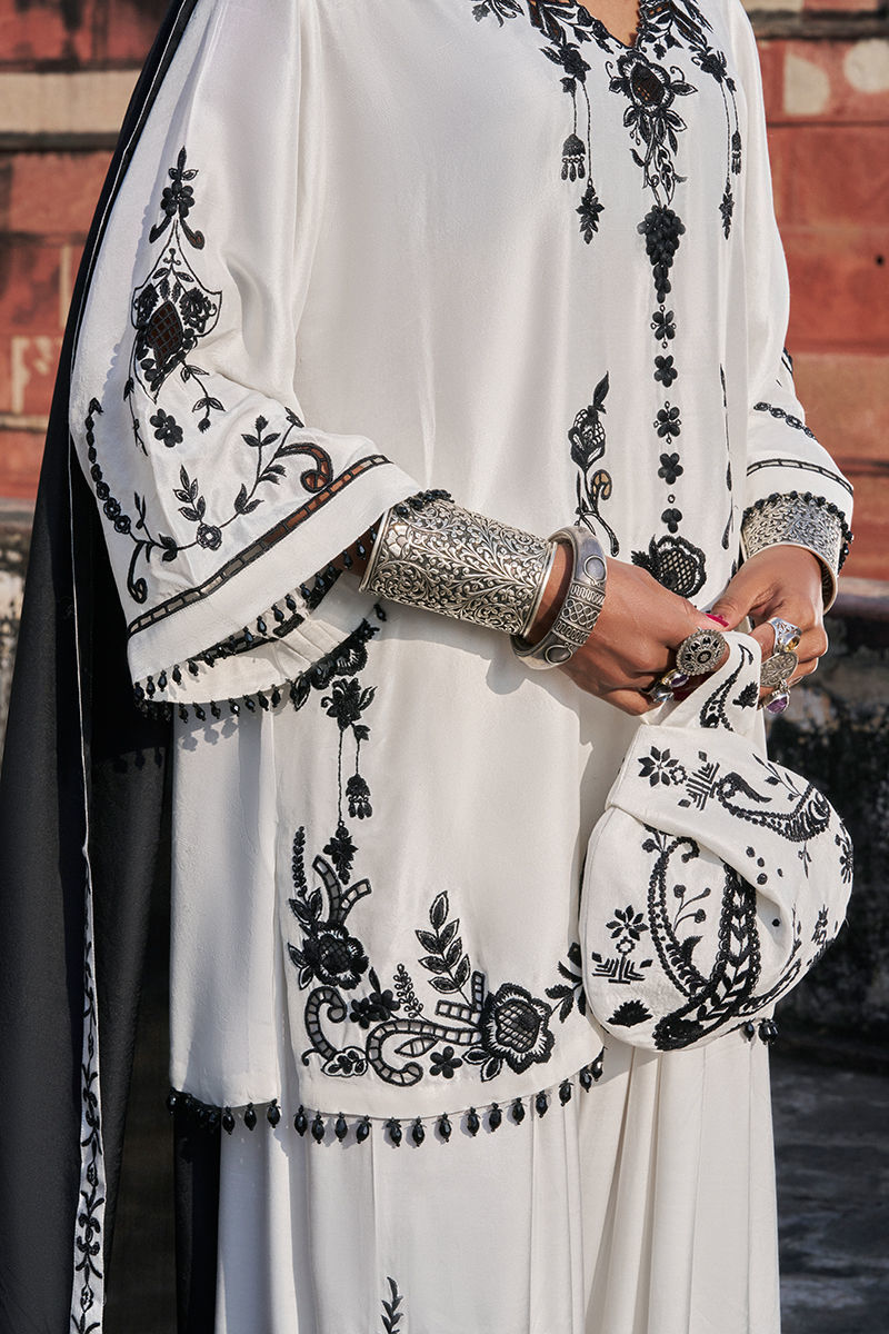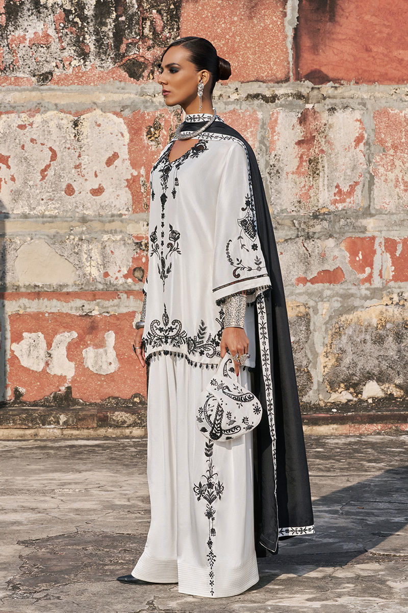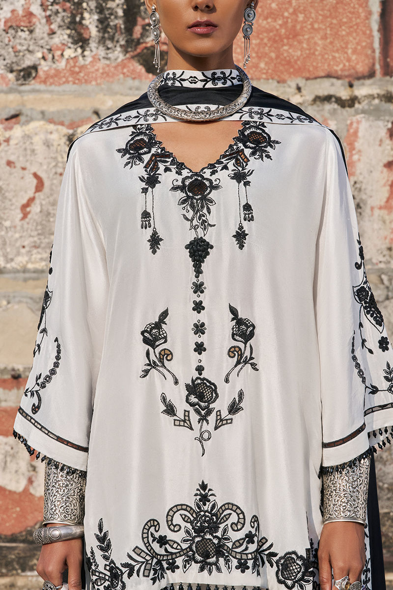 The loose-cut short shirt is crafted from pure raw silk and adorned with intricate black resham and lorix-c zari embroidery, elevated with handmade pati work and delicate cutwork crystal hangings for added dimension. It is paired with cotton charmeuse farshi culottes, detailed with matching black resham and lorix-c zari embroidery, creating a cohesive and elegant silhouette. The look is completed with a medium silk dupatta, finished with a black embroidered border and contrasting white appliqué, adding a striking yet sophisticated finish to the ensemble.