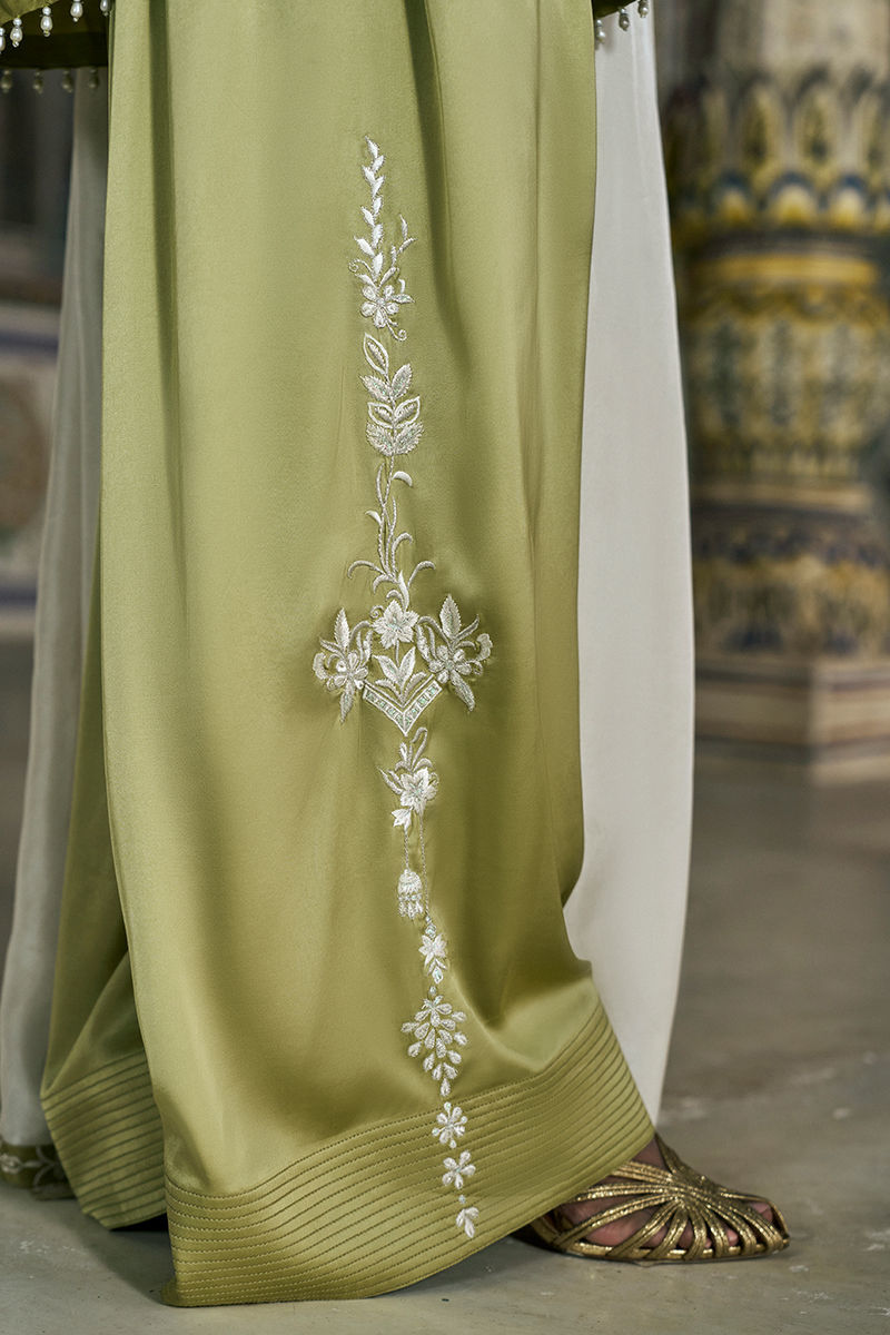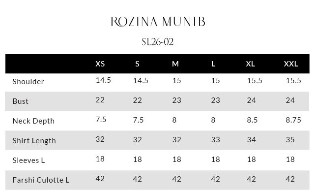 The loose-cut short shirt is crafted from pure raw silk and features intricate ivory resham and lorix-c silver zari embroidery, complemented by delicate handmade pati work and cutwork pearl hangings for a refined, artisanal finish. It is paired with cotton charmeuse farshi culottes, adorned with matching ivory resham and lorix-c zari embroidery, creating a harmonious and elegant silhouette. The ensemble is completed with a medium silk dupatta, detailed with an ivory embroidered border and delicate sugar cane appliqué, adding a soft, sophisticated touch to the look.