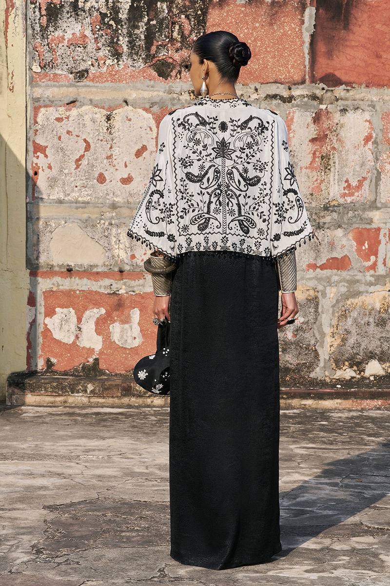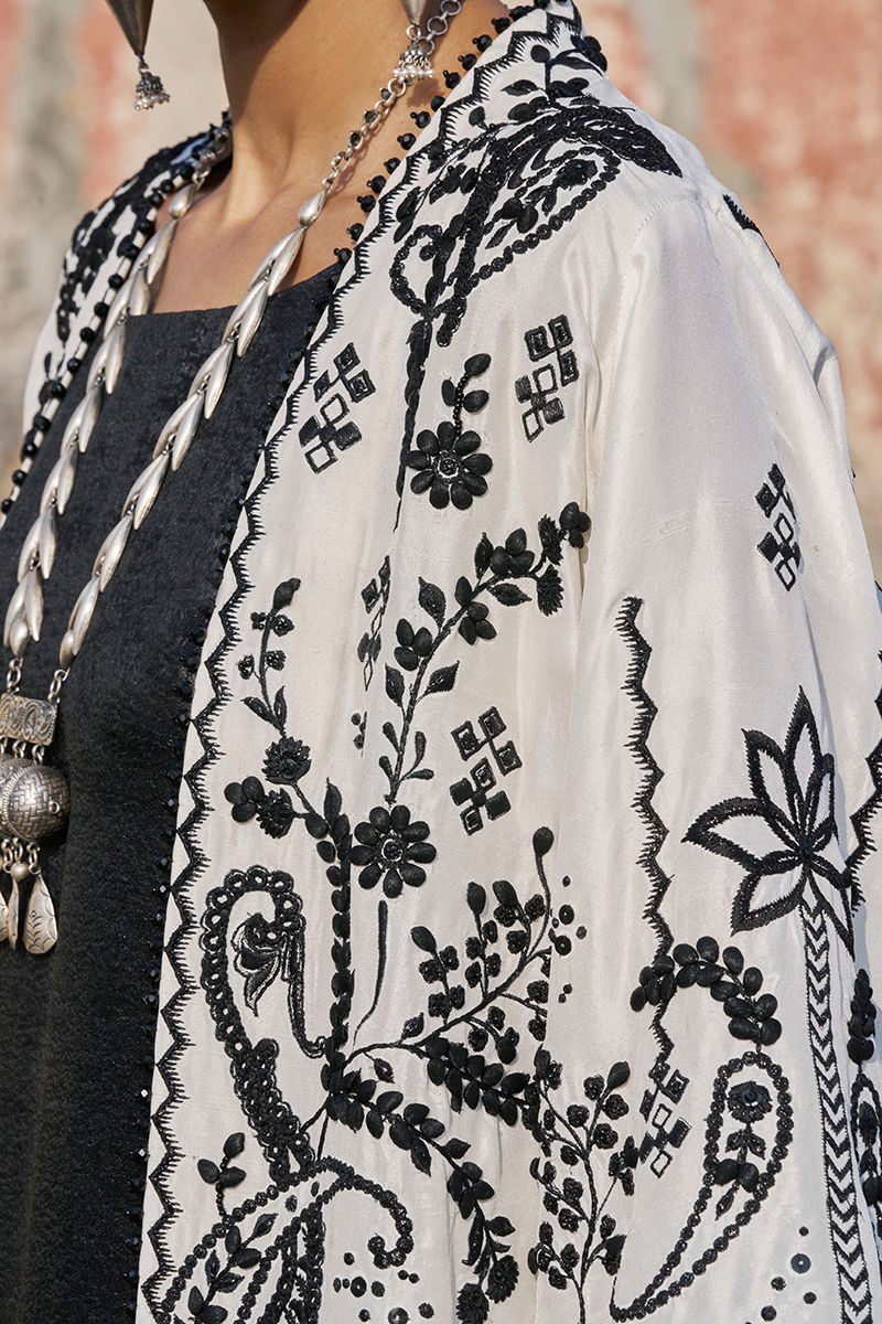 The milky white jacket is crafted from pure raw silk and features intricate black resham and lorix-c zari embroidery, enriched with sequins, cutdana, stones, pearls (moti), delicate handmade pati work, and sparkling crystal hangings for a statement artisanal finish. Paired with a black kaftan in sachi foil, adorned with ivory resham and lorix-c zari embroidery, the ensemble exudes effortless elegance, blending contemporary luxury with traditional craftsmanship.