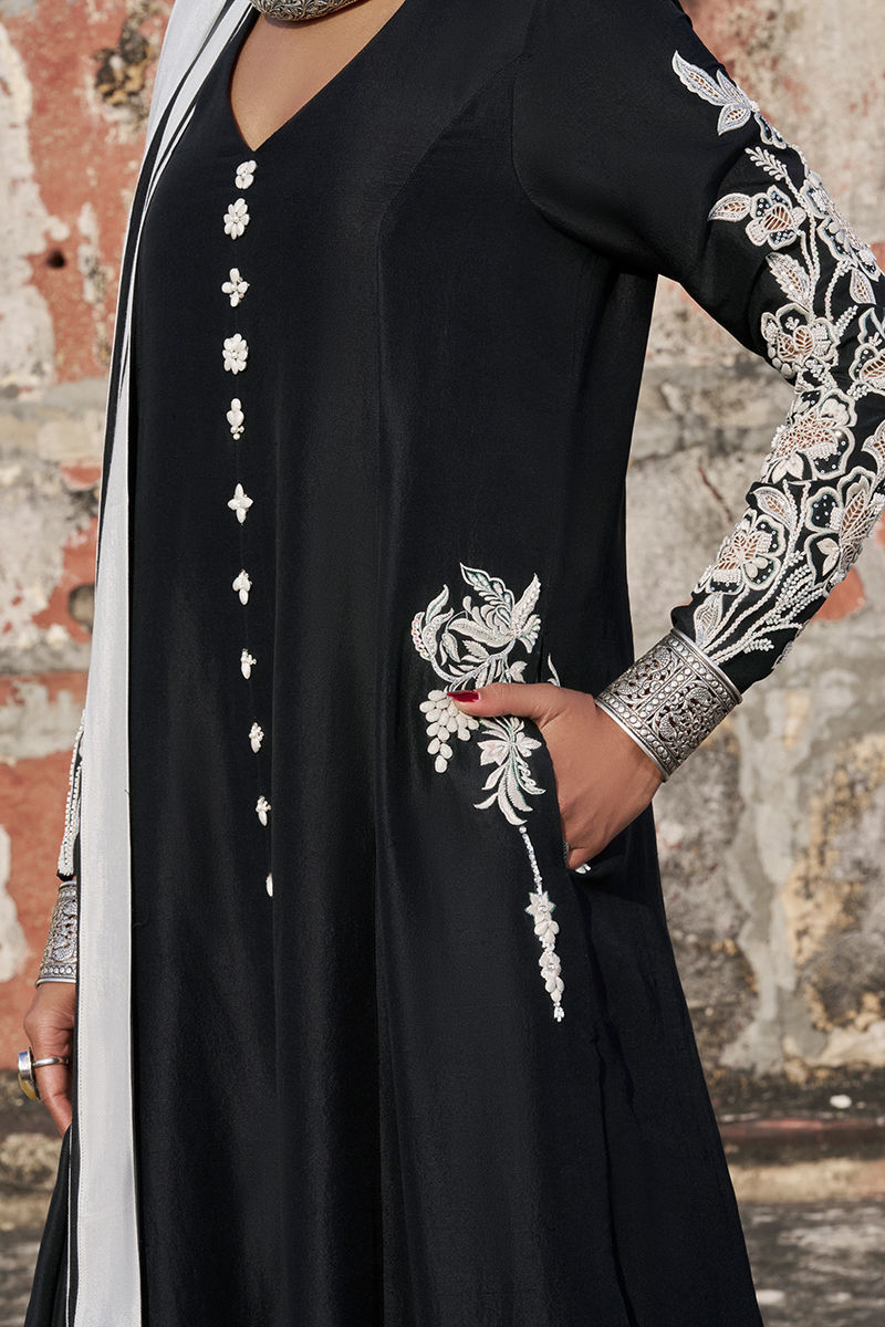 The prince-panel, front-open shirt is crafted from pure raw silk and features functional pockets, adorned with intricate black and milky white resham and lorix embroidery. Enhanced with silver and white zardozi work, sequins, cutdana, stones, pearls, delicate handmade pati work, and refined cutwork, the shirt showcases exceptional artisanal craftsmanship. It is paired with fluid cotton charmeuse culottes for effortless elegance and completed with a medium silk dupatta, creating a sophisticated and statement-making ensemble perfect for festive and evening occasions.