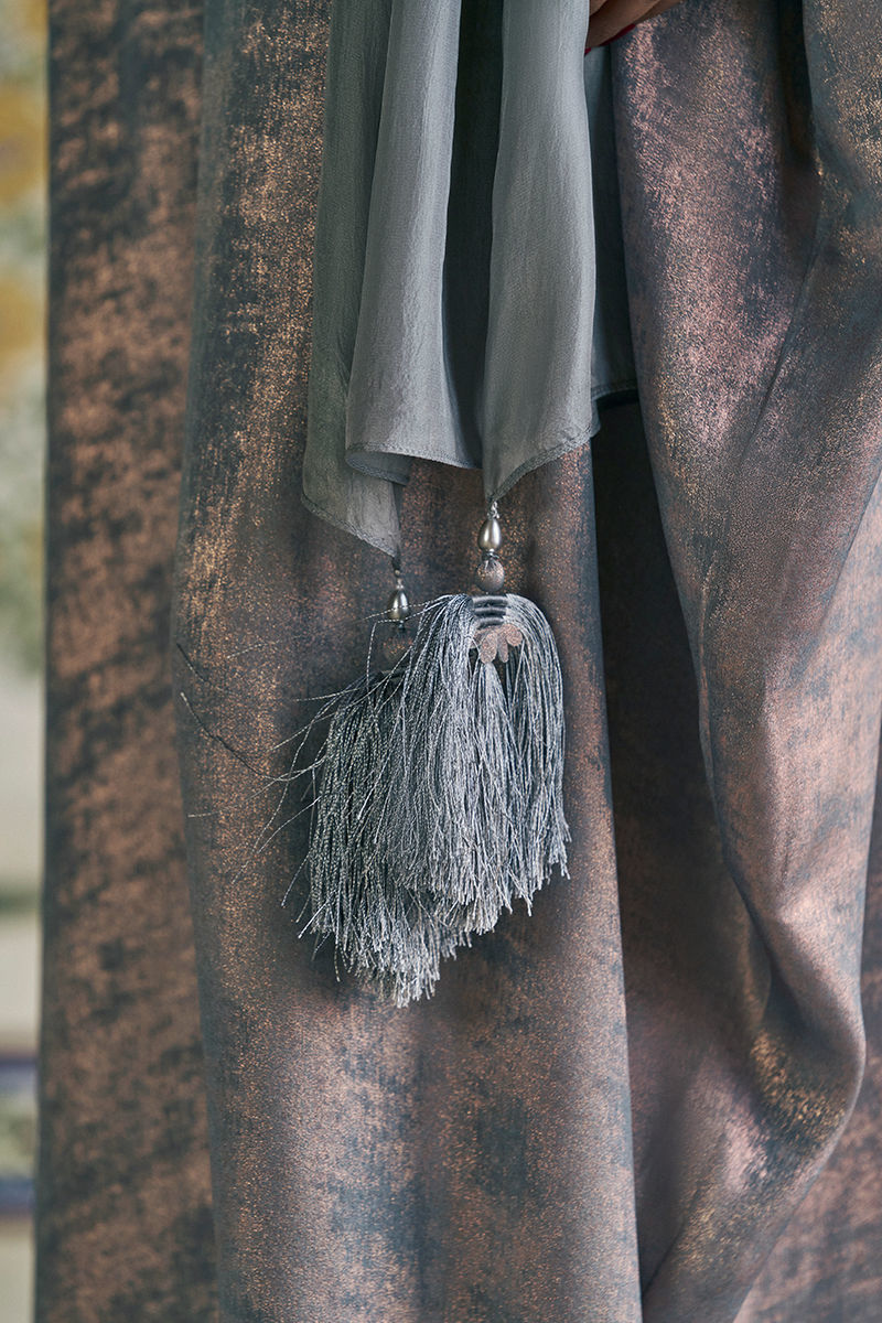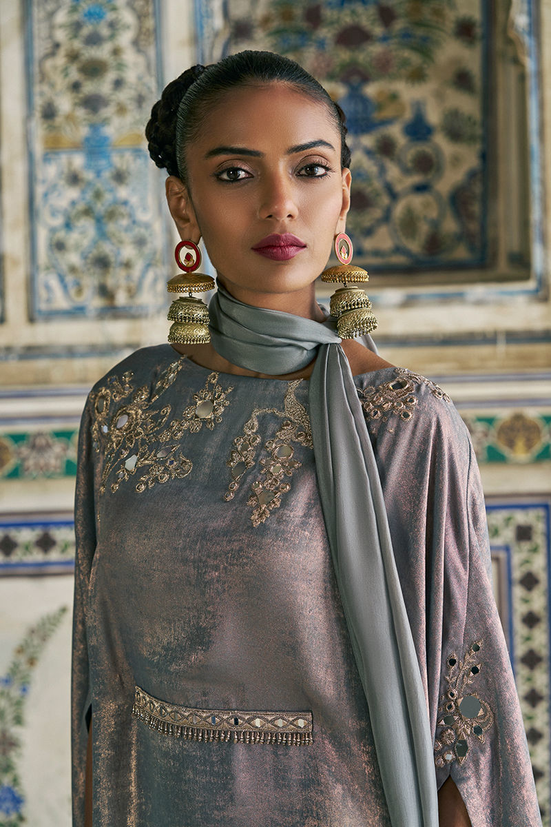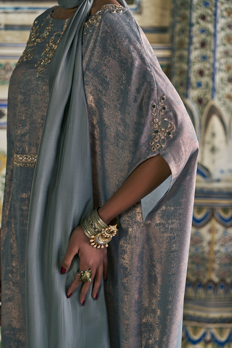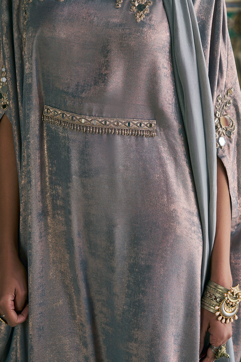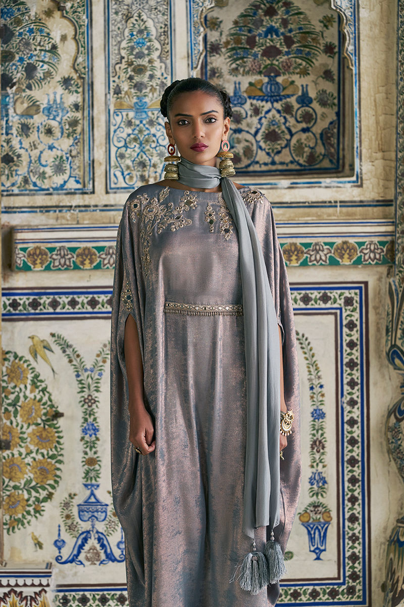 The zinc-toned kaftan is crafted from luxurious sachi silk and features intricate zari and lorix embroidery, highlighted with delicate mirror work for a subtle, luminous effect. Designed with an effortless, flowing silhouette, it is paired with a medium silk stole finished with handmade tassel details, adding an artisanal and elegant touch to the ensemble.