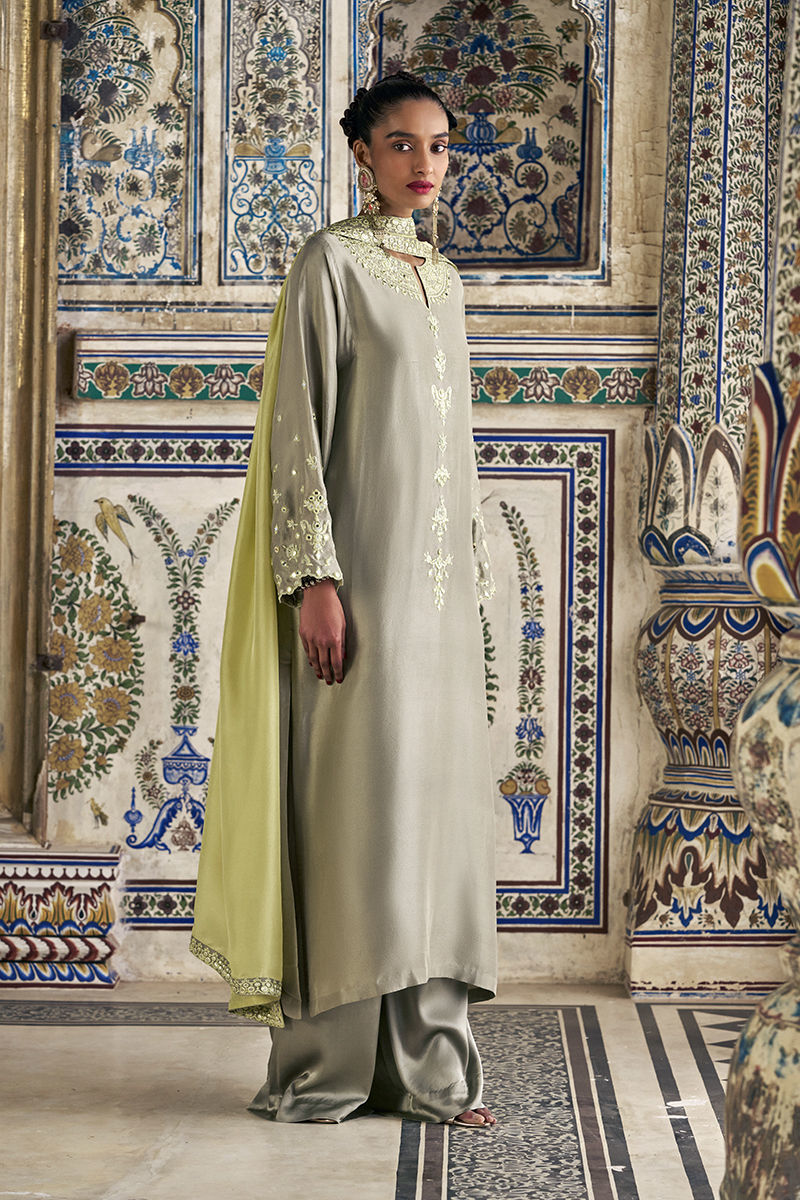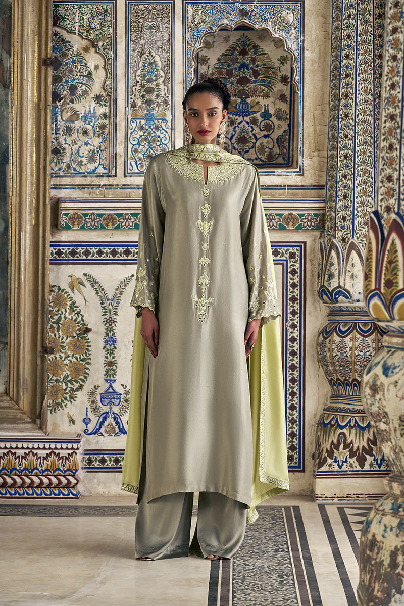 The loose-cut long shirt in smoke green is crafted from pure raw silk and features functional pockets, adorned with intricate lime resham and lorix embroidery, enhanced with delicate mirror work for a subtle, luminous finish. It is paired with fluid cotton charmeuse culottes for effortless elegance and completed with a medium silk lime dupatta, detailed with lime resham, silver zari embroidery, and appliqué borders, creating a graceful and elevated ensemble perfect for festive and evening occasions.