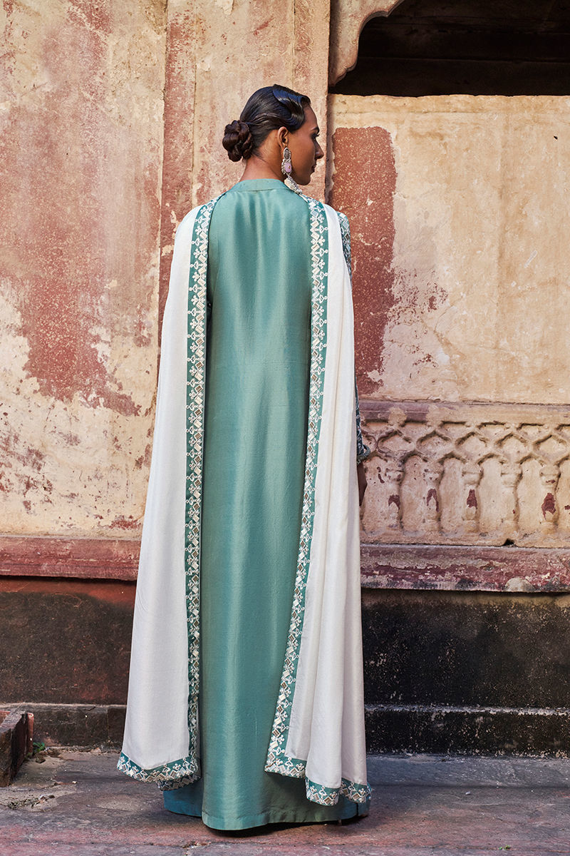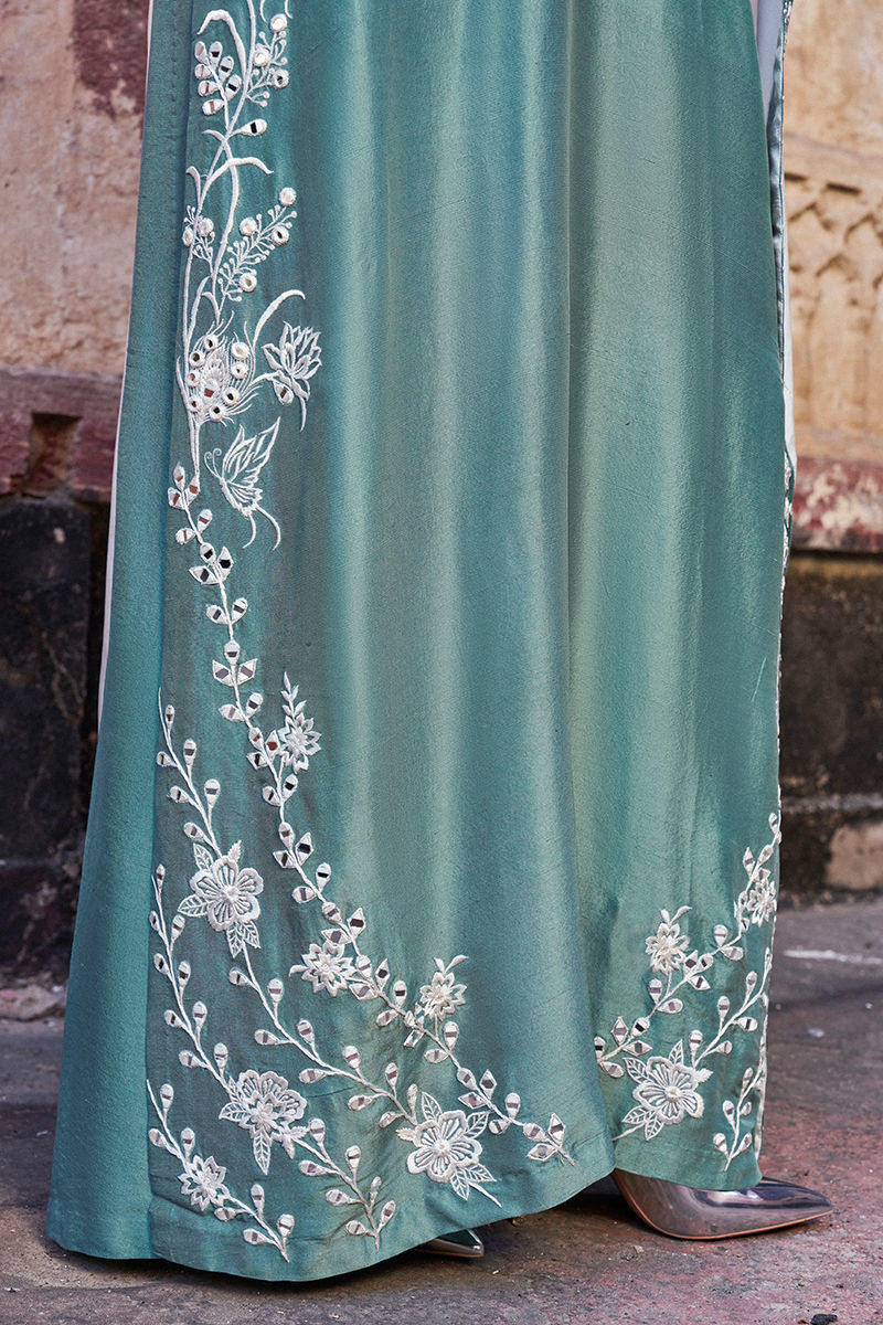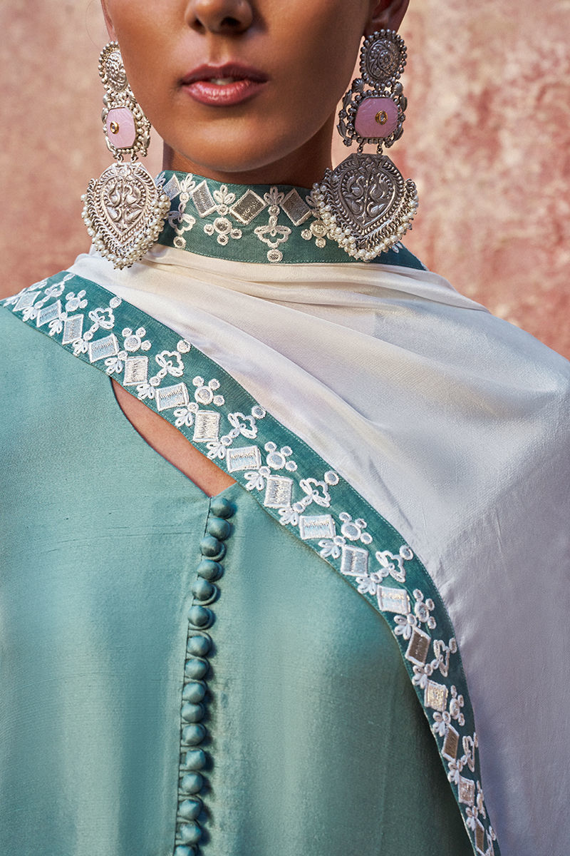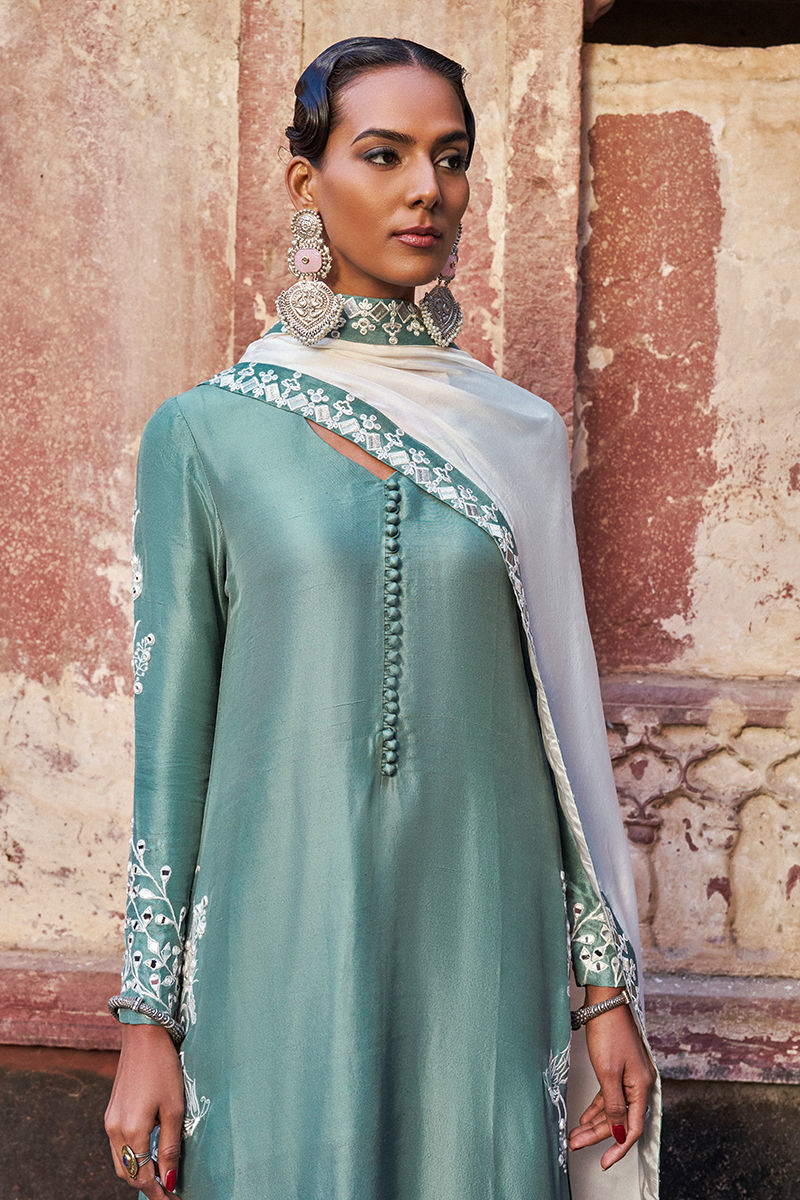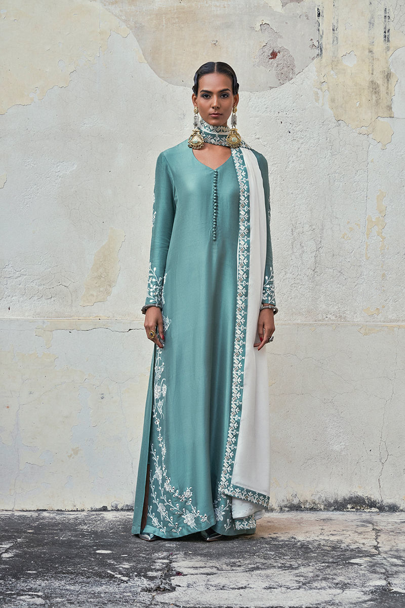 The long shirt with high slits is crafted from oil blue pure raw silk and adorned with intricate ivory resham embroidery and delicate mirror work, creating a refined and artisanal finish. It is paired with fluid cotton charmeuse pants for effortless elegance, and completed with a medium silk ivory dupatta, detailed with ivory resham, silver zari embroidery, and appliqué borders, adding a graceful and elevated touch to the ensemble—perfect for festive and evening occasions.