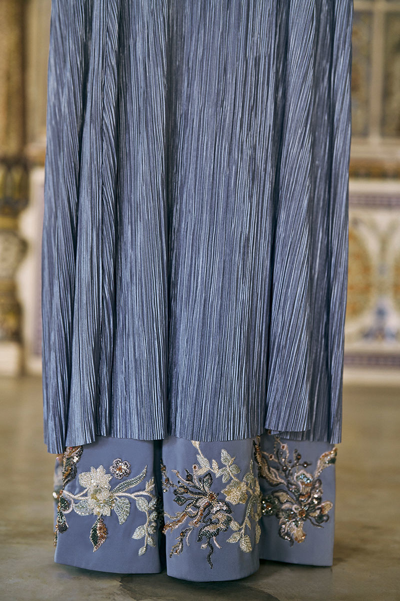 The Blue Fog high-low poncho is crafted from pleated silk and adorned with intricate colored resham, zari, and zardozi embroidery, enhanced with cutdana, sequins, crystals, and delicate 3D flowers layered over skin net for a sophisticated, dimensional effect. It is paired with cotton charmeuse culottes, beautifully detailed with matching colored resham, zari, and zardozi embroidery, as well as cutdana, sequins, crystals, and 3D floral accents, creating a cohesive and statement-making ensemble perfect for festive occasions and elevated evening wear.