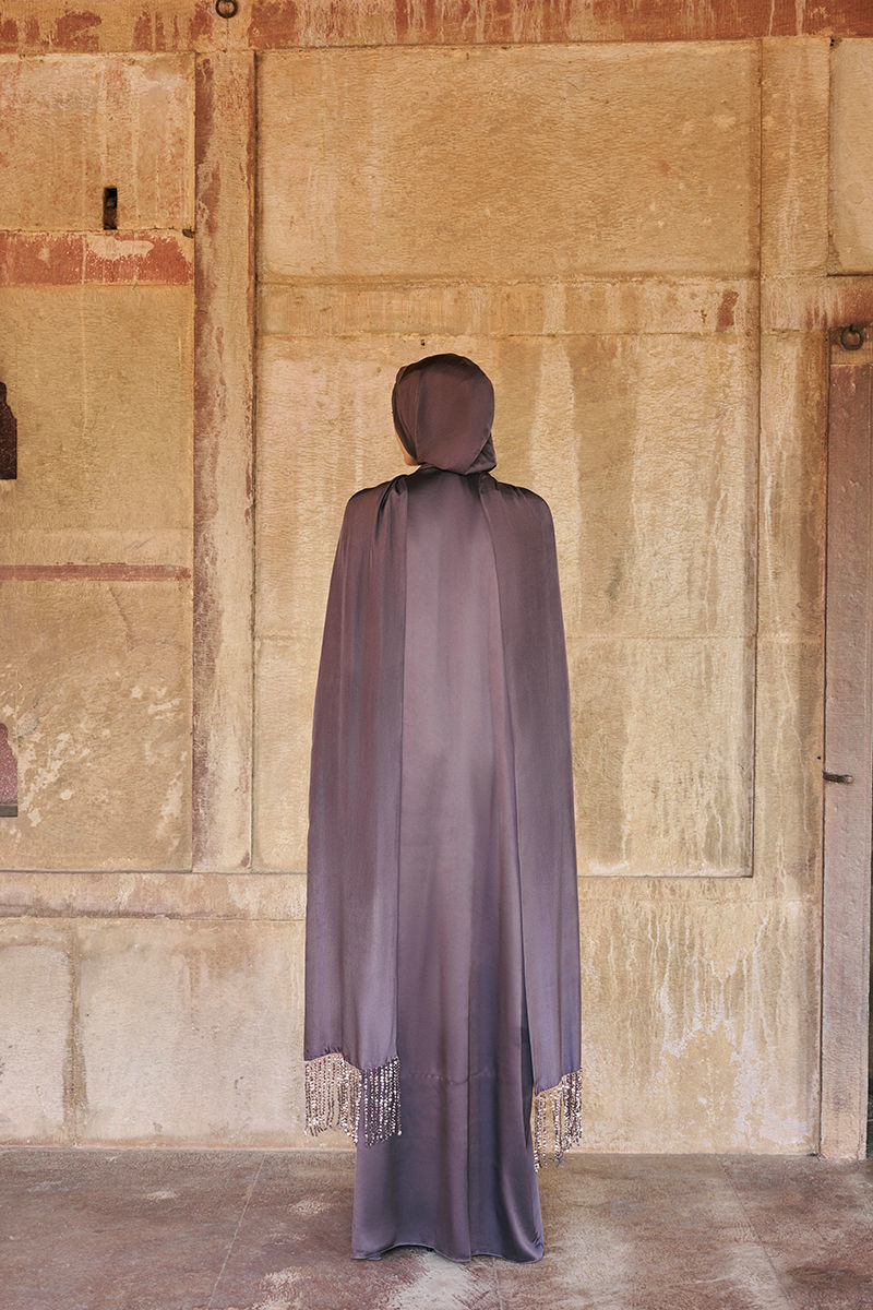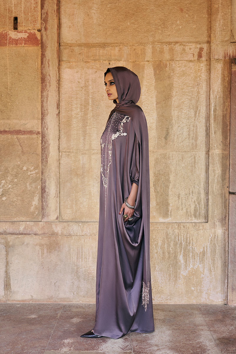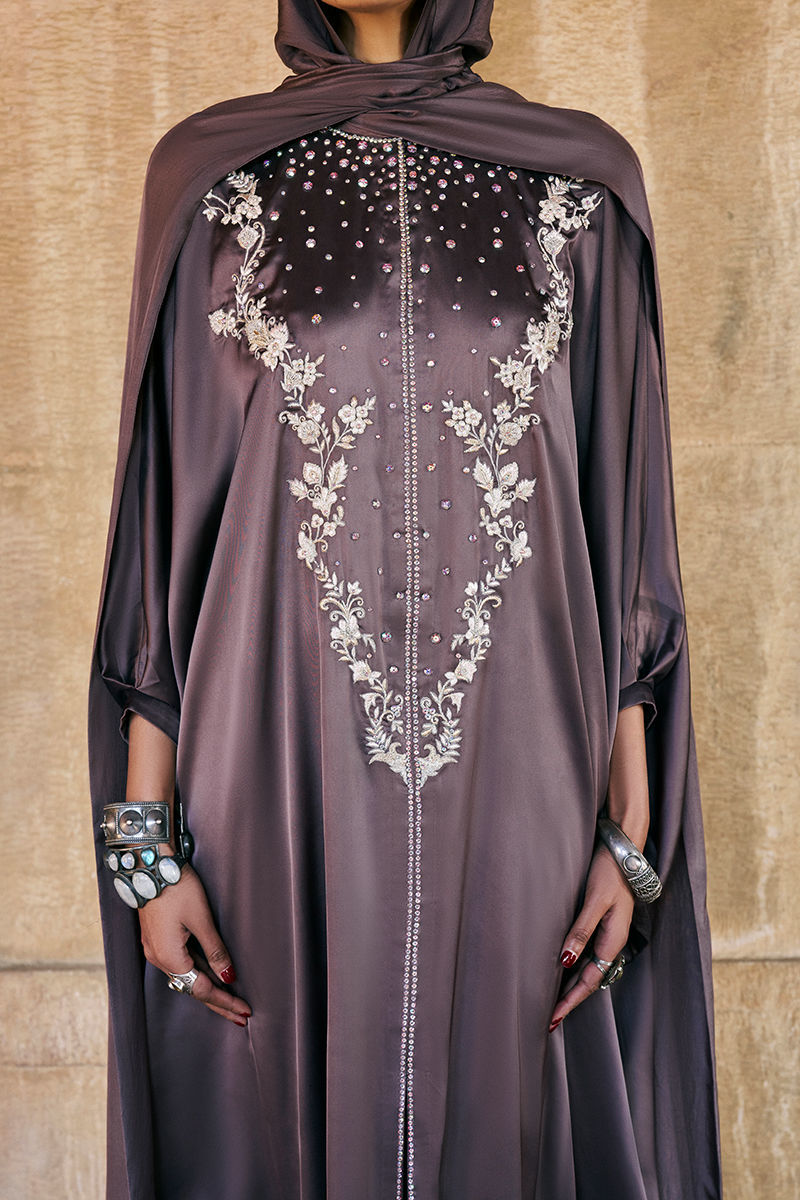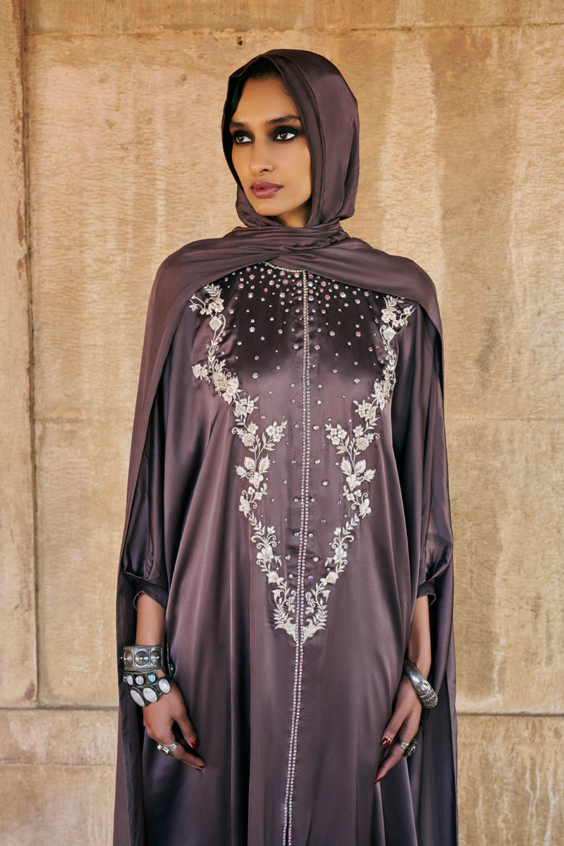 The Pepper Corn kaftan with an attached hoodie is adorned with intricate stonework in varied sizes and shapes, beautifully complemented by silver and golden zari, lorix, and resham embroidery, creating a rich and artisanal finish. It is paired with fluid cotton charmeuse pants for effortless elegance, making the ensemble both contemporary and statement-making. A matching stole completes the look, adding a graceful and elevated touch.