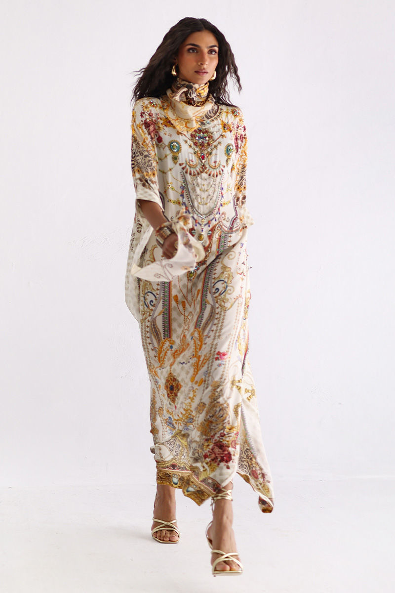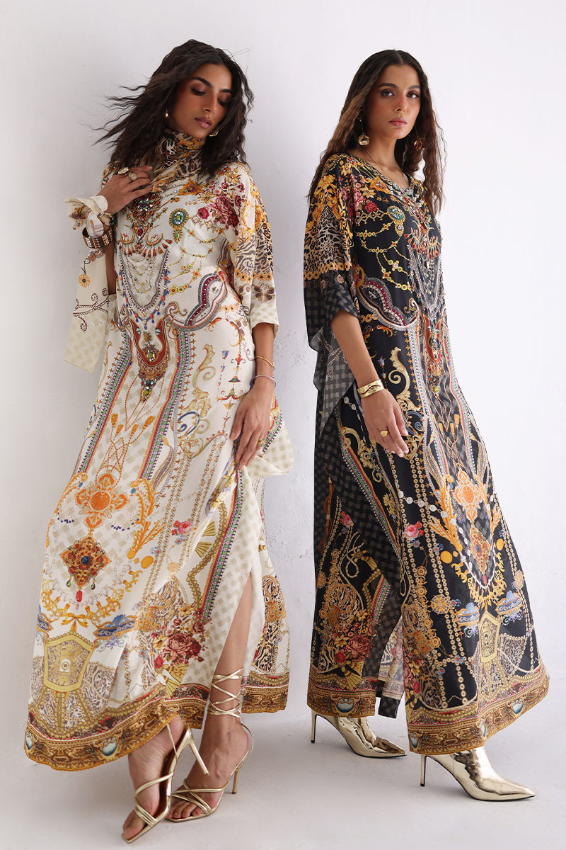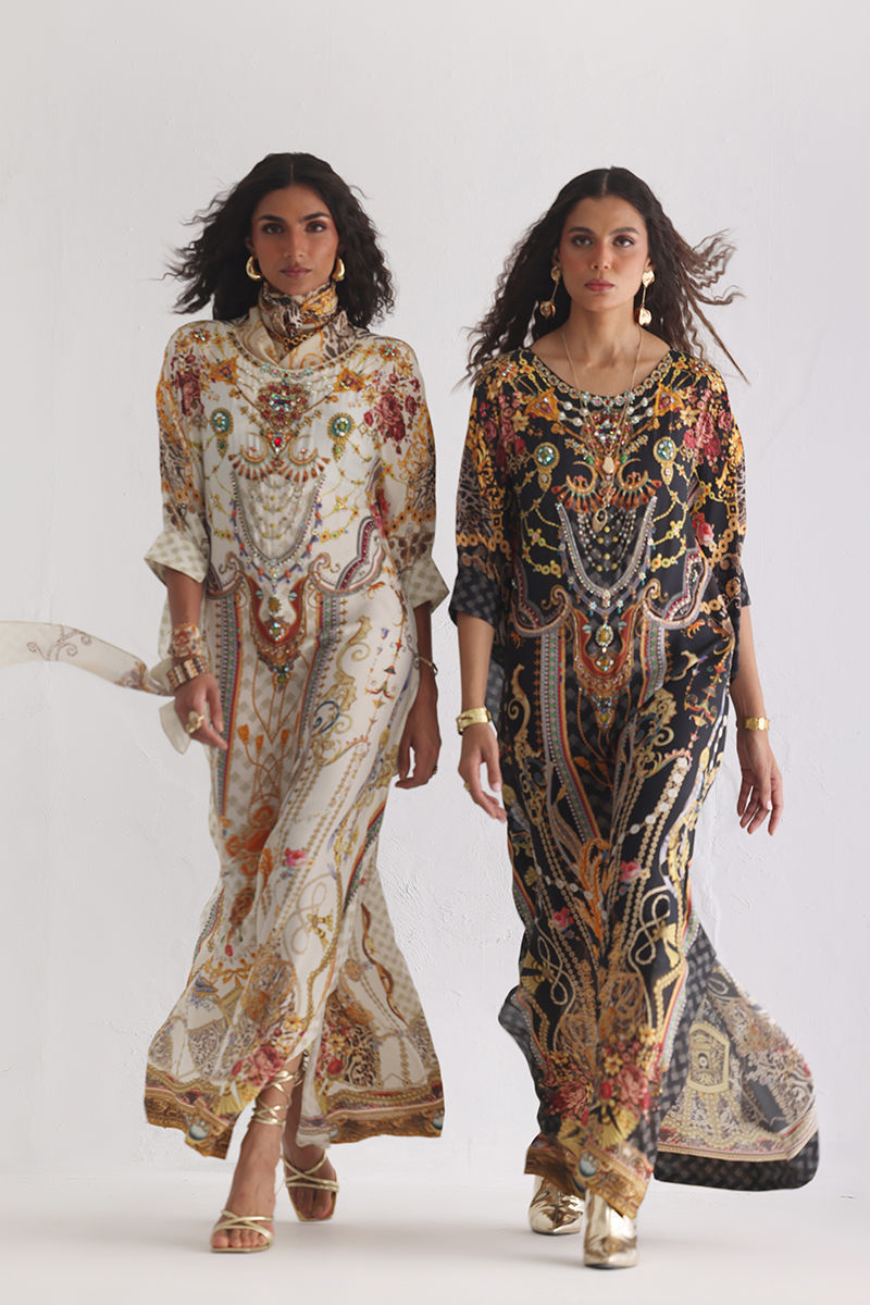 This statement kaftan features a striking digital print, elevated with intricate hand embellishments. Detailed with imported colored stones, textured stones, cutdana, metals, crystals, sequins, and delicate 3D flowers, the design reflects exceptional craftsmanship and depth. A perfect blend of modern elegance and artisanal detailing, this kaftan is ideal for festive evenings and elevated celebrations.
