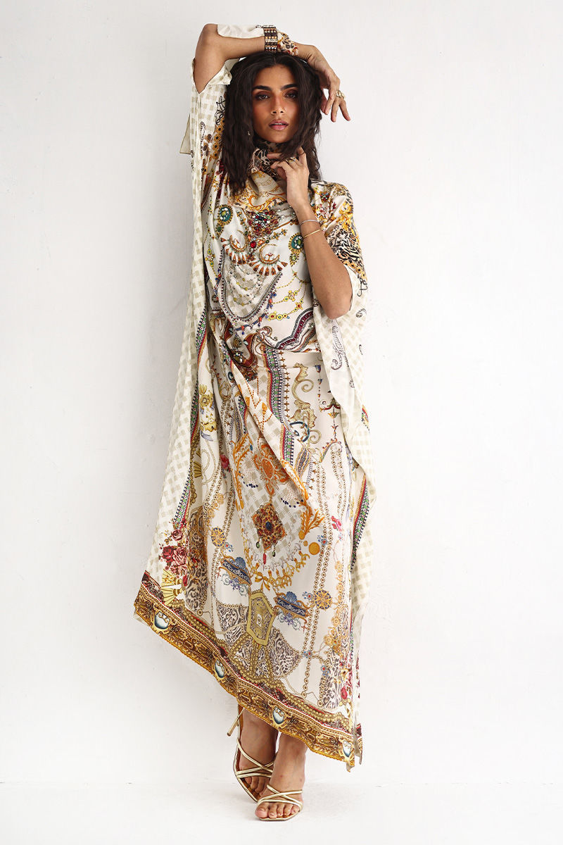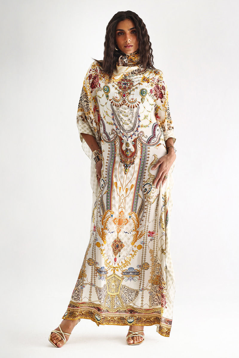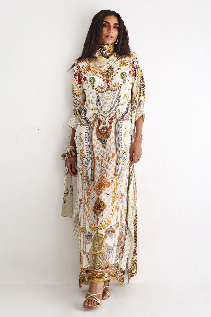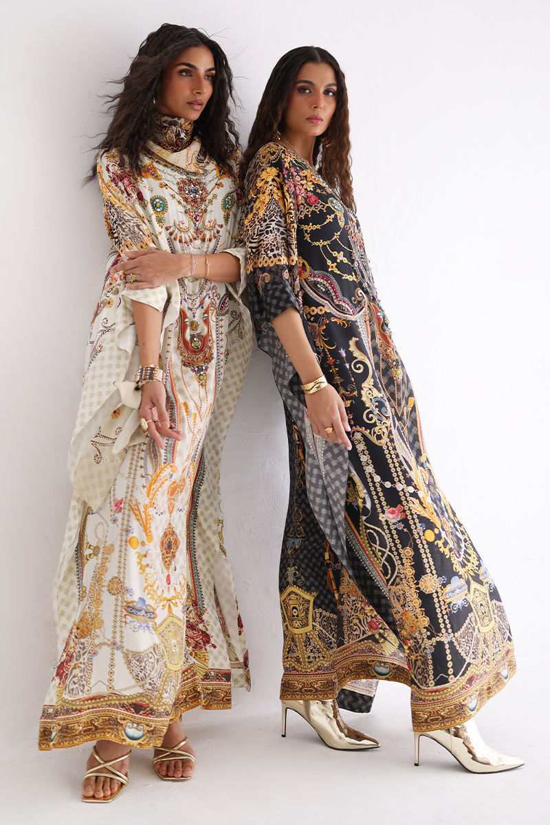 This statement kaftan features a striking digital print, elevated with intricate hand embellishments. Detailed with imported colored stones, textured stones, cutdana, metals, crystals, sequins, and delicate 3D flowers, the design reflects exceptional craftsmanship and depth. A perfect blend of modern elegance and artisanal detailing, this kaftan is ideal for festive evenings and elevated celebrations.