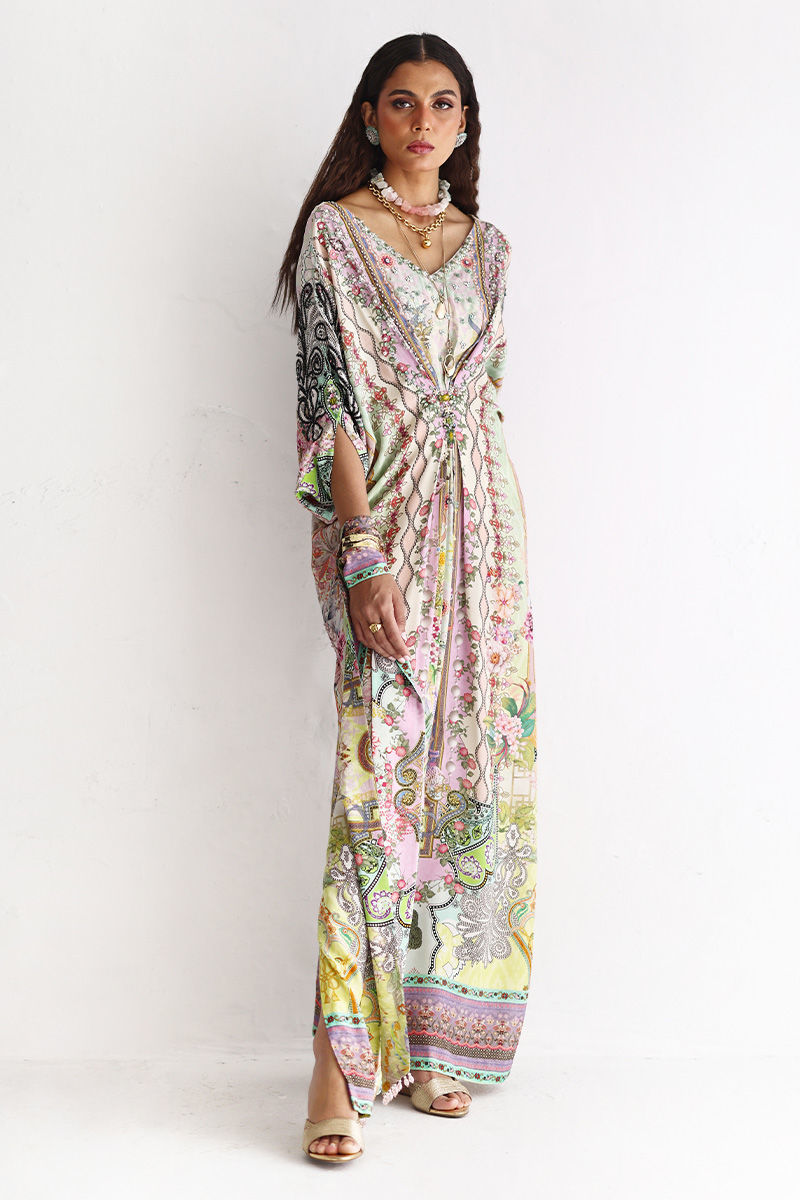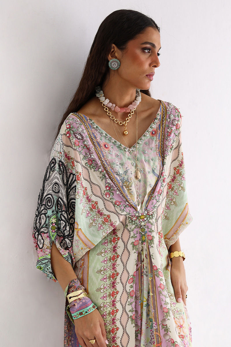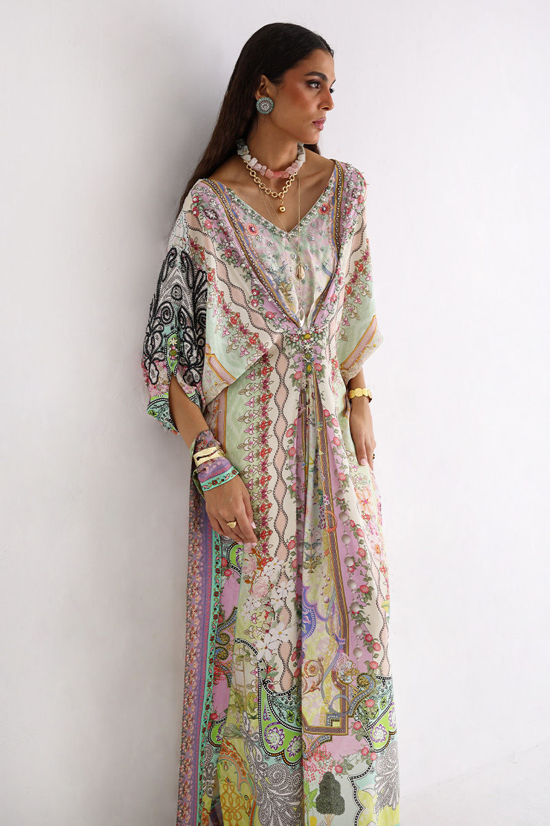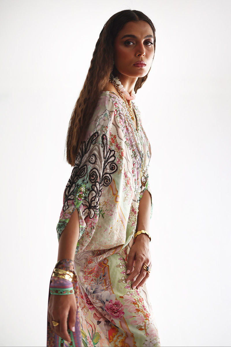 A Pure Crepe silhouette with a contemporary digital print, elevated through meticulous hand embellishment. Embellished with crystals, sequins, metals, cutdana, textured stones, colored stones, and 3D flowers. Styled in Lily Green, exuding sophistication and statement luxury.
