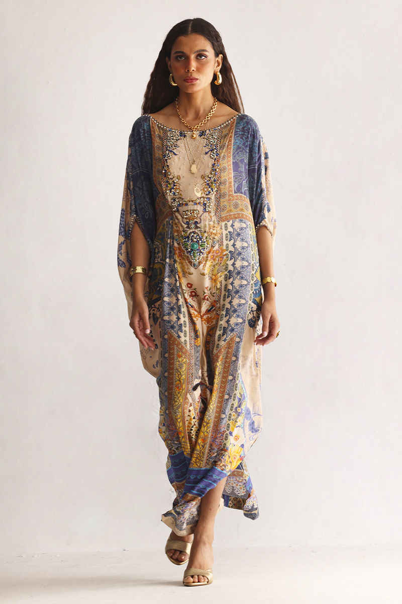 This Pure Crepe kaftan features an artistic digital print enhanced with exquisite hand embellishment. Adorned with imported colored stones, textured stones, metals, crystals, sequins, cutdana, and 3D floral accents, rendered in an elegant Macadamia shade.