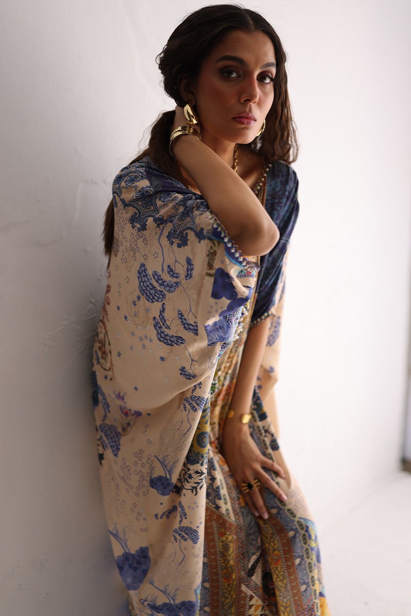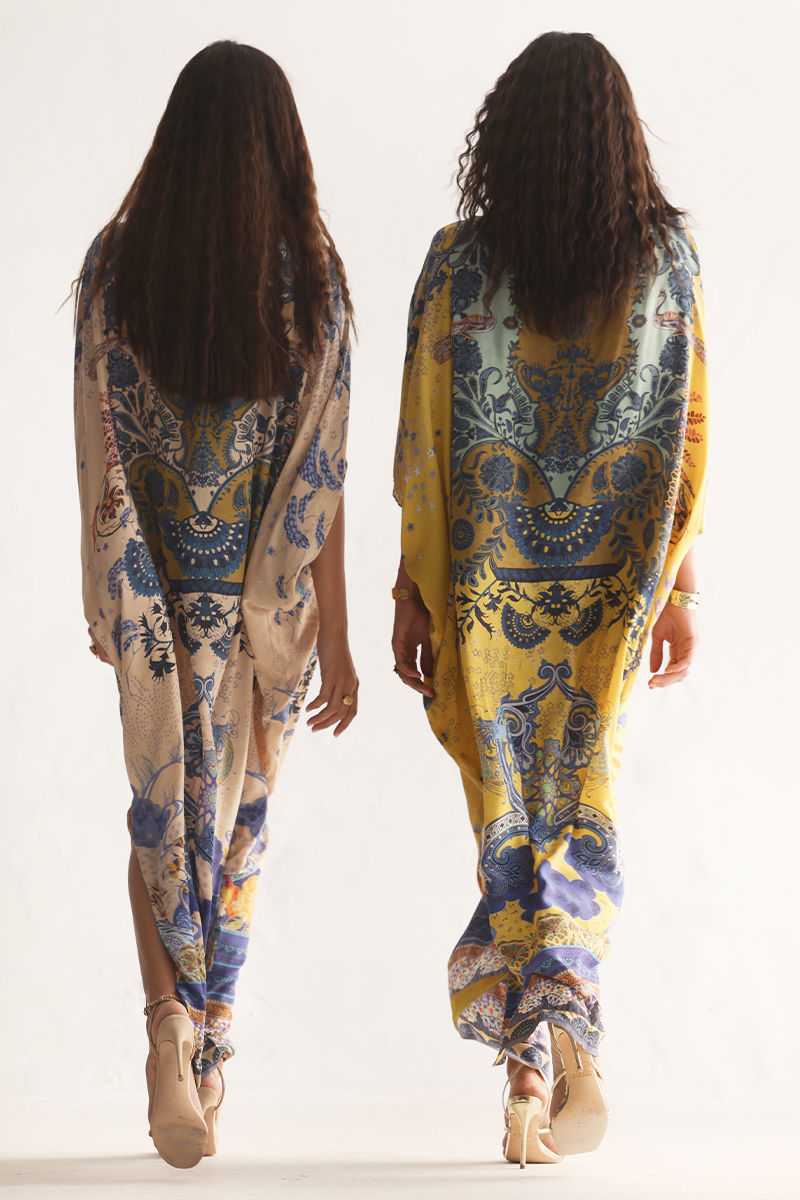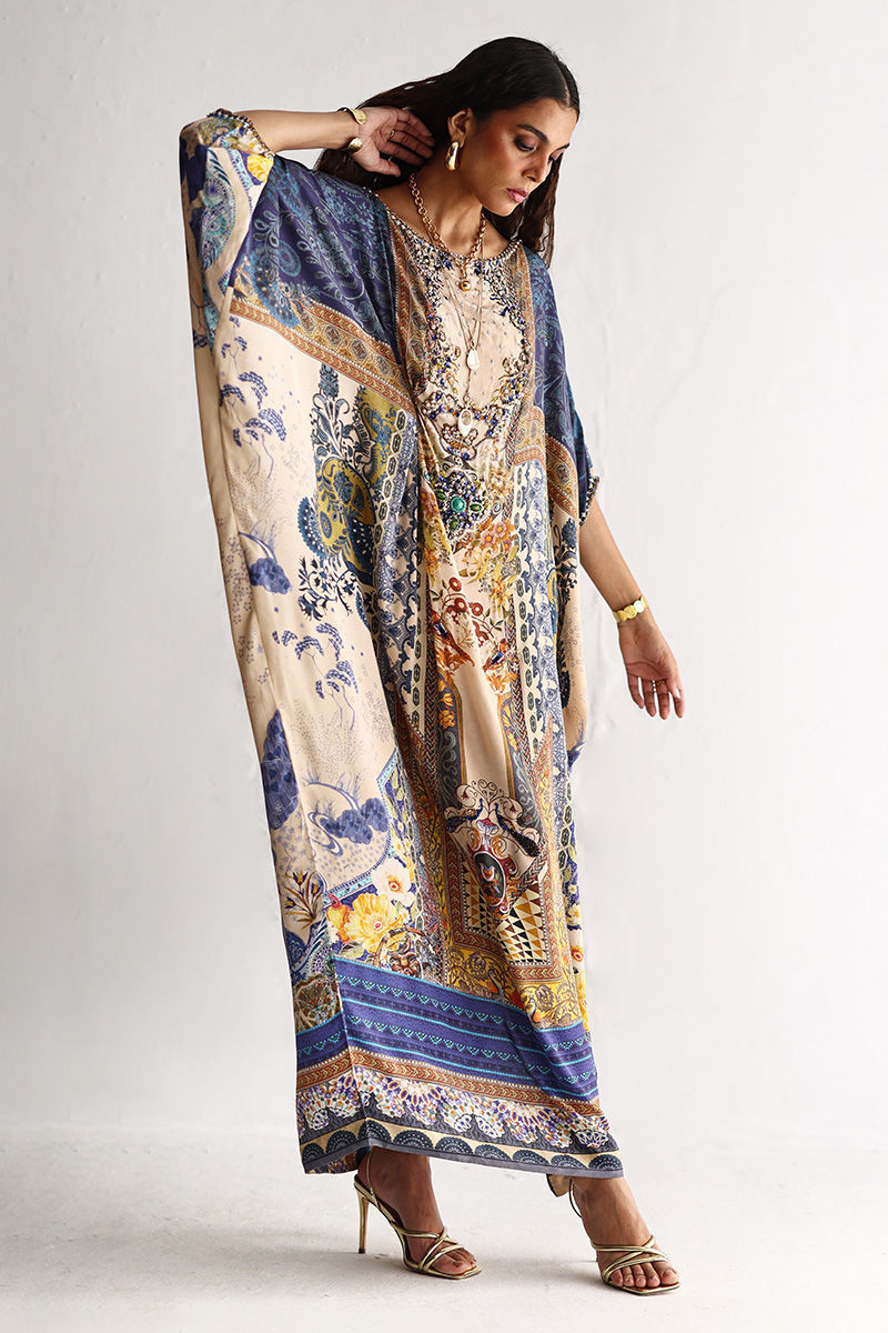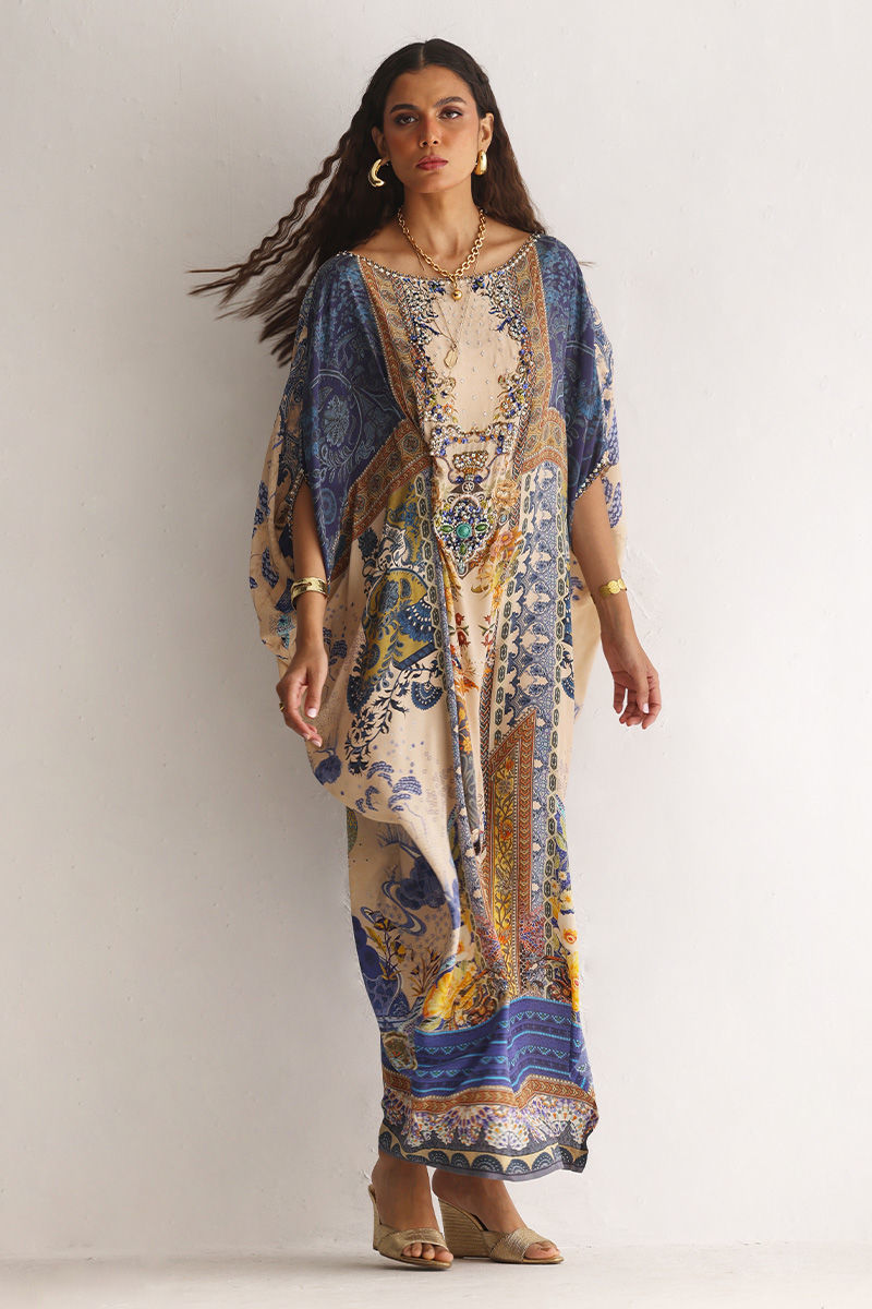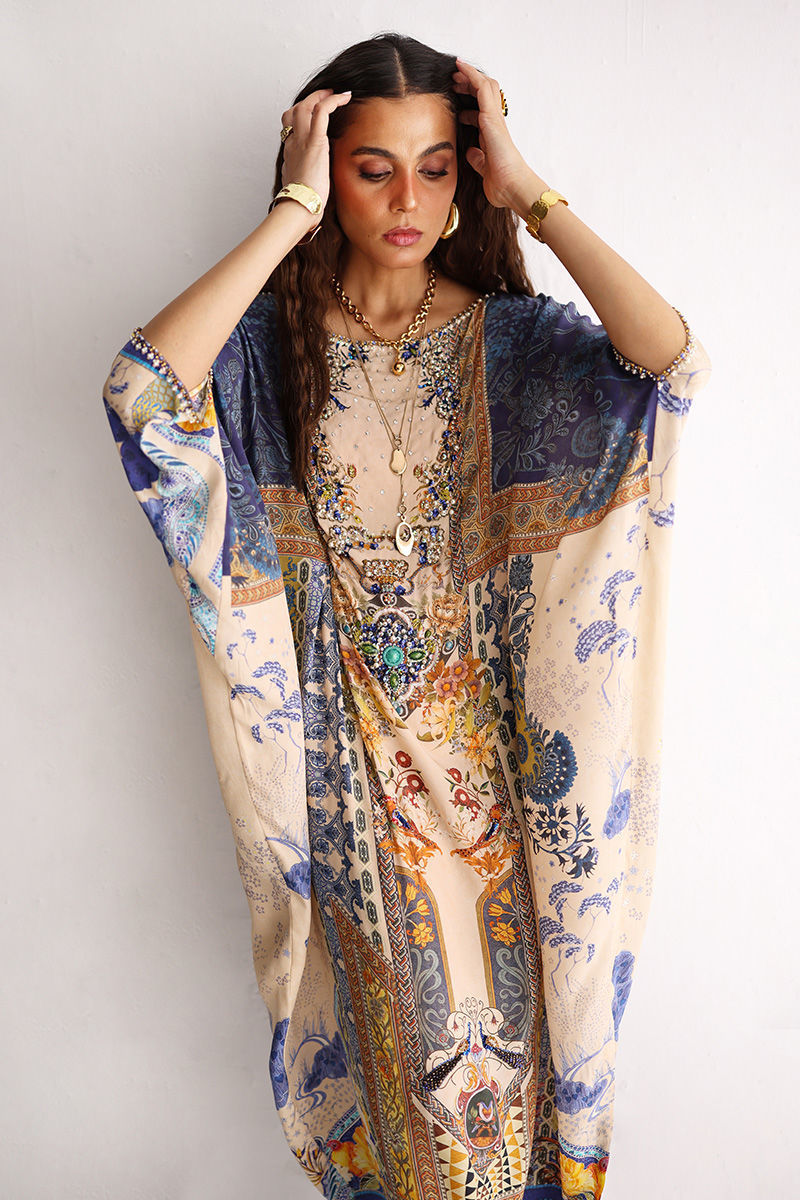 This kaftan features a striking digital print, elevated with intricate hand embellishments. Imported colored stones, textured stones, cutdana, sequins, luminous pearls, and crystals come together to add depth and refined sparkle. Designed for effortless elegance, this statement kaftan is perfect for festive occasions and evening wear.