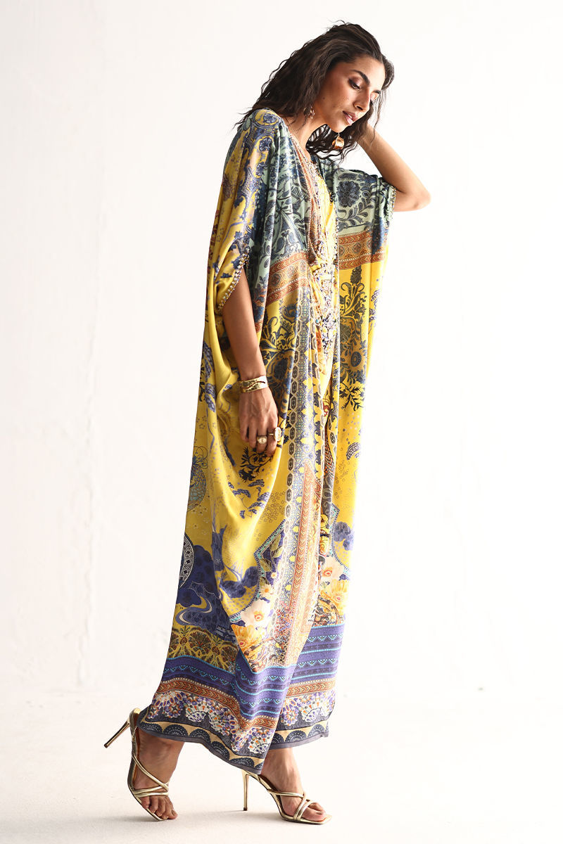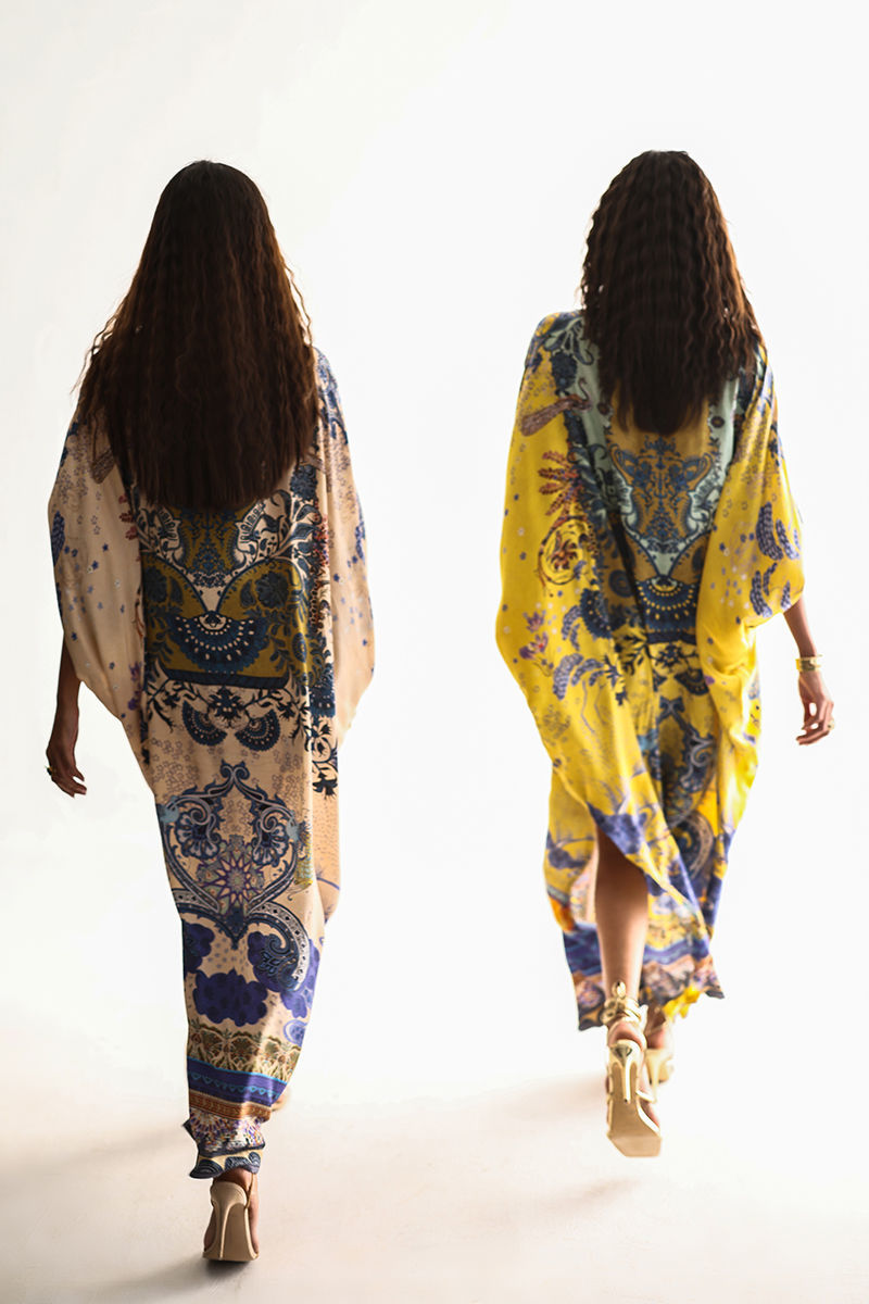 A contemporary Pure Crepe kaftan with a statement digital print, elevated through intricate embellishment. Detailed with crystals, sequins, metals, textured stones, colored stones, cutdana, and sculpted 3D flowers in a refined Cream Gold Hue.