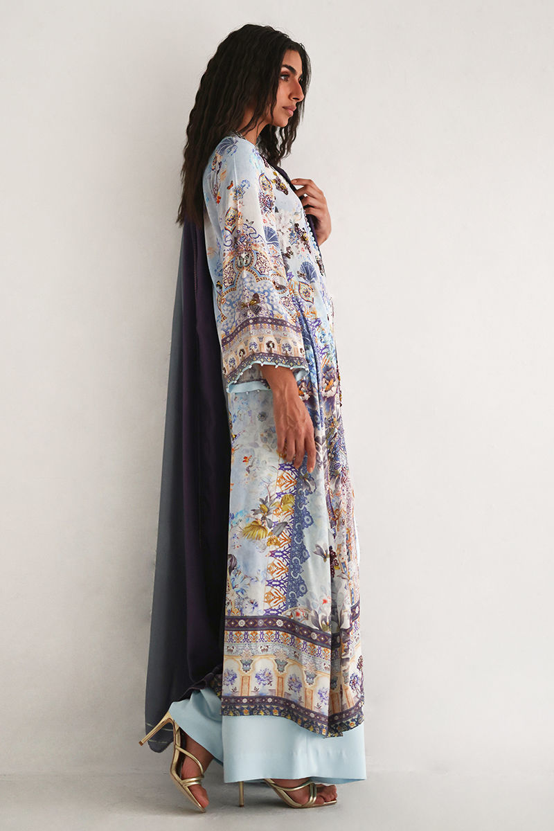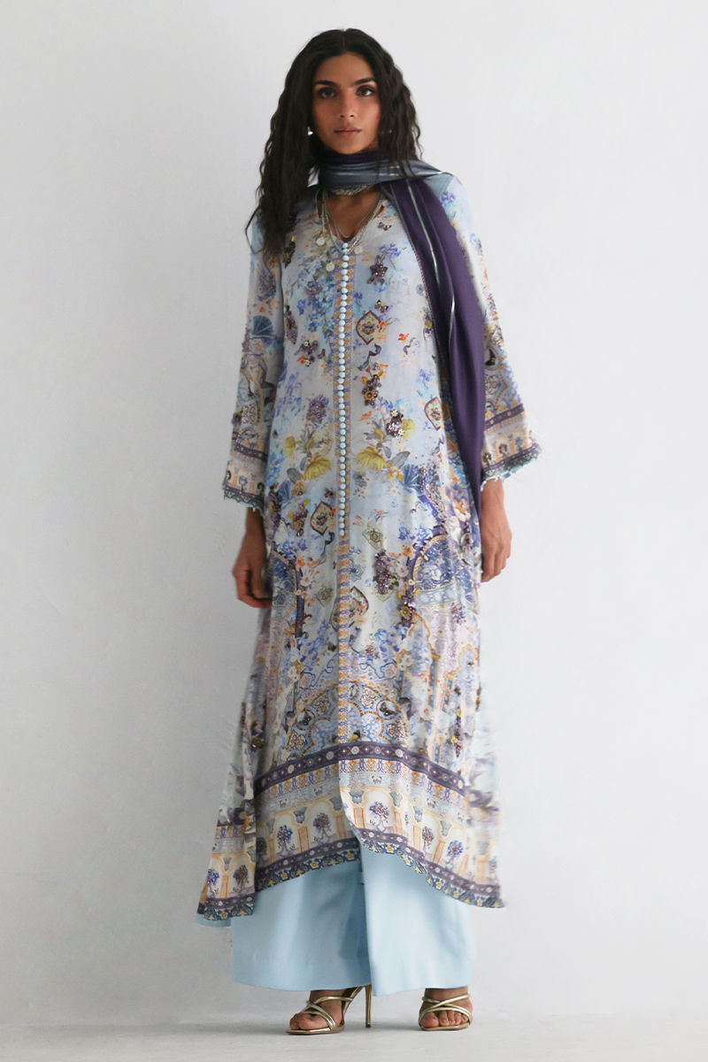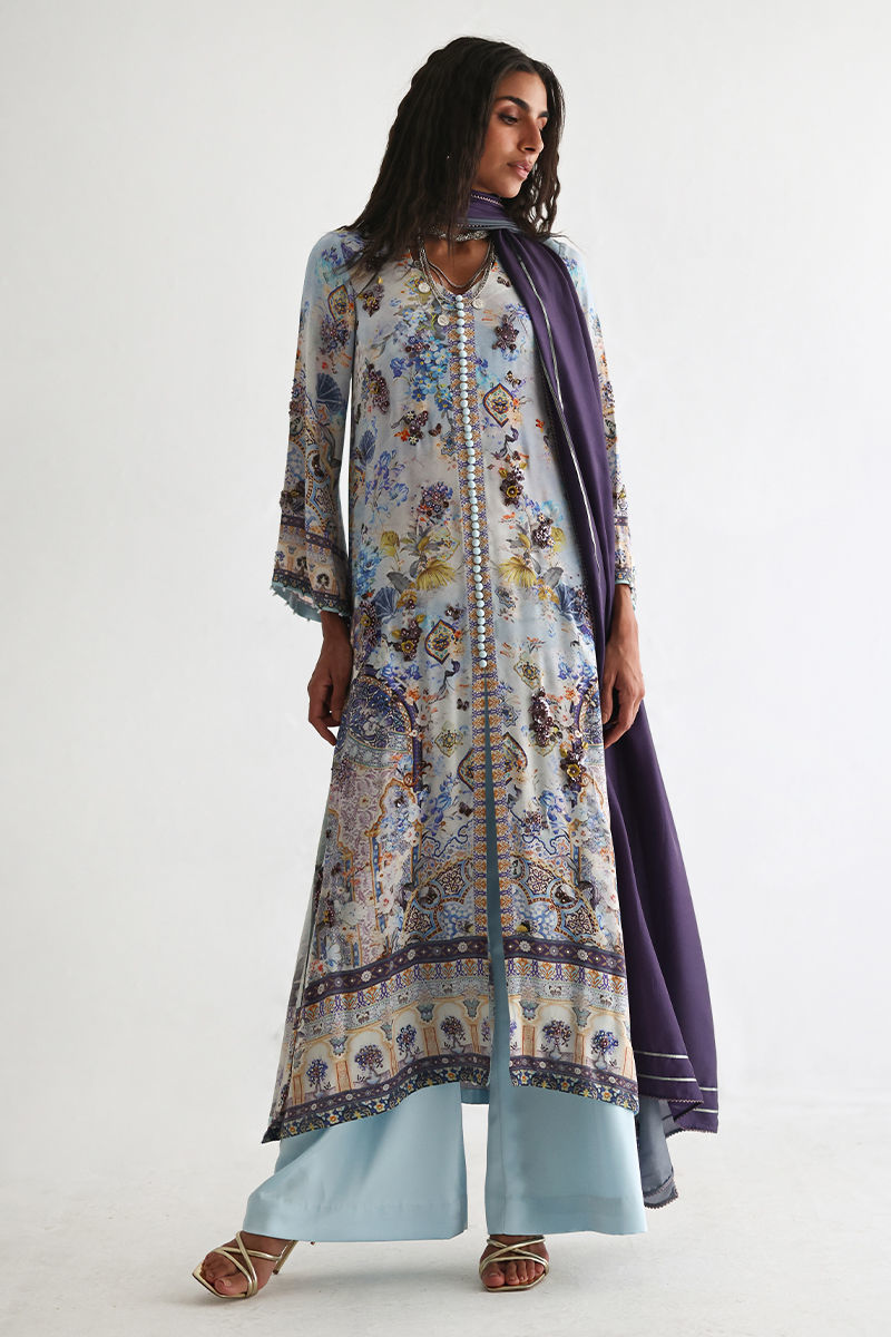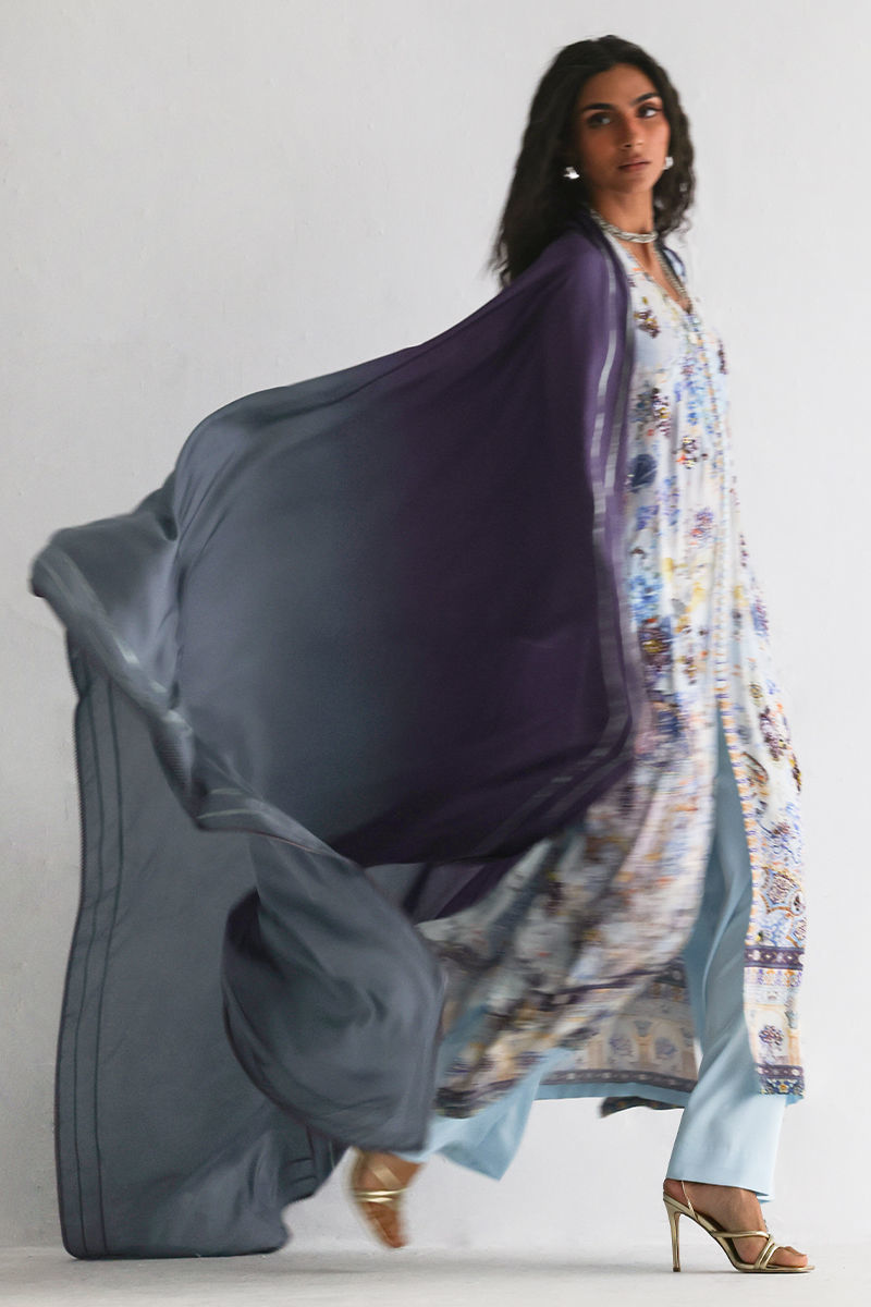 This front open shirt features a striking digital print, beautifully enhanced with intricate embellishments of imported textured sequins, stones, cutdana, pearls, and kora, adding depth and artisanal elegance. Paired with cotton charmeuse culottes for effortless comfort and movement, the ensemble is completed with a pure medium silk dupatta in soft shaded purple and grey, finished with delicate lace detailing for a graceful, elevated look.
