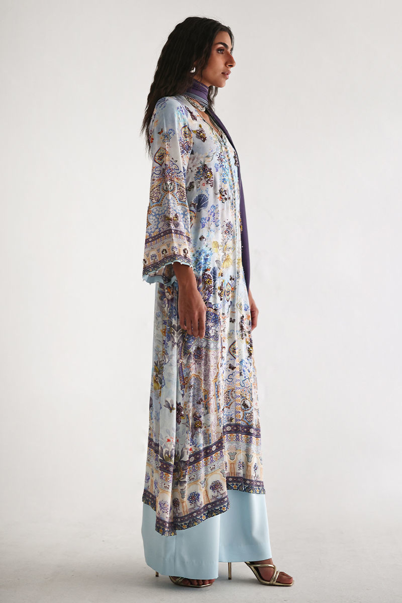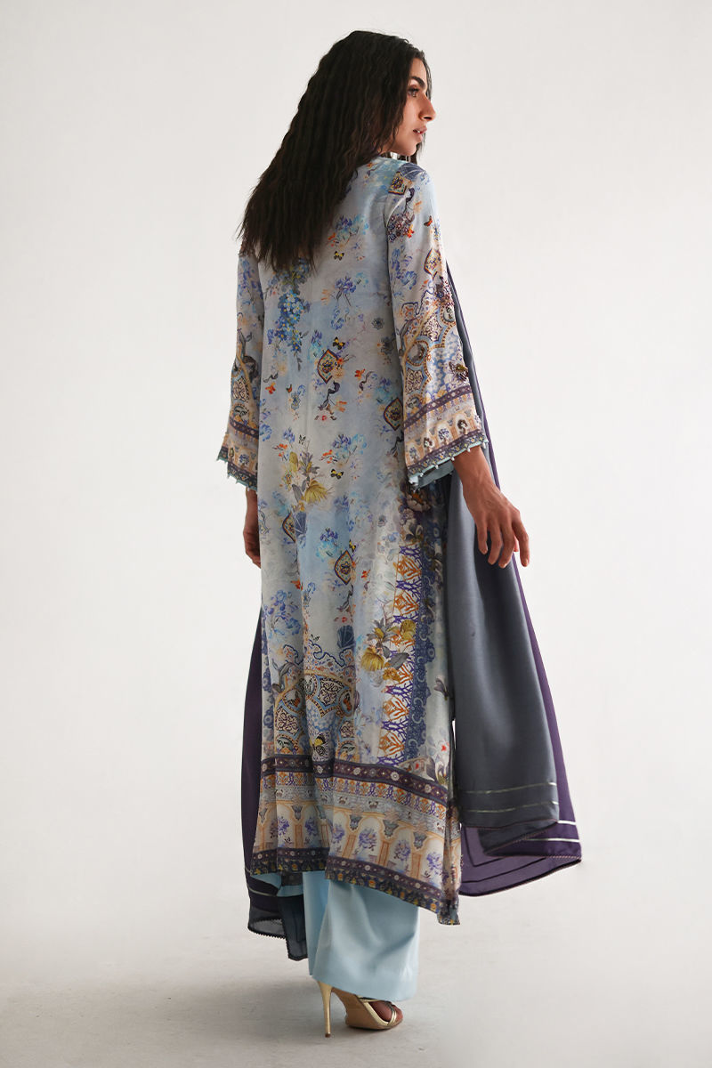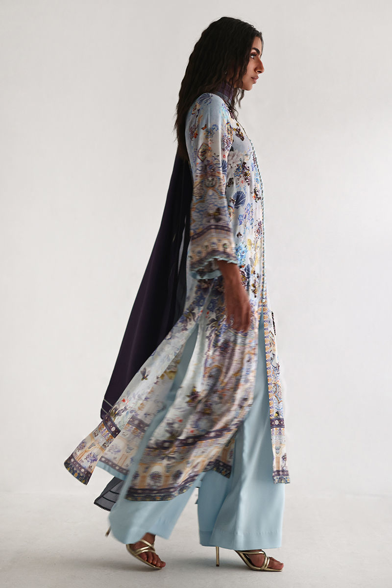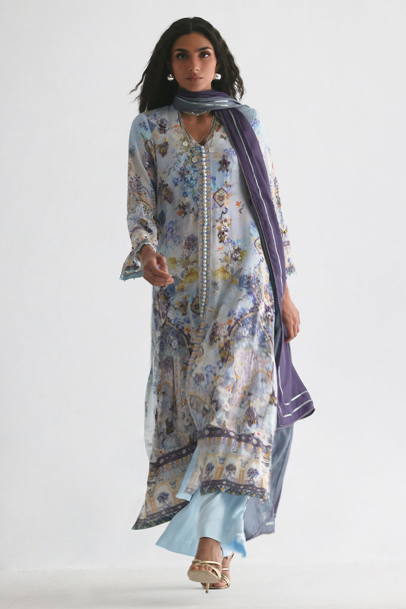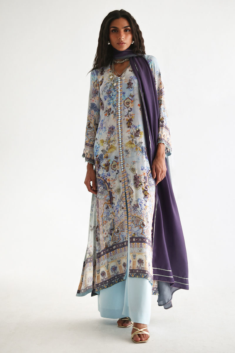 This front open shirt features a striking digital print, beautifully enhanced with intricate embellishments of imported textured sequins, stones, cutdana, pearls, and kora, adding depth and artisanal elegance. Paired with cotton charmeuse culottes for effortless comfort and movement, the ensemble is completed with a pure medium silk dupatta in soft shaded purple and grey, finished with delicate lace detailing for a graceful, elevated look.