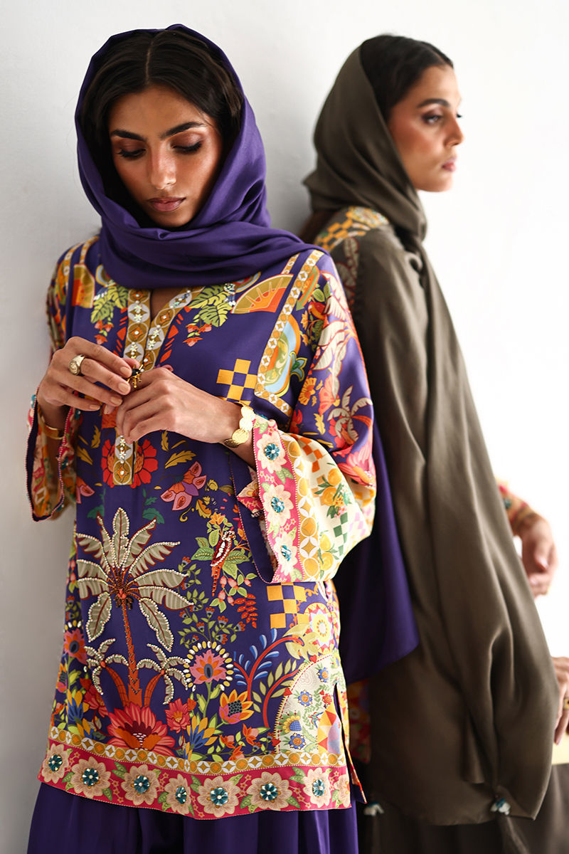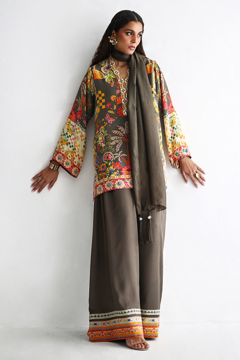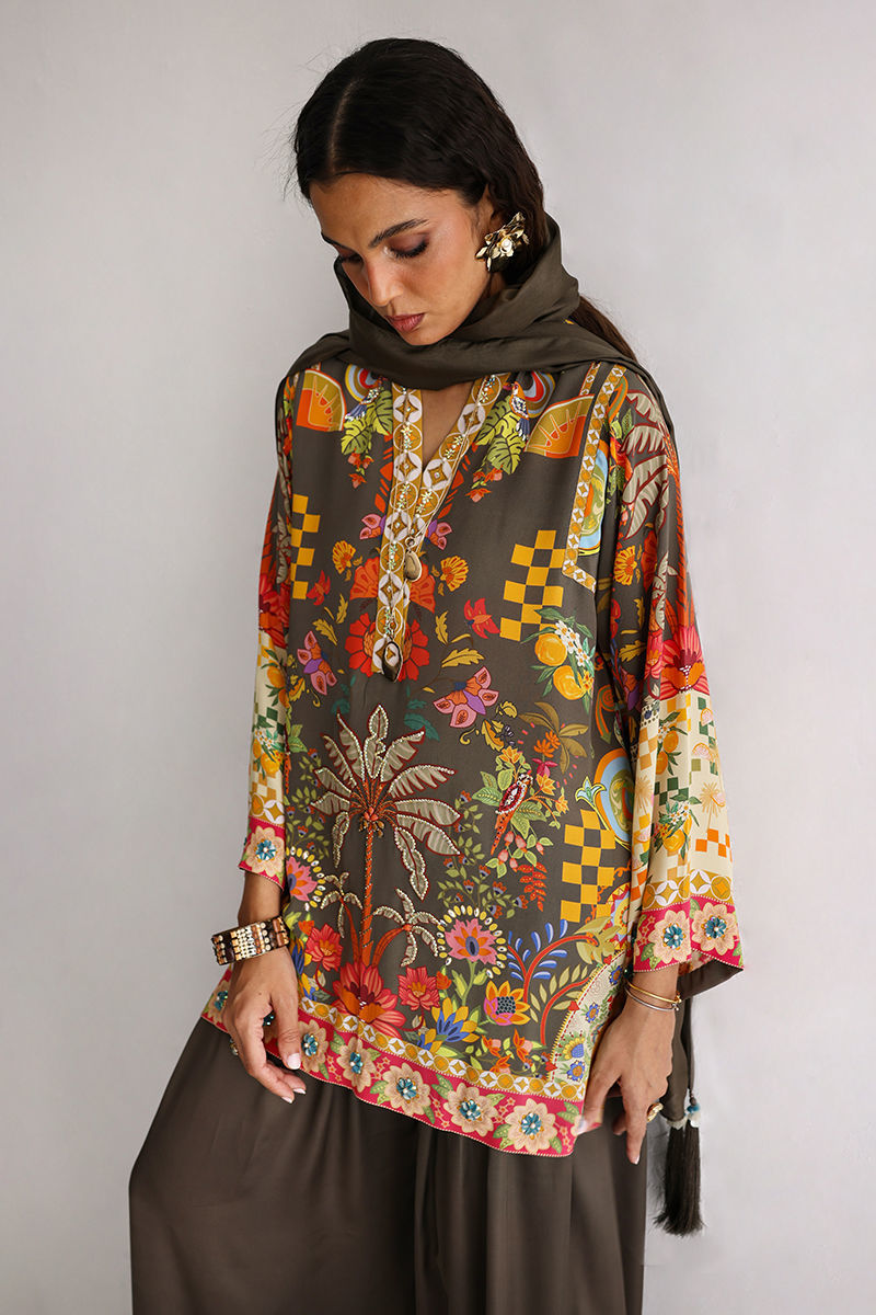 Color: Dark Olive Fabric: Shirt: Pure Crepe, Farshi Culottes: Cotton Charmeuse, Dupatta: Pure Medium Silk Work Details: Digital Printed and Embellished