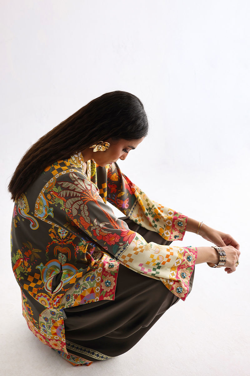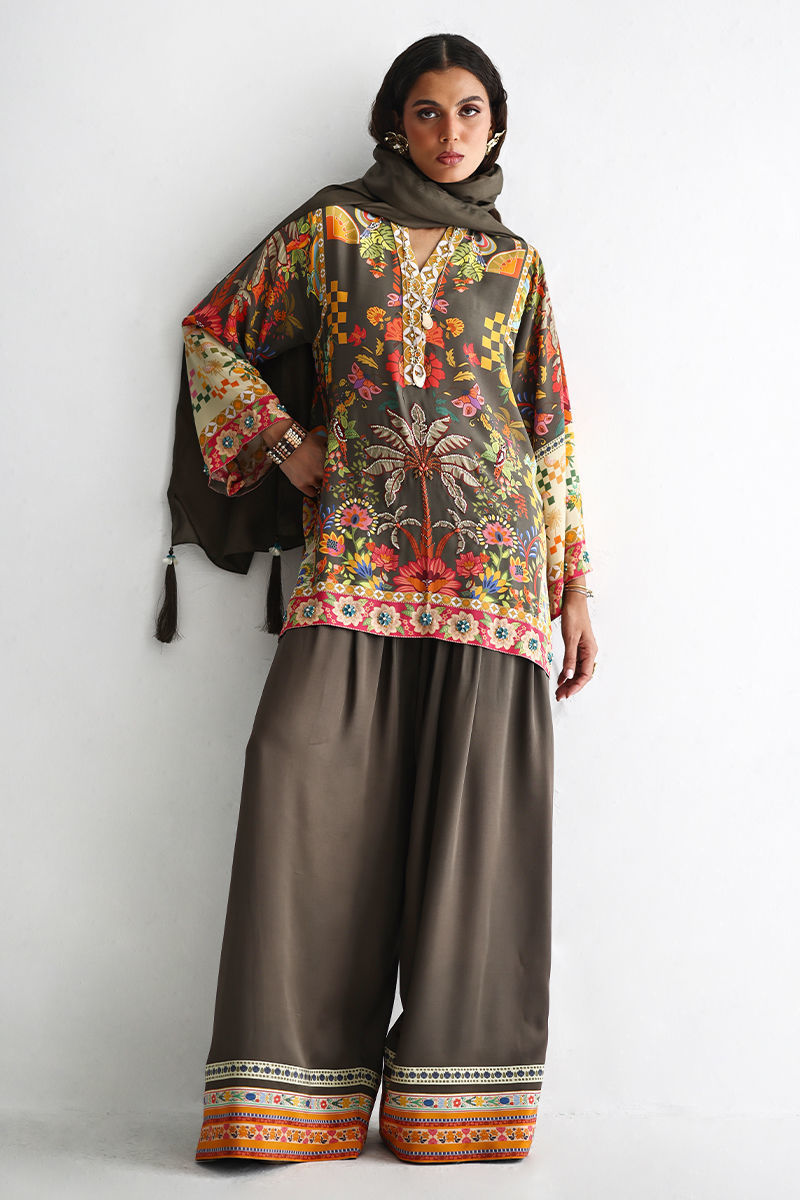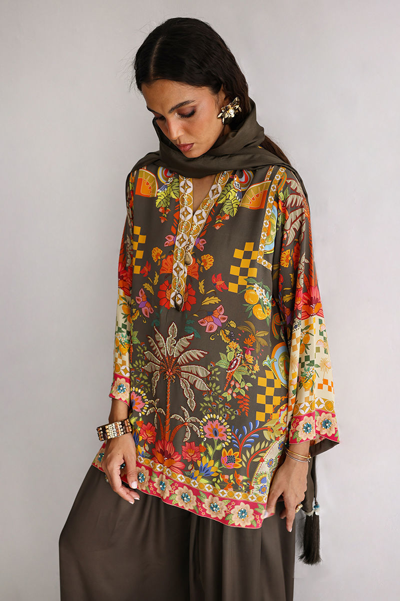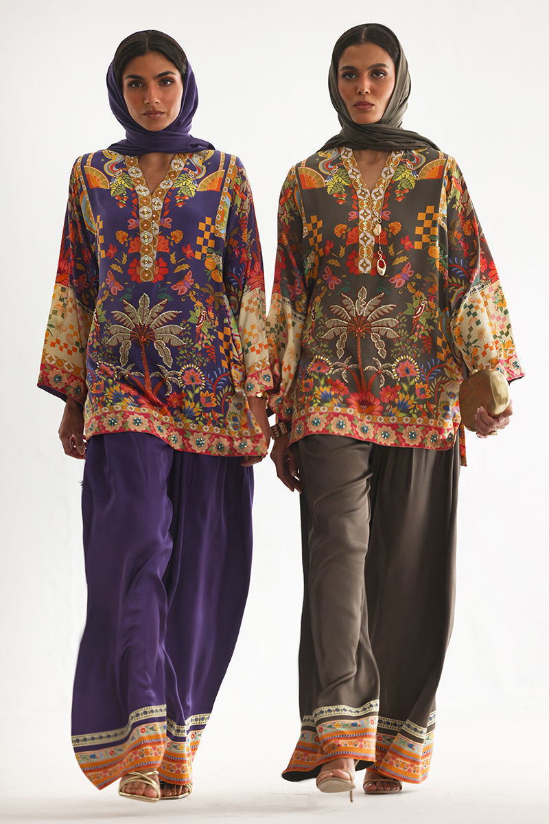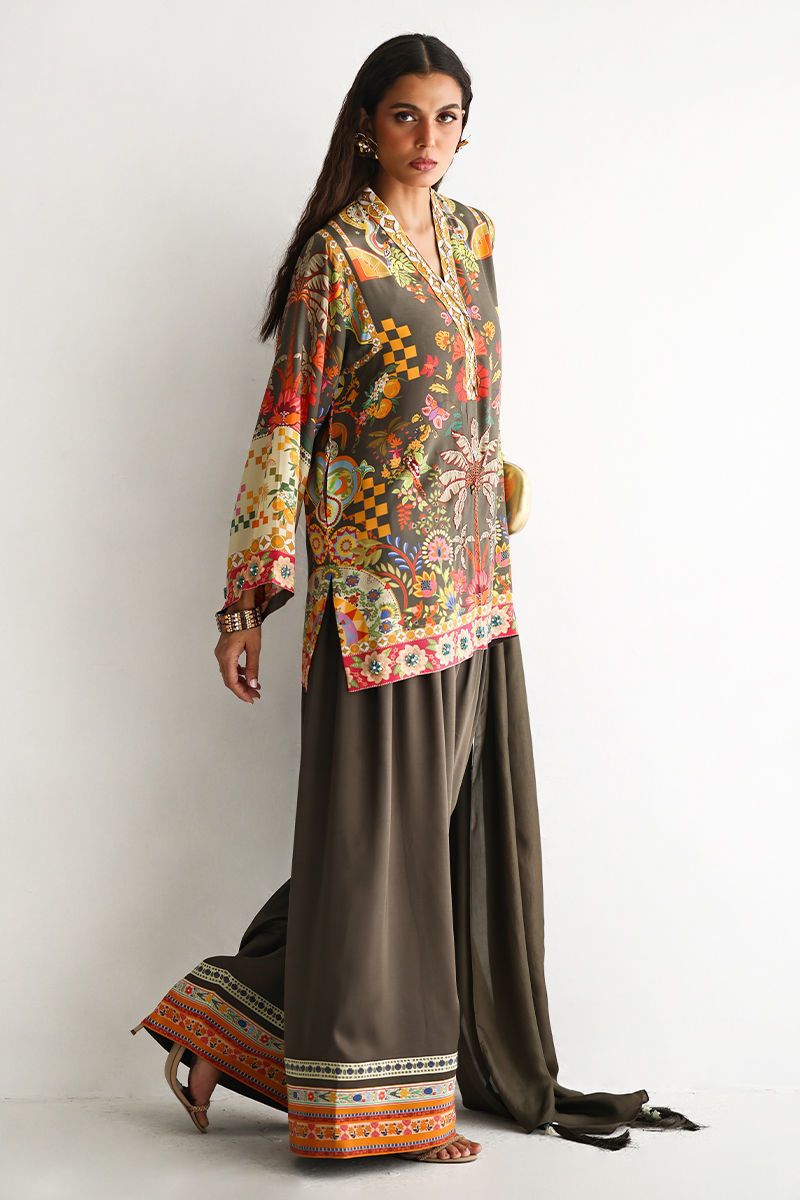 The shirt features a sophisticated digital print, enhanced with delicate hand embellishments of imported colored stones, textured sequins, cutdana, pearls, and crystals, adding depth and subtle sparkle. It is paired with fluid cotton charmeuse culottes, finished with printed borders at the hem for a polished touch. The ensemble is completed with a pure medium silk dupatta in a soft grey and ivory ombré, detailed with elegant lace for a graceful, elevated finish.