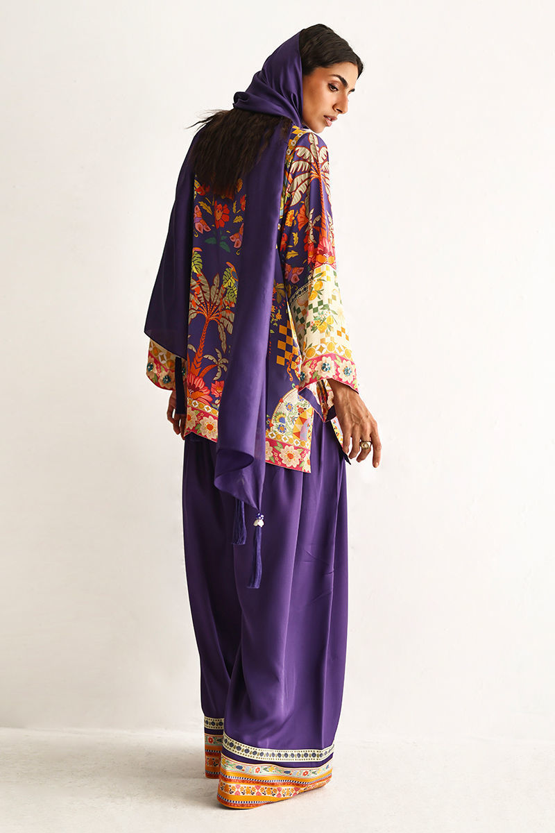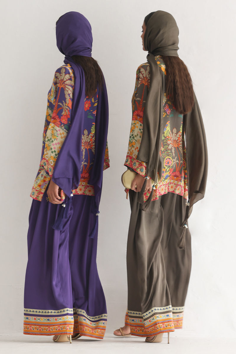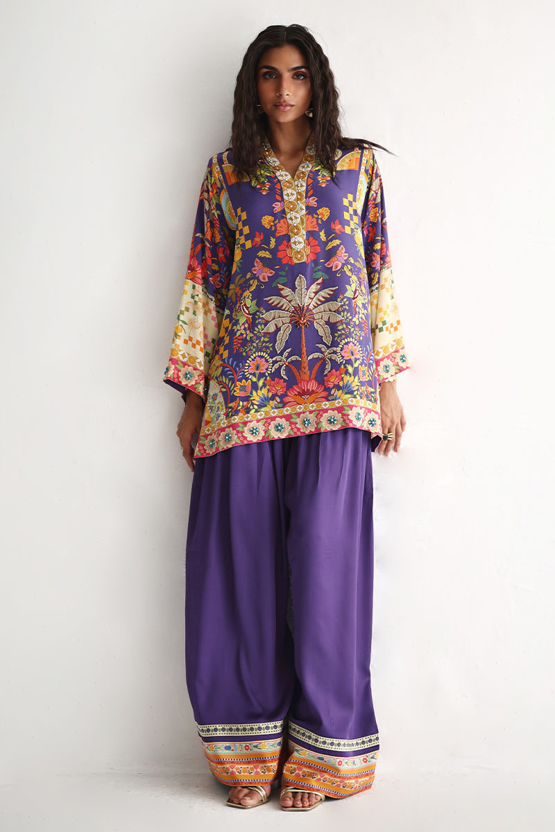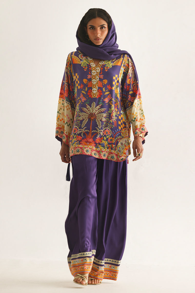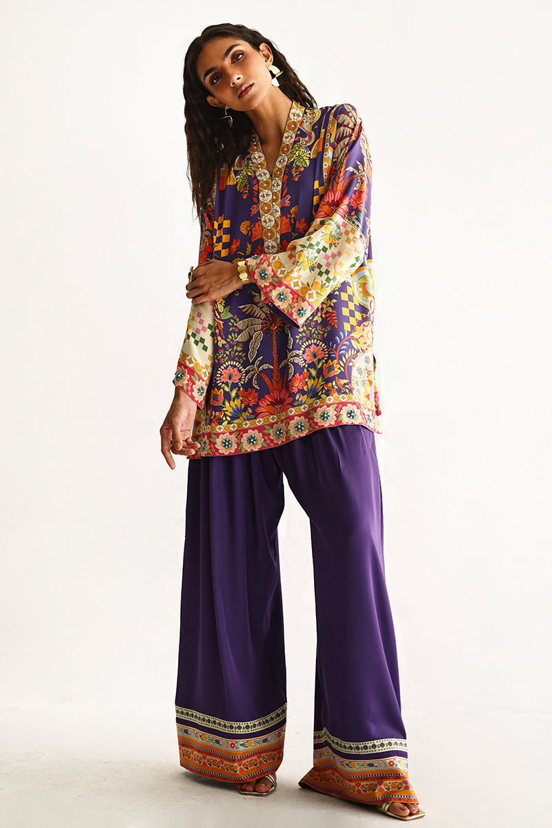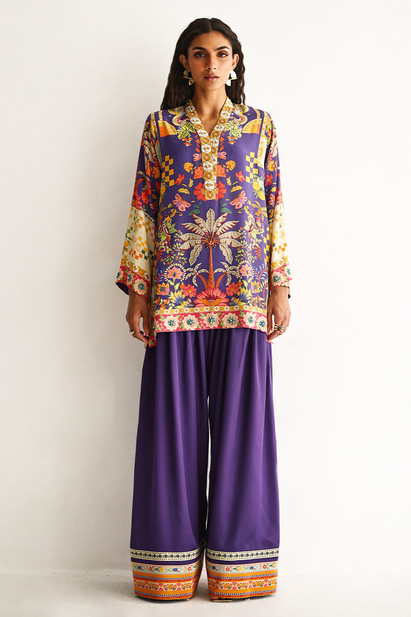 This lose cut shirt with pockets features a vibrant digital print, enhanced with exquisite hand embellishments of imported colored stones, 3D flowers, textured sequins, cutdana, and pearls (moti), creating a rich and artisanal appeal. It is paired with farshi-style cotton charmeuse culottes, adorned with printed borders at the hem for a contemporary finish. Completing the look is a medium silk stole, detailed with delicate handmade tassel hangings, adding effortless elegance to this statement ensemble.