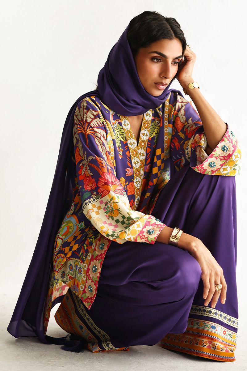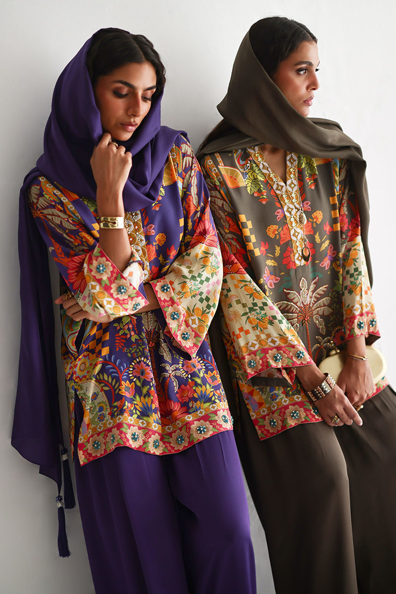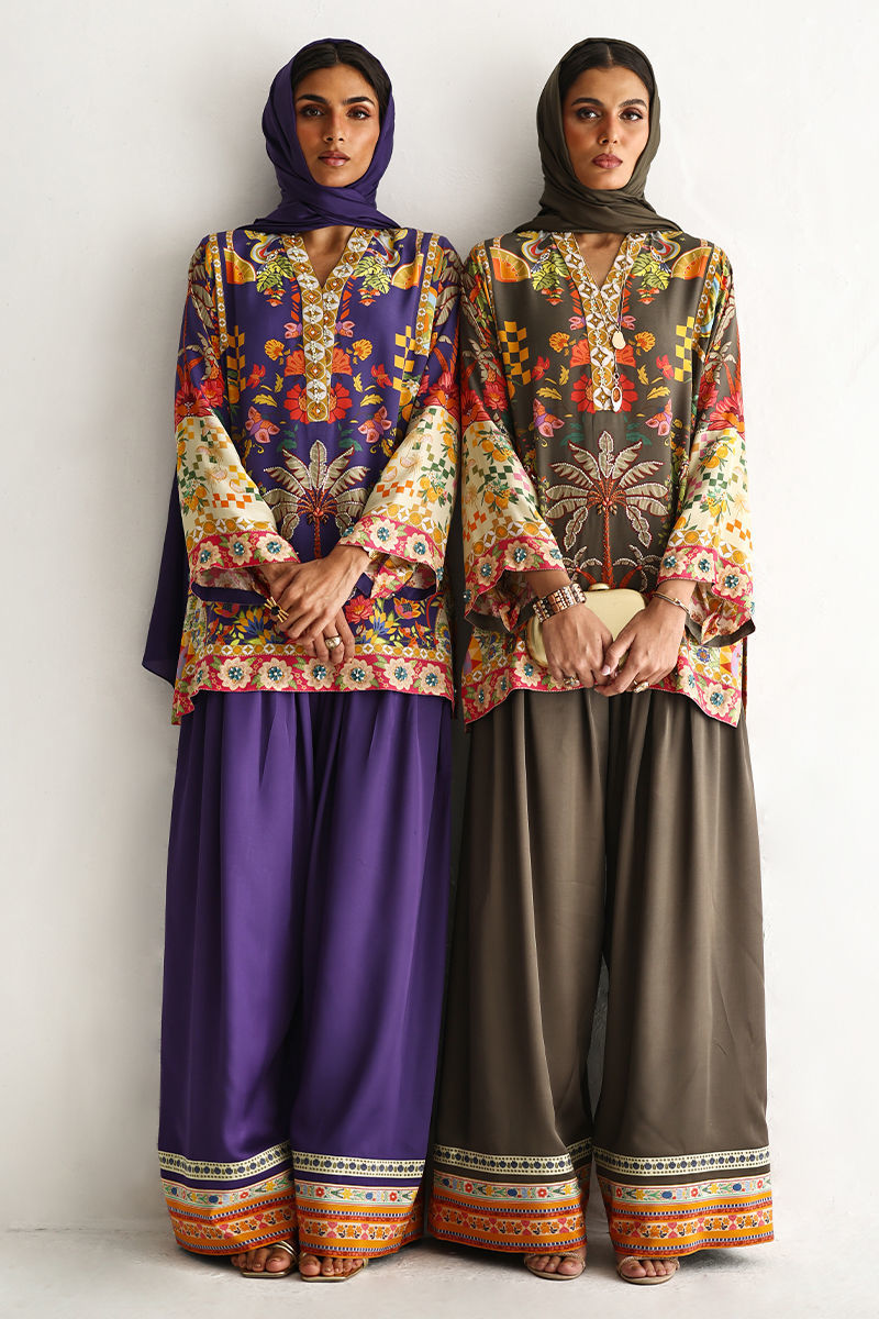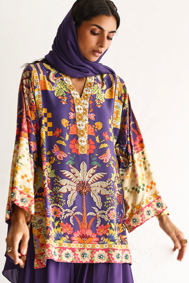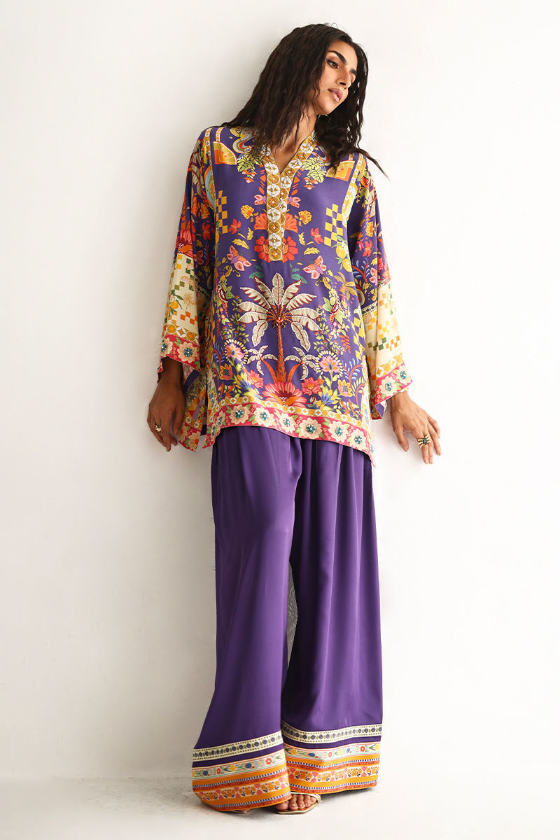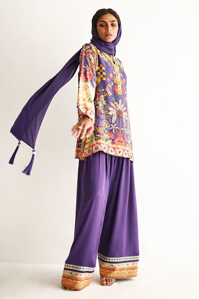 This lose cut shirt with pockets features a vibrant digital print, enhanced with exquisite hand embellishments of imported colored stones, 3D flowers, textured sequins, cutdana, and pearls (moti), creating a rich and artisanal appeal. It is paired with farshi-style cotton charmeuse culottes, adorned with printed borders at the hem for a contemporary finish. Completing the look is a medium silk stole, detailed with delicate handmade tassel hangings, adding effortless elegance to this statement ensemble.