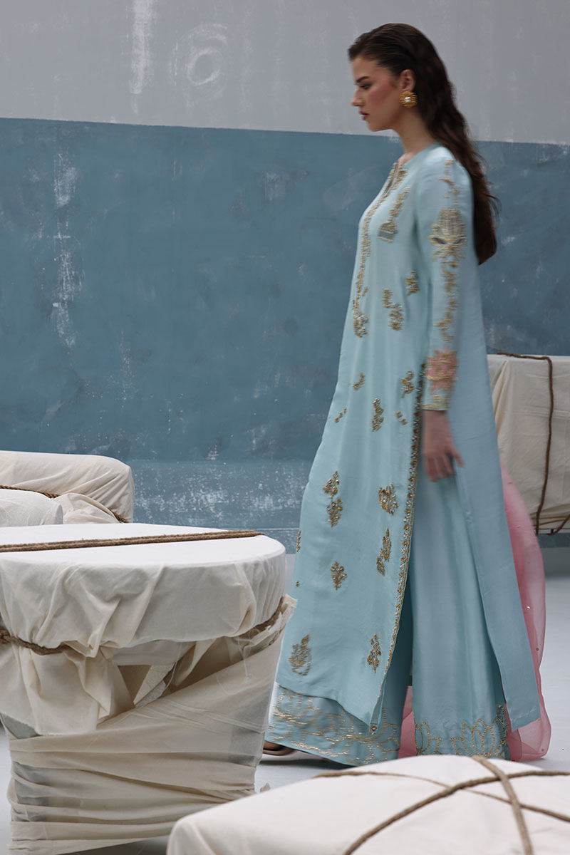 A pure raw silk 80 gms long straight shirt. Pure zardozi work on the front with gold and silver kora, dabka, naqshi, moti, pearls, and sequins on the sleeves, complemented by gold resham embroidery with applique and handwork. Pure raw silk 80 gms culottes with handwork on the bottom, paired with a blush pink pure organza dupatta featuring handwork and zari embroidery.