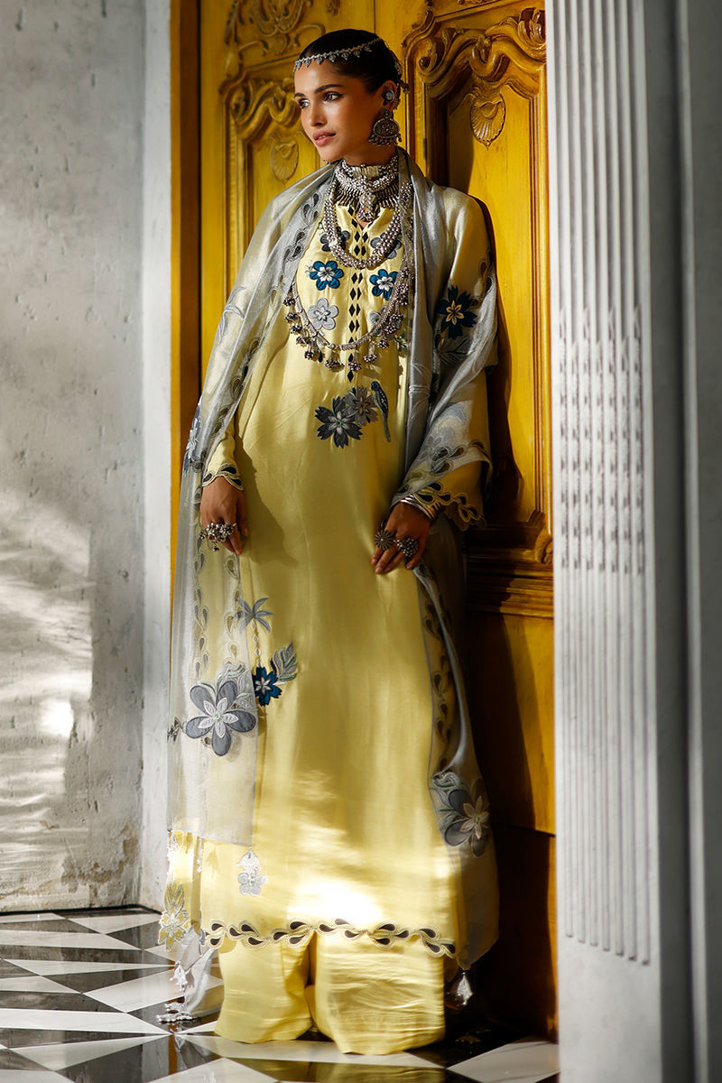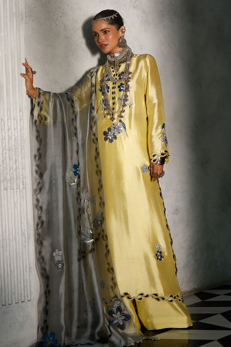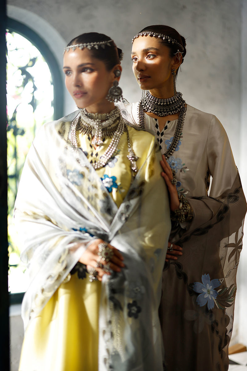 The lime light long shirt, crafted from butter silk, features a vibrant screen print with coloured appliqué work and intricate resham embroidery across the front, back, and sleeves, finished with pockets. It is paired with pure cotton silk culottes for a fluid silhouette. The look is completed with a grey shisha net dupatta, adorned with matching screen print, coloured appliqué work, resham embroidery, and handmade tassels for an artisanal finish.