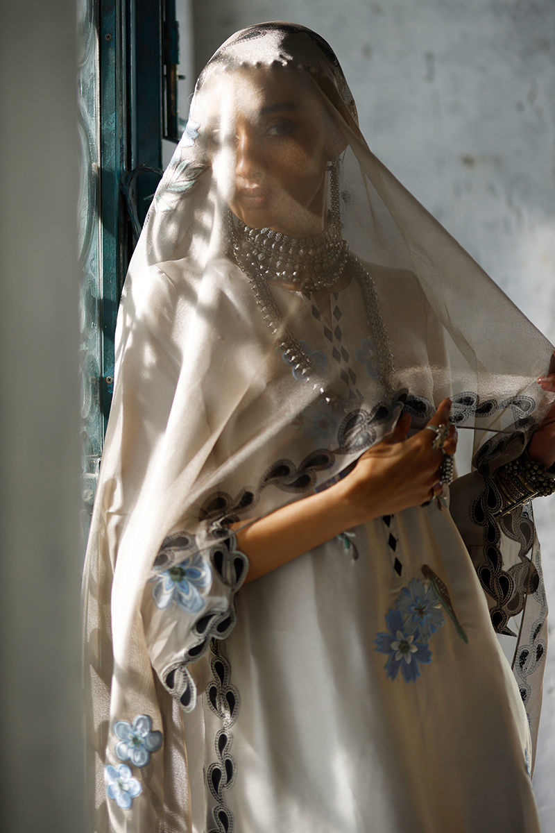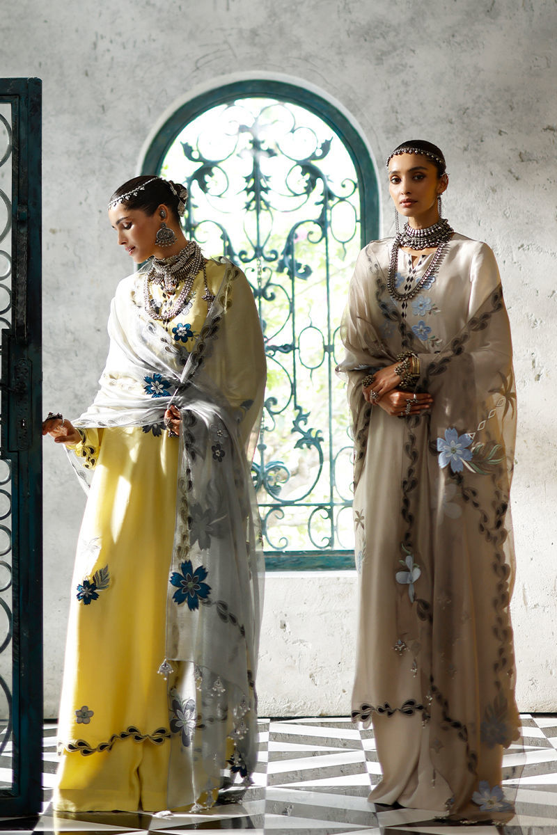 The Cloud Dancer long shirt, crafted from butter silk, features a vibrant screen print with coloured appliqué work and intricate resham embroidery across the front, back, and sleeves, finished with pockets. It is paired with pure cotton silk culottes for a fluid, elegant silhouette. The look is completed with a Moon Rock shisha net dupatta, adorned with coordinated screen print, coloured appliqué work, resham embroidery, and handmade tassels for a refined, artisanal finish.