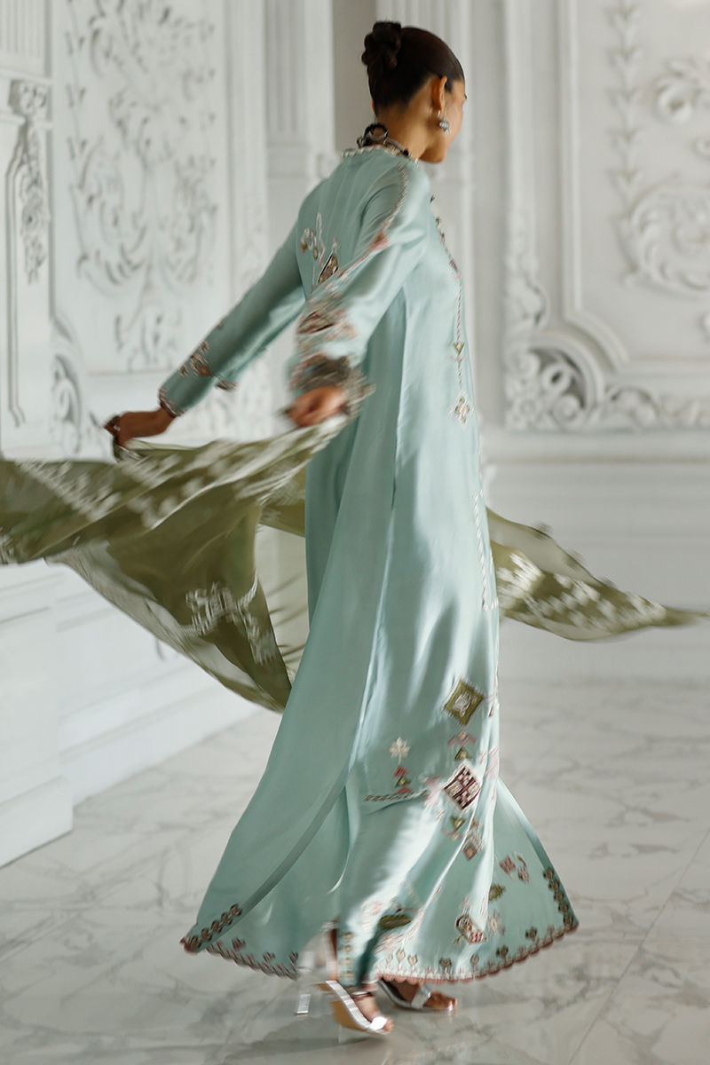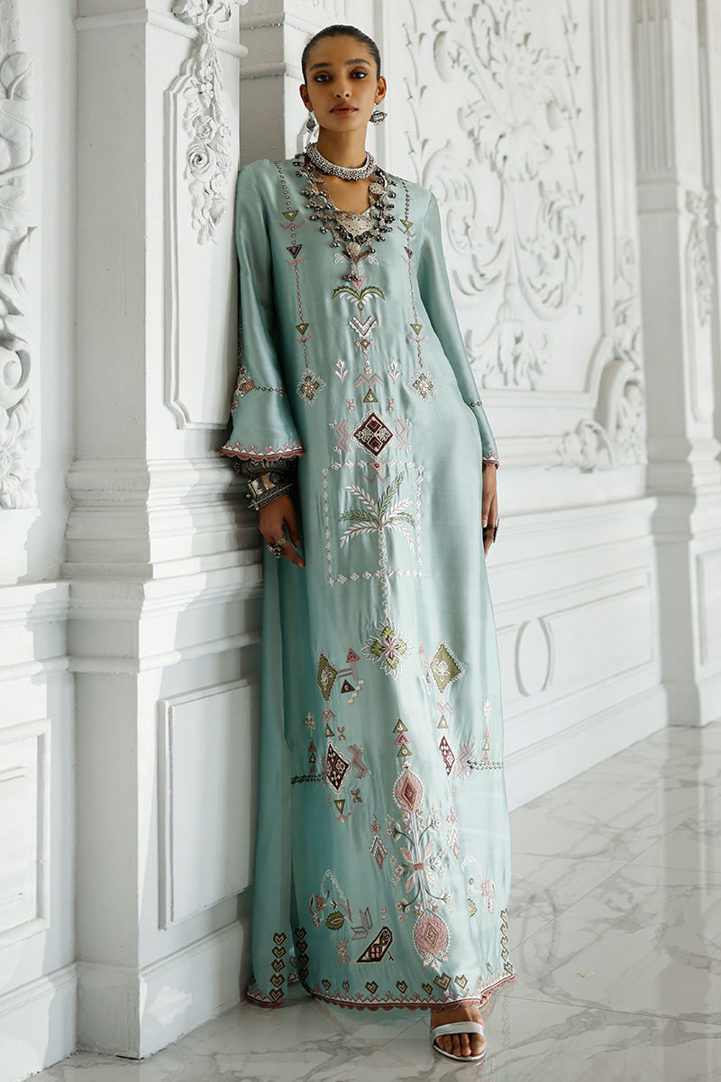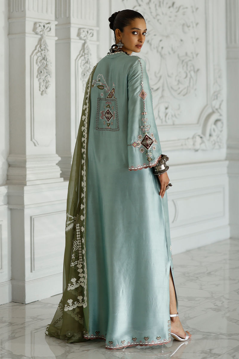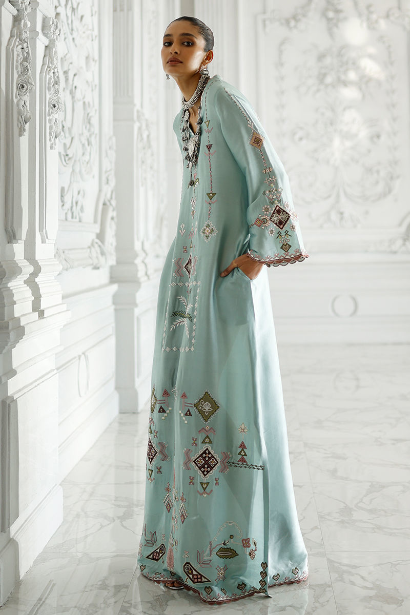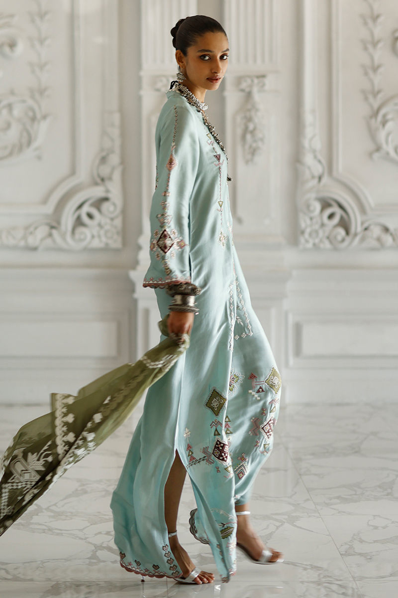 Hushed blue butter silk kaftan with coloured appliqué work and resham embroidery on front, back, and sleeves, finished with pockets. Paired with an olive shisha organza dupatta with screen print and handmade tassels.