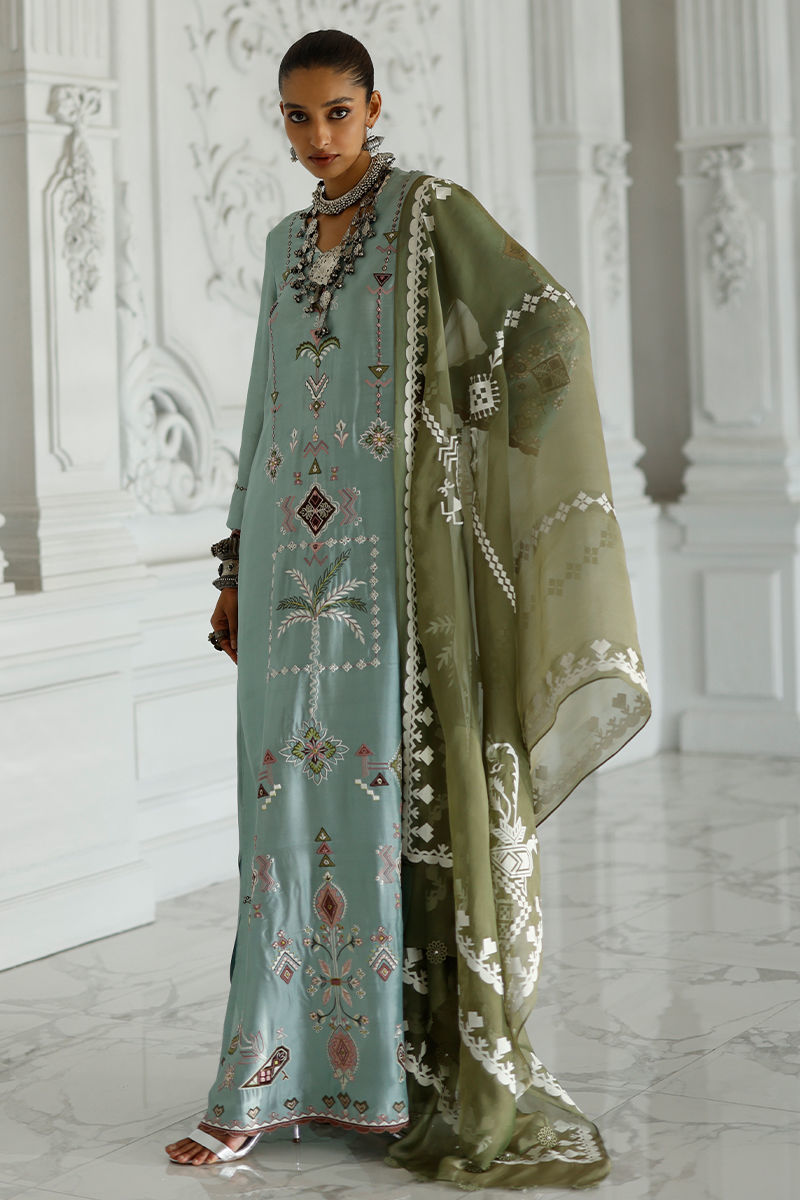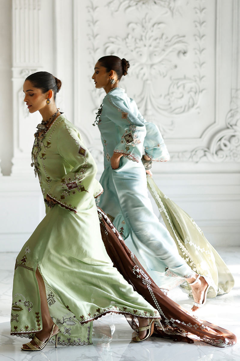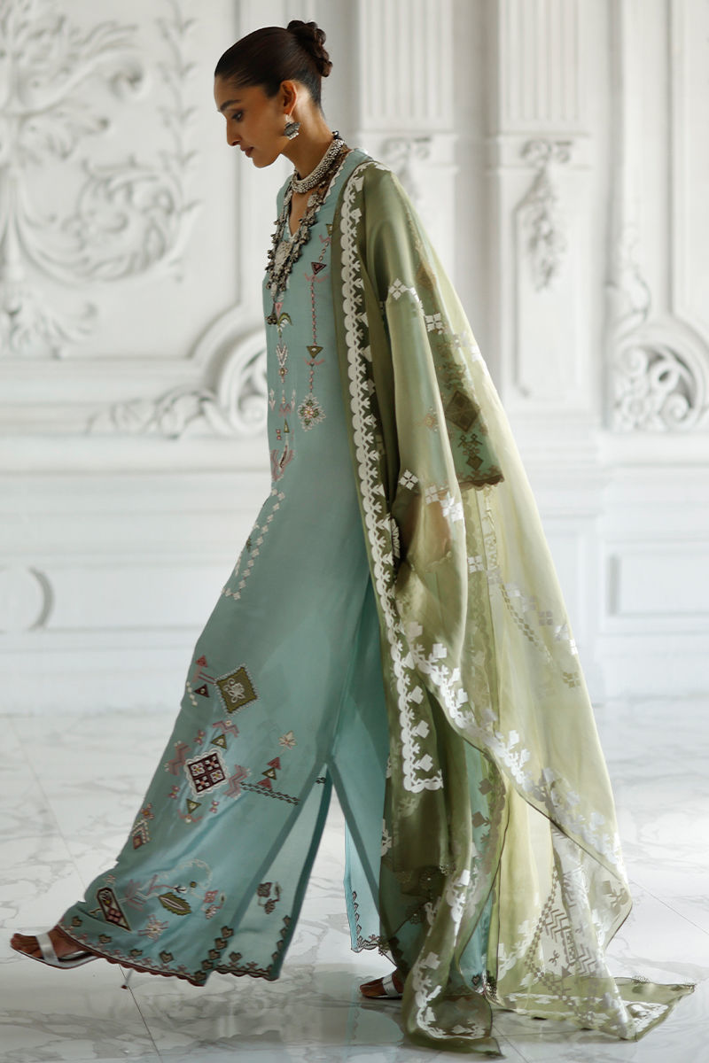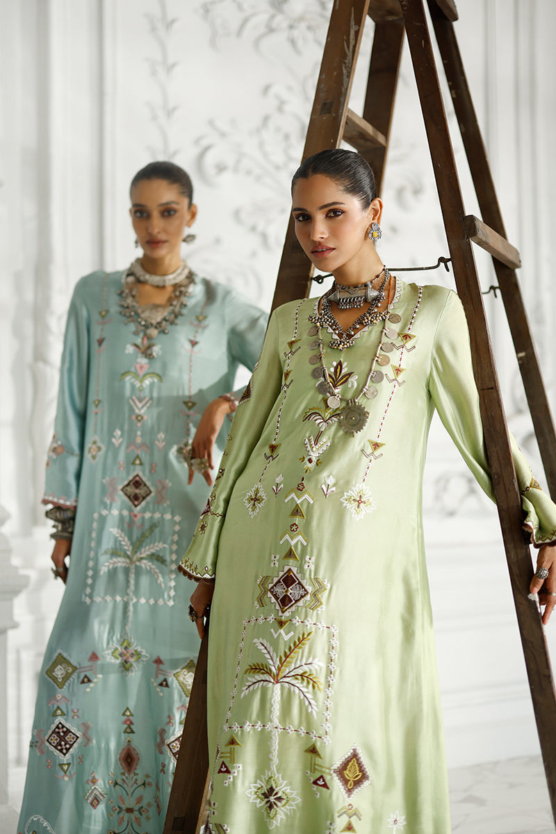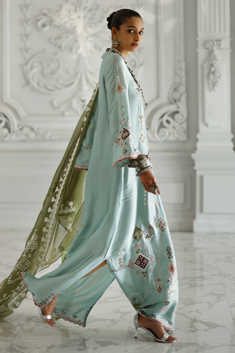 Hushed blue butter silk kaftan with coloured appliqué work and resham embroidery on front, back, and sleeves, finished with pockets. Paired with an olive shisha organza dupatta with screen print and handmade tassels.