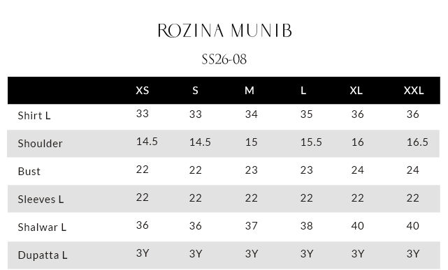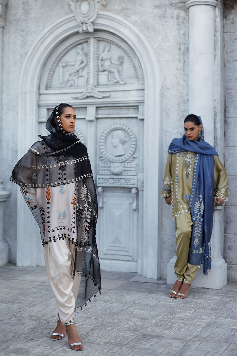 The yogurt tint loose-cut short shirt, crafted from butter silk, features pockets and is adorned with screen print, coloured resham embroidery, and delicate hangings across the front, back, and sleeves. It is paired with cream gold khadi shalwar in cotton charmeuse, detailed with screen print on the bottom. The look is completed with a moon rock shisha organza dupatta, adorned with screen print and finished with handmade tassels, adding a refined and artisanal touch.