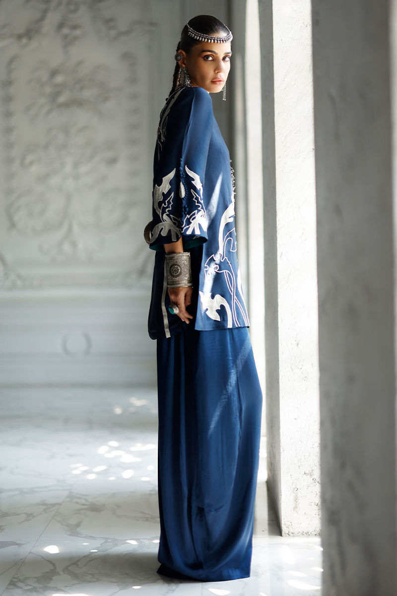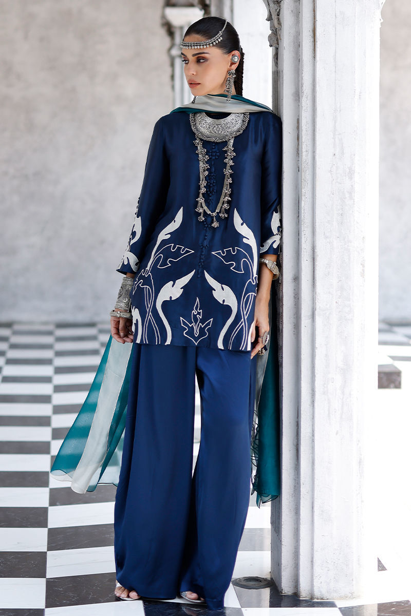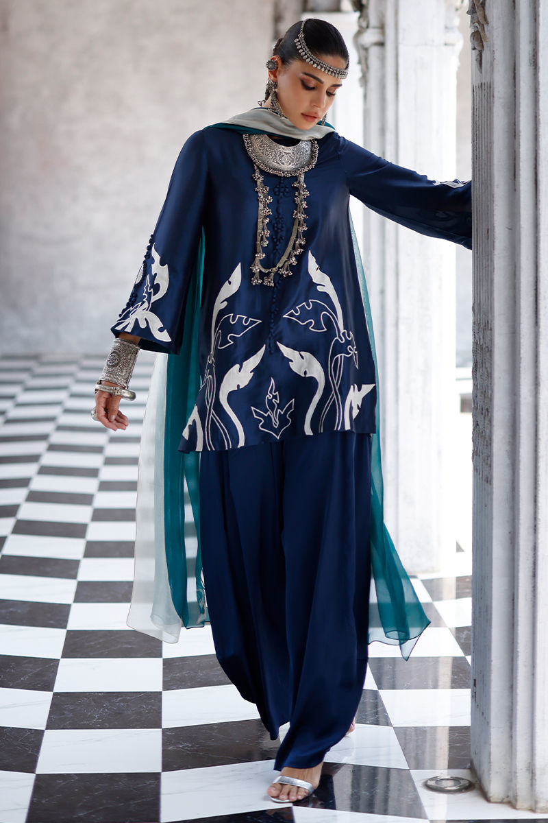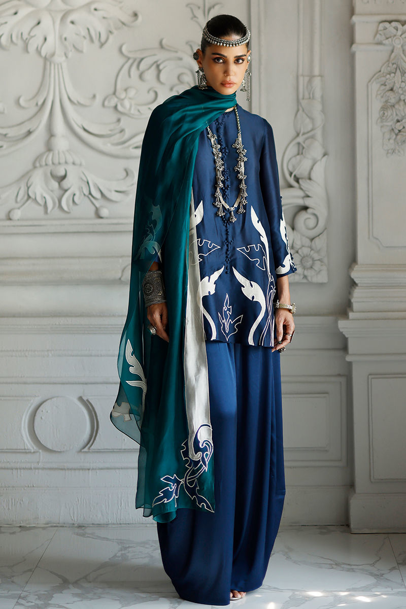 The deep blue short shirt, crafted from butter silk, features intricate self 3D detailing with appliqué work and resham embroidery across the front, back, and sleeves, creating a richly textured and refined look. It is paired with fluid cotton charmeuse balloon pants for effortless elegance, and completed with a sea green shisha organza dupatta adorned with appliqué work and resham embroidery, adding a graceful and elevated finish.