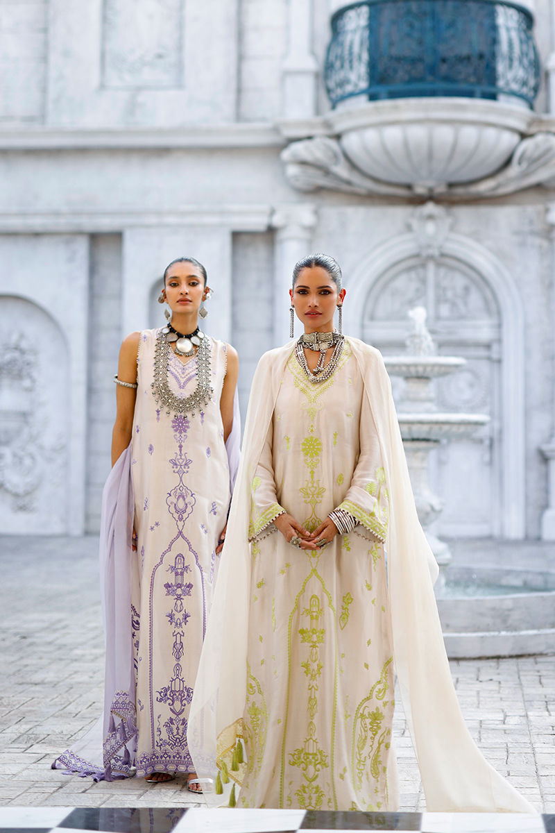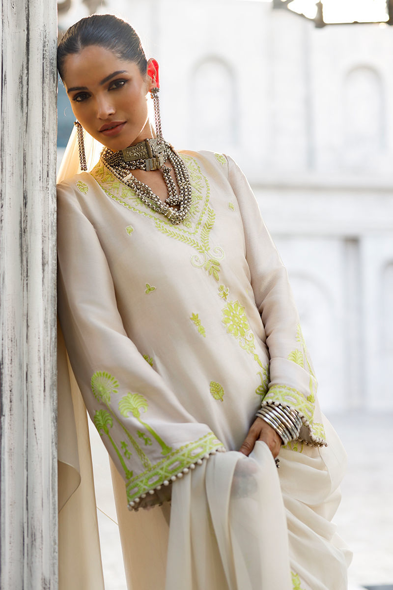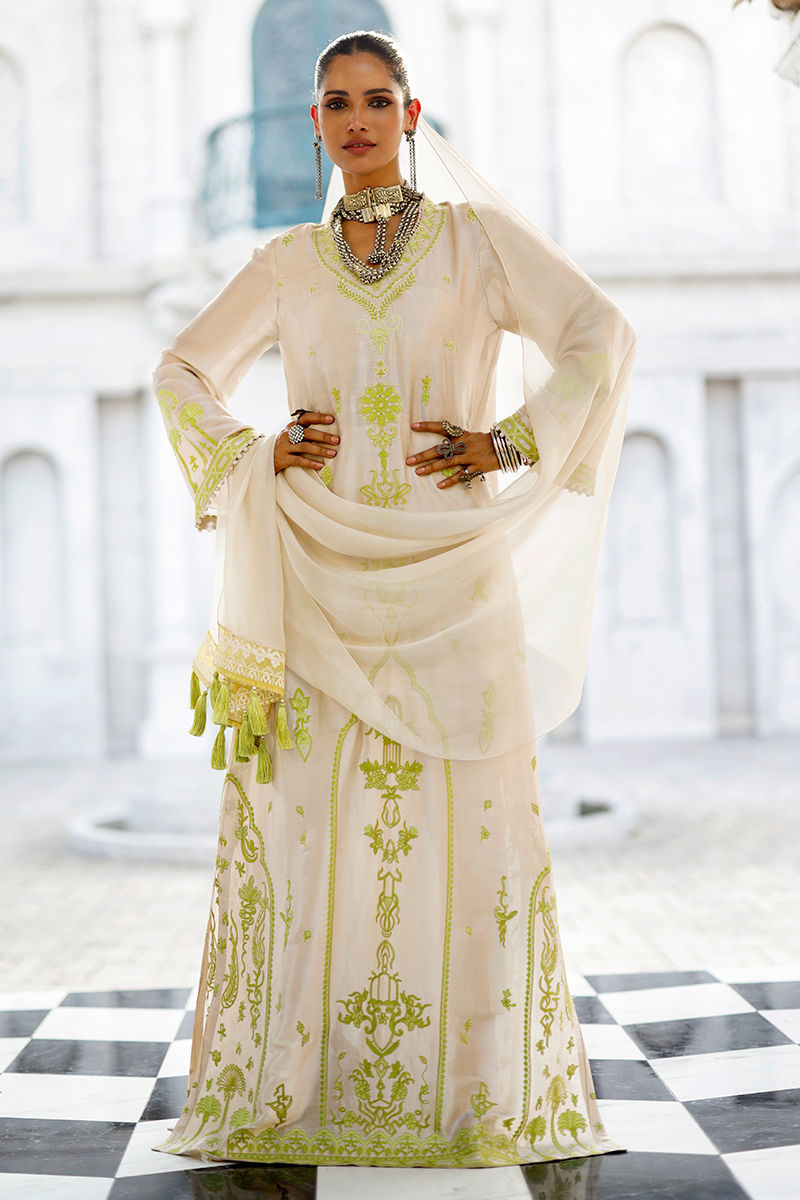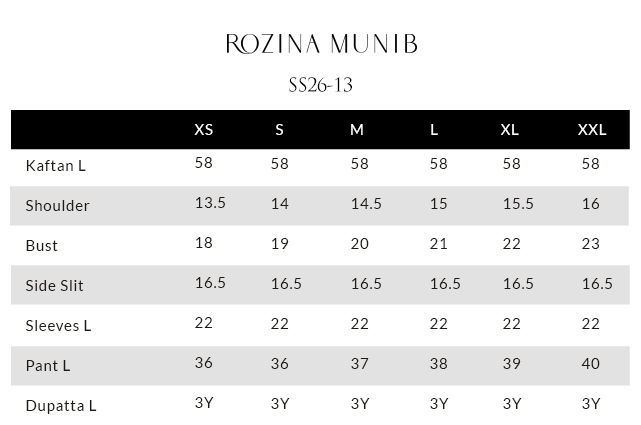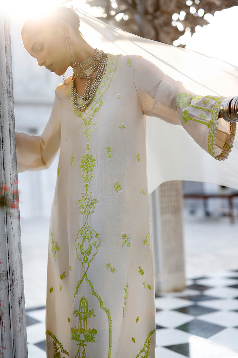 The butter cream kaftan, crafted from butter silk, features functional pockets and intricate aari embroidery with delicate handmade hangings on the front and sleeves, creating an artisanal, refined finish. It is paired with cotton charmeuse pants for effortless elegance, and completed with a matching butter cream shisha organza dupatta, detailed with an aari-embroidered border and handmade tassels for a graceful, elevated touch.