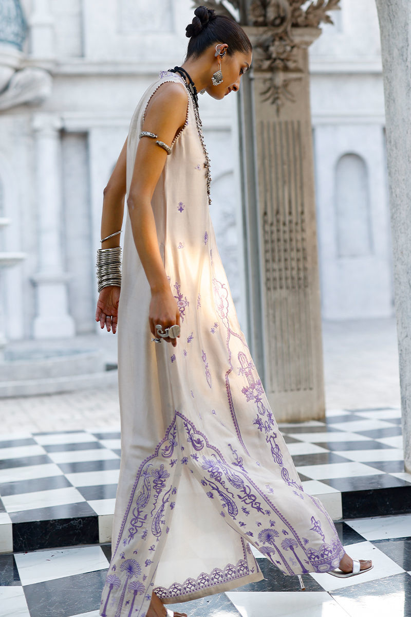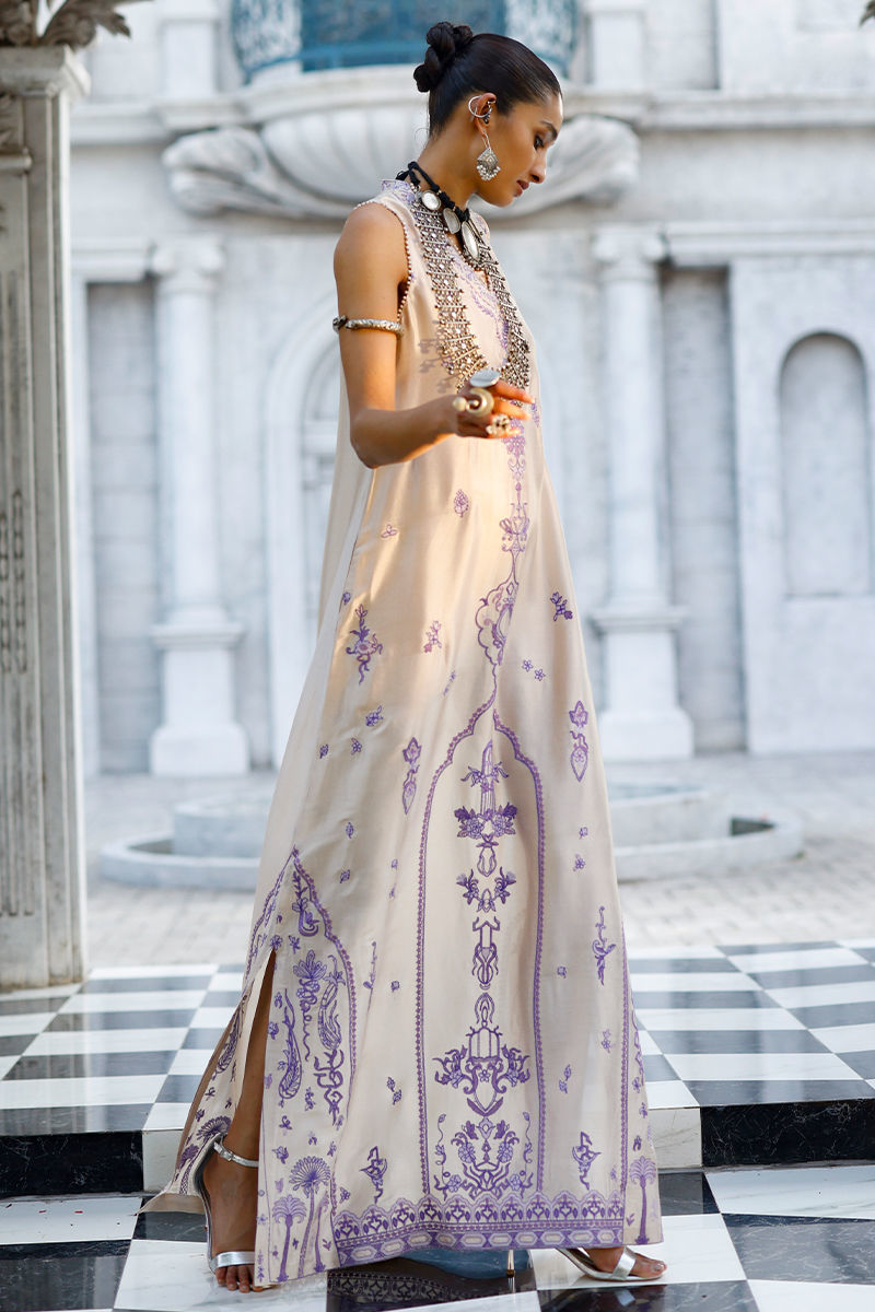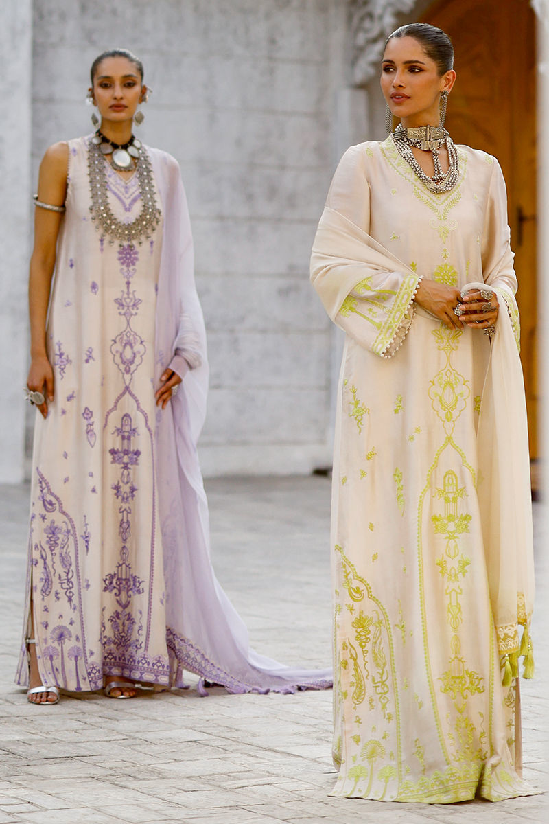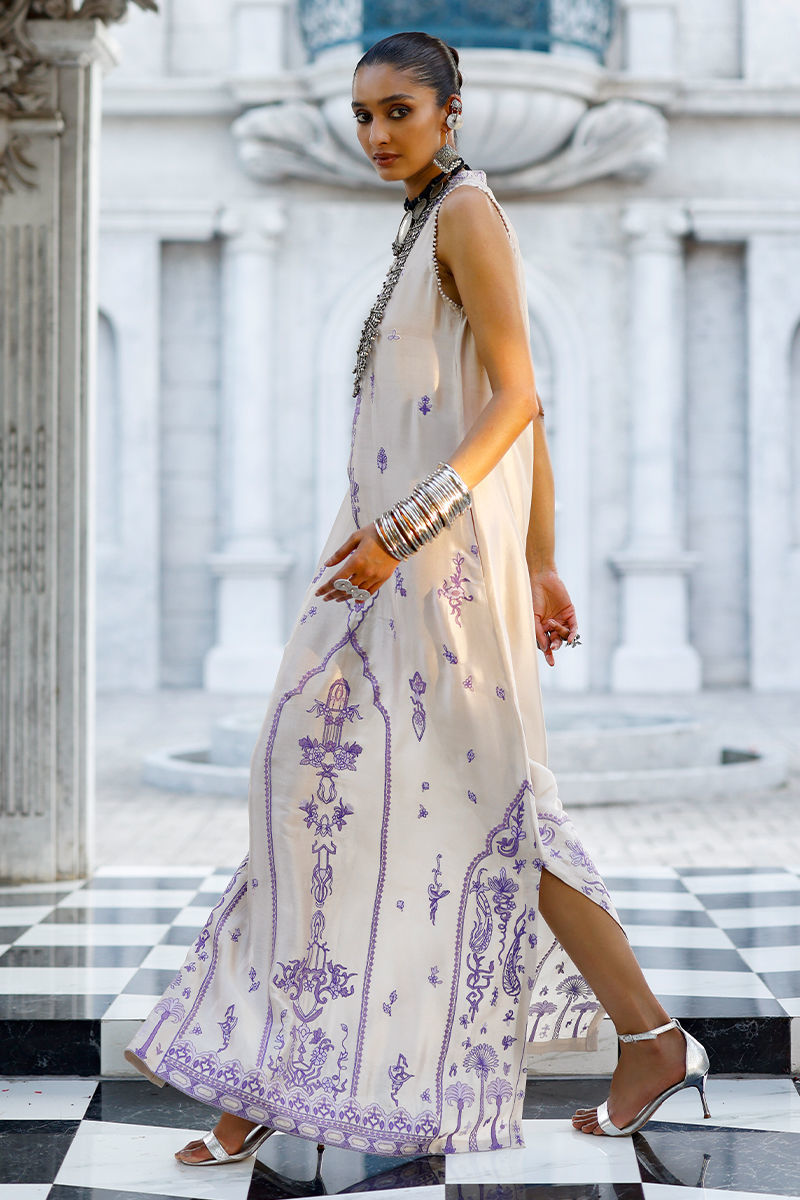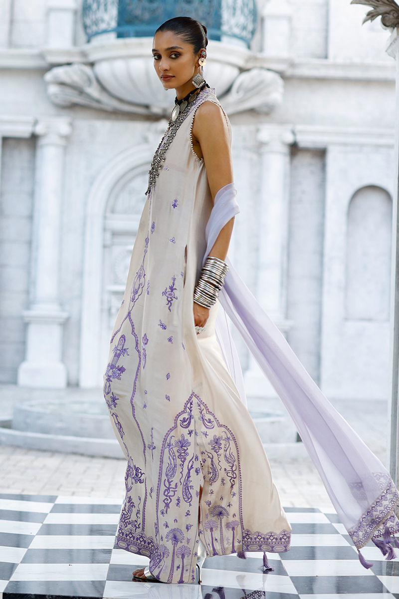 The butter cream kaftan with pockets, crafted from butter silk, features intricate aari embroidery and delicate handmade hangings on the front and sleeves (sleeves optional for styling flexibility). It is paired with cotton charmeuse pants for effortless elegance, and completed with lilac shisha organza dupatta featuring an aari-embroidered border and handmade tassels, adding a refined and artisanal touch.