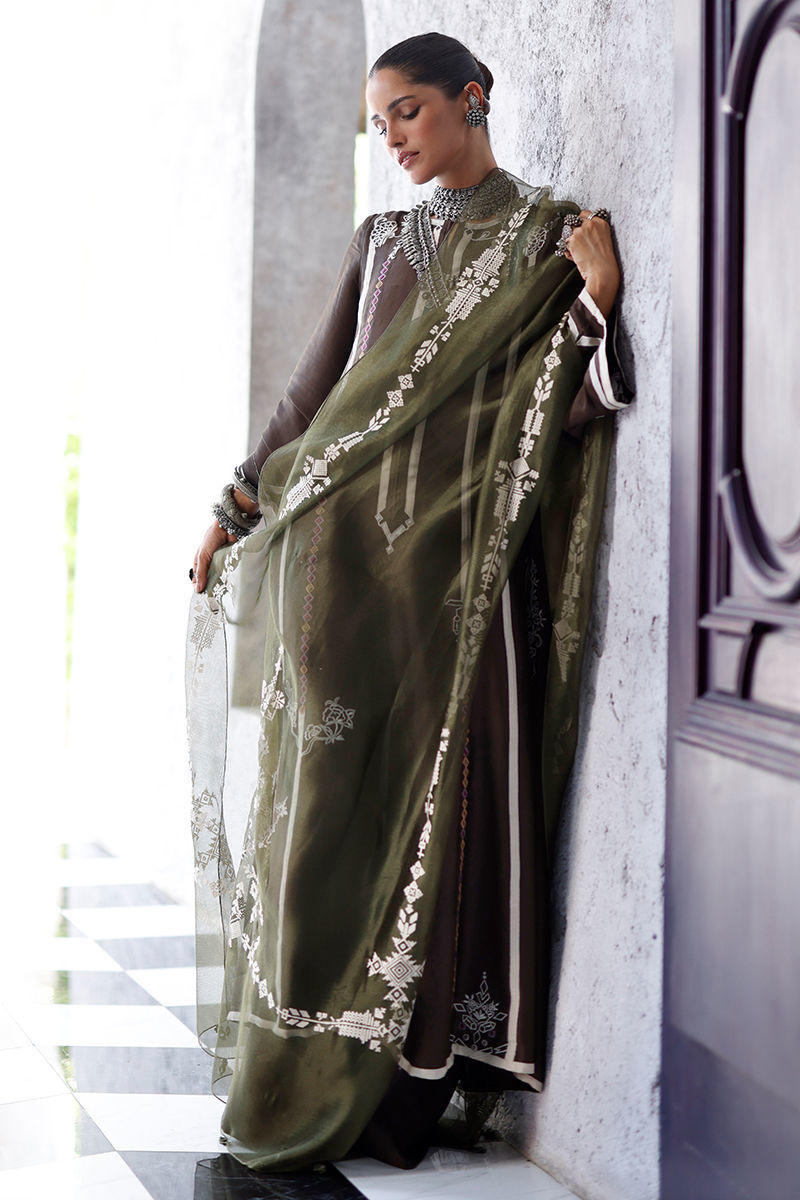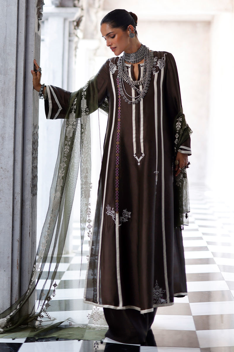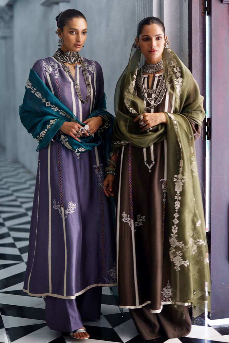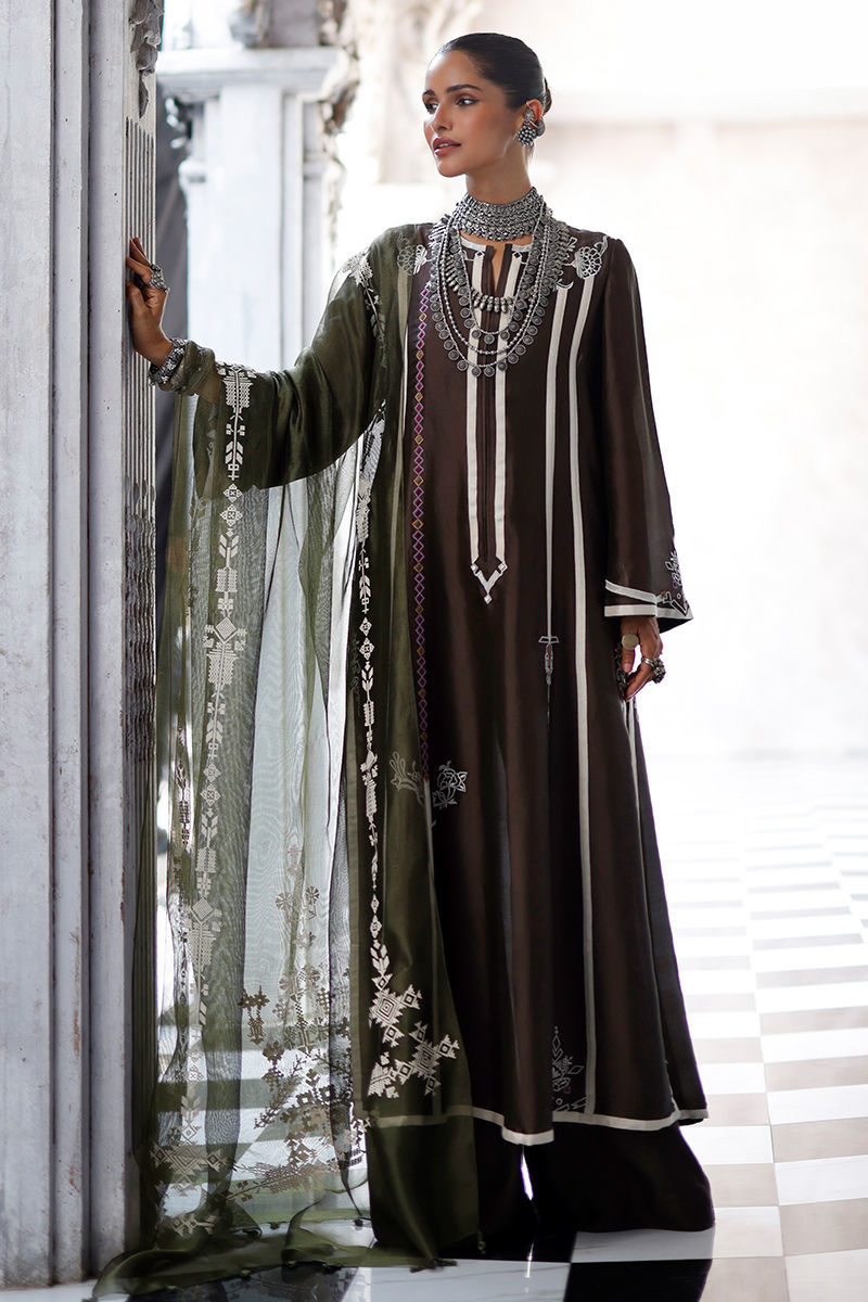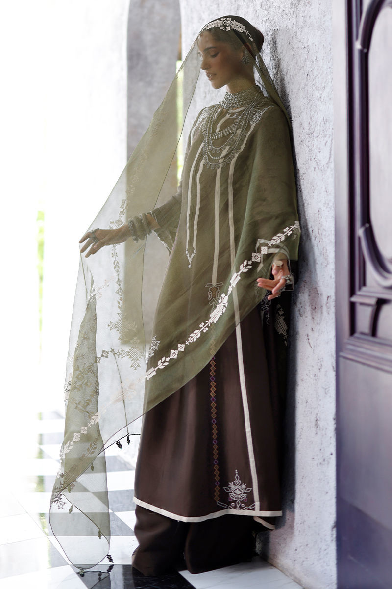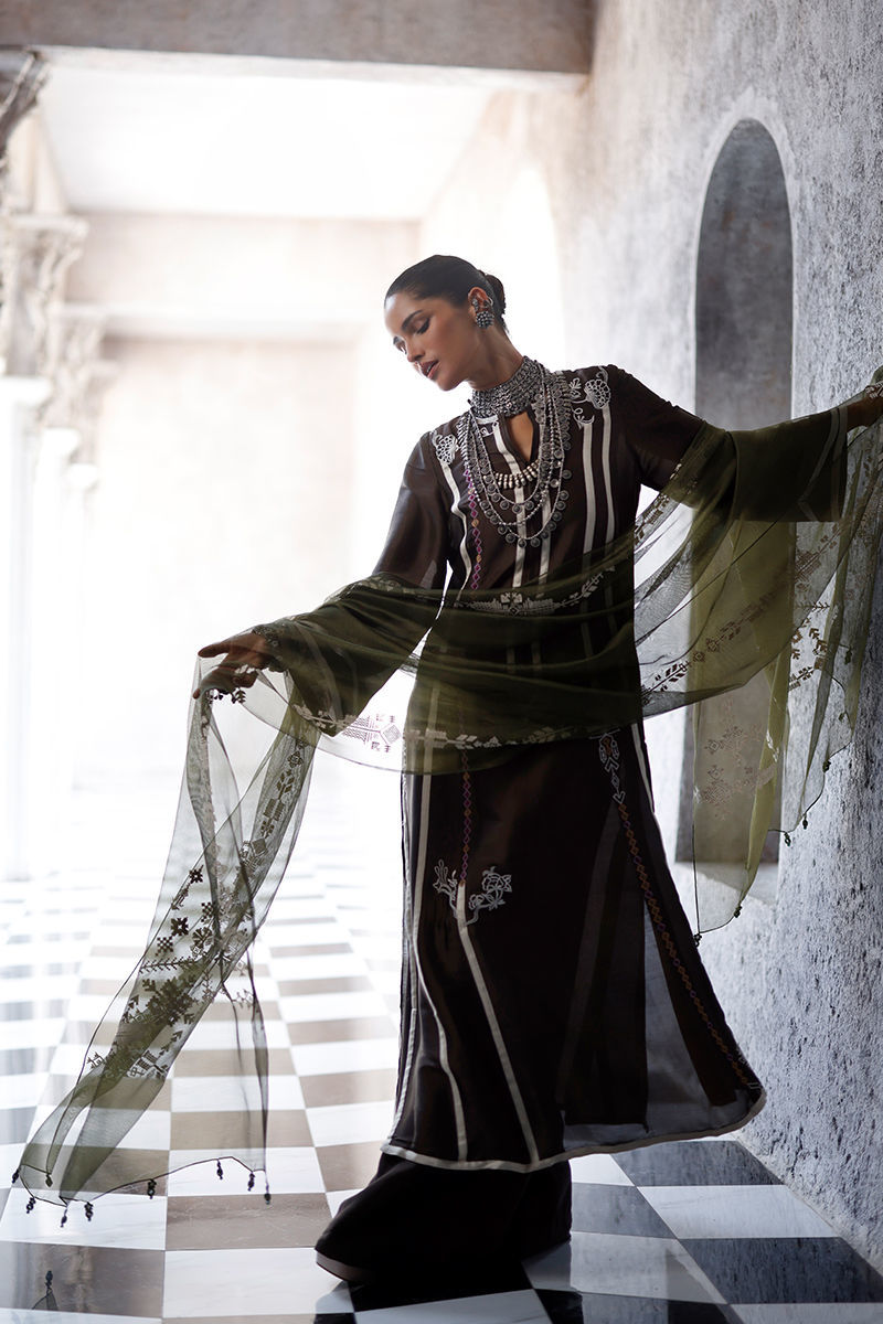 The fudge brown panel shirt, crafted from butter silk, features intricate appliqué work and coloured resham embroidery across the front, back, and sleeves, creating a textured and artisanal finish. It is paired with cotton charmeuse culottes for a fluid silhouette, and completed with an army green shisha organza dupatta, detailed with screen print and finished with handmade tassels for a refined, elevated touch.