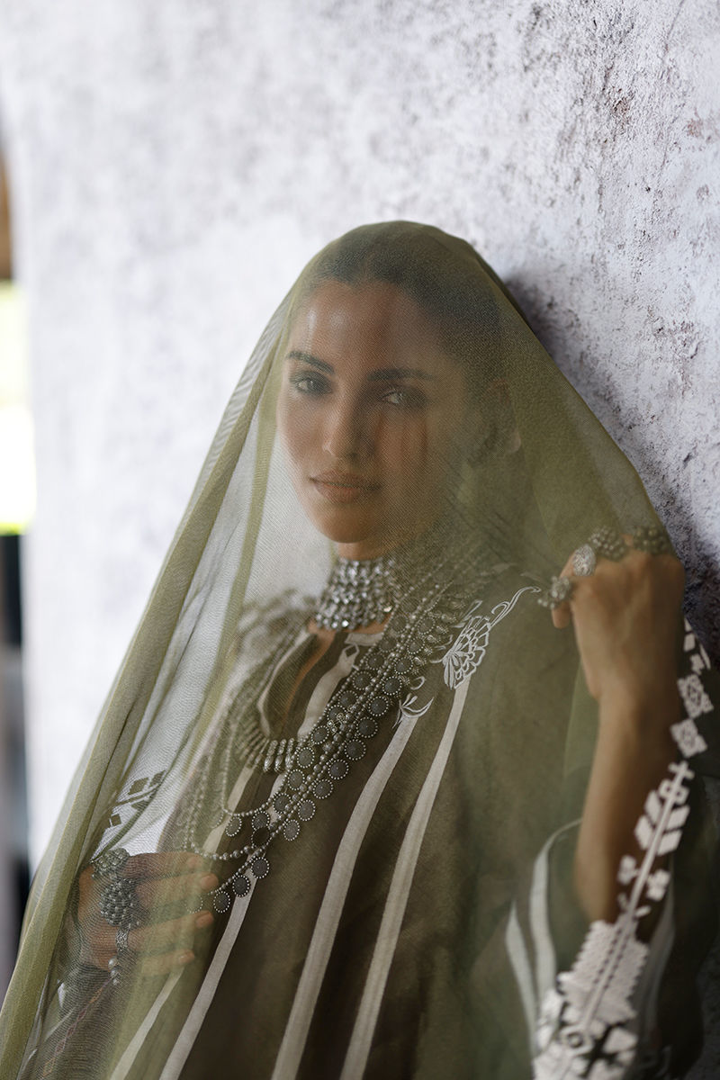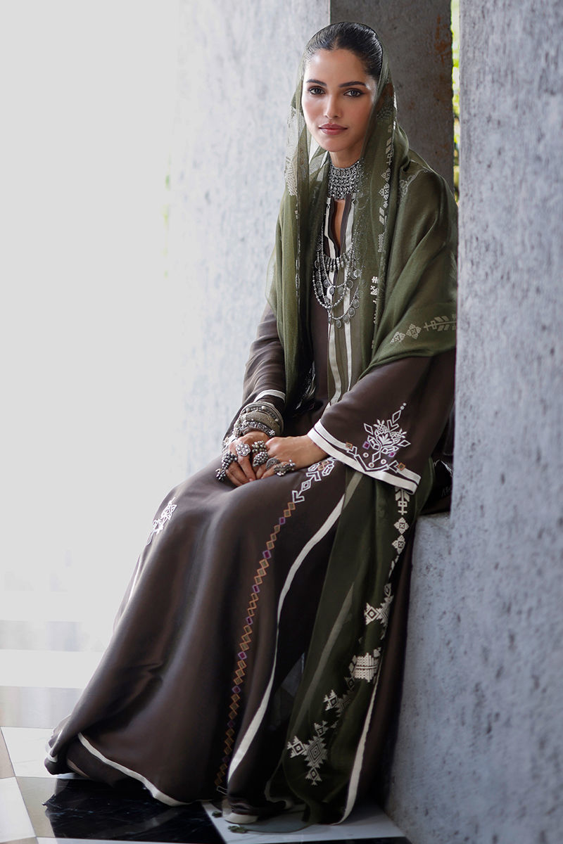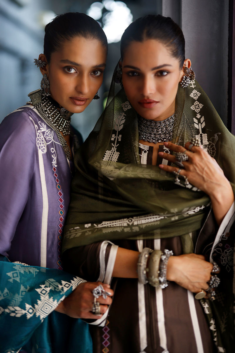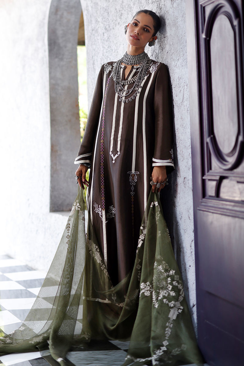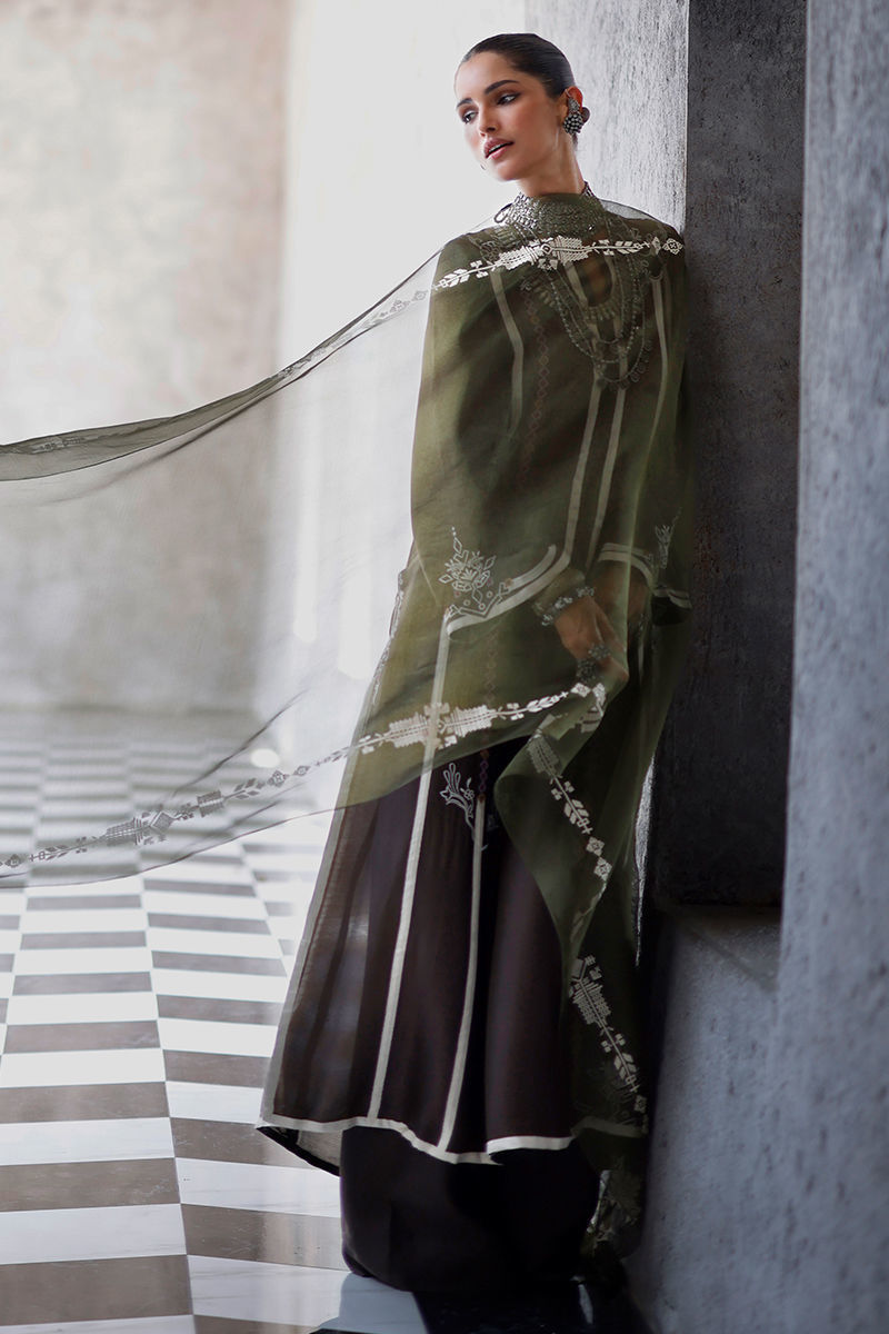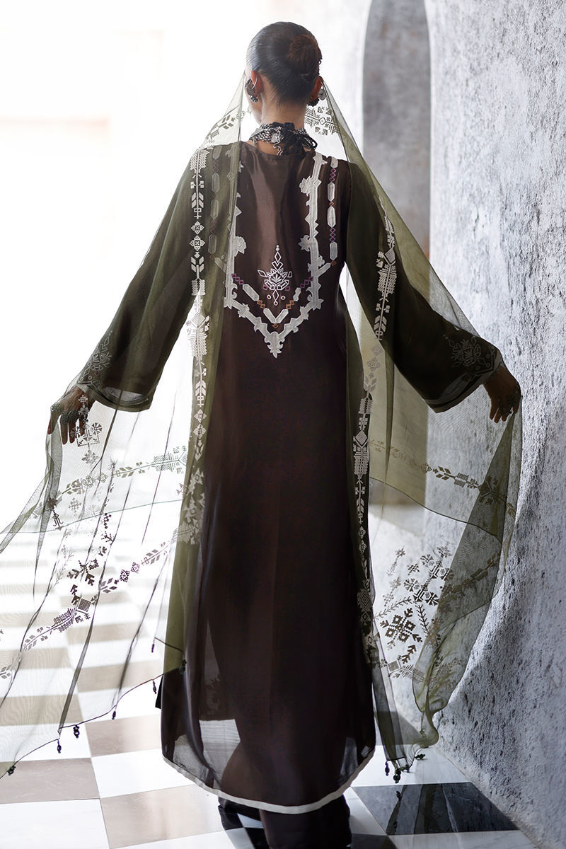 The fudge brown panel shirt, crafted from butter silk, features intricate appliqué work and coloured resham embroidery across the front, back, and sleeves, creating a textured and artisanal finish. It is paired with cotton charmeuse culottes for a fluid silhouette, and completed with an army green shisha organza dupatta, detailed with screen print and finished with handmade tassels for a refined, elevated touch.
