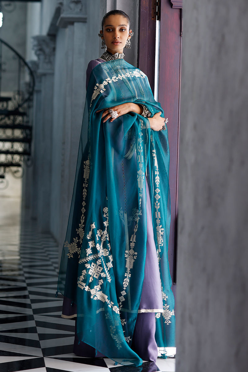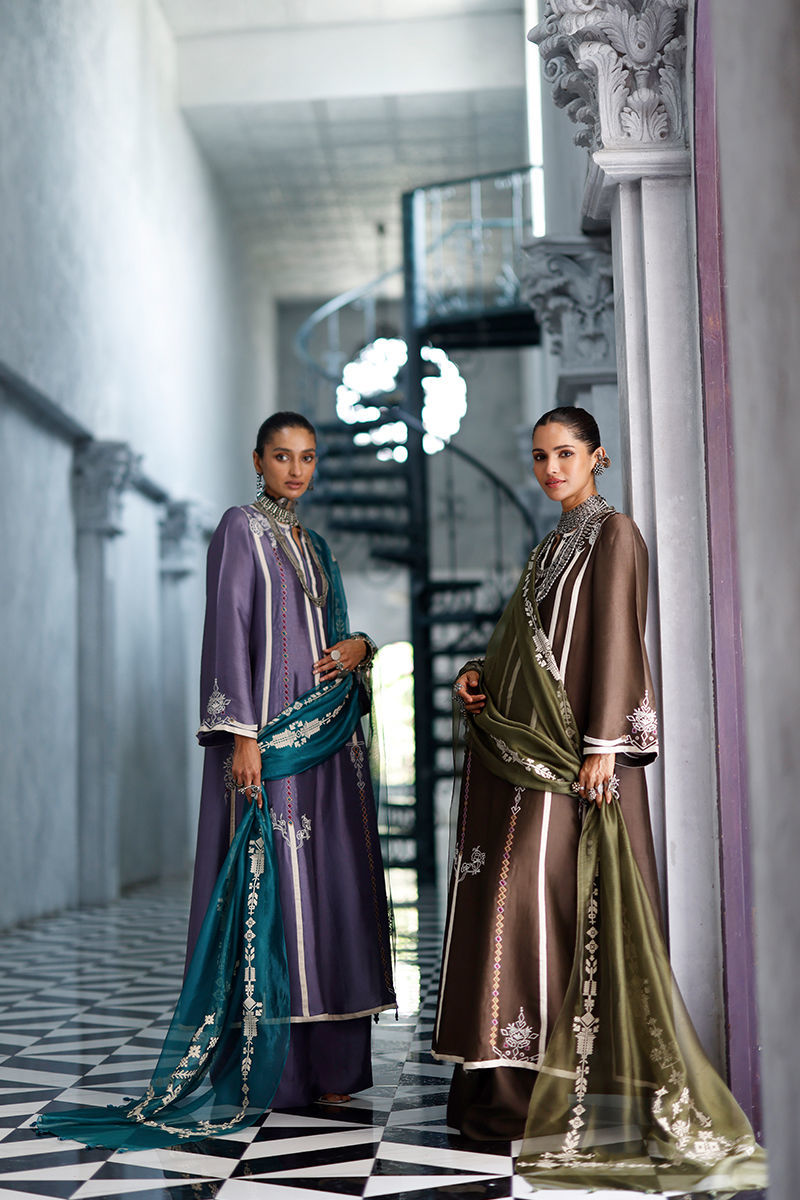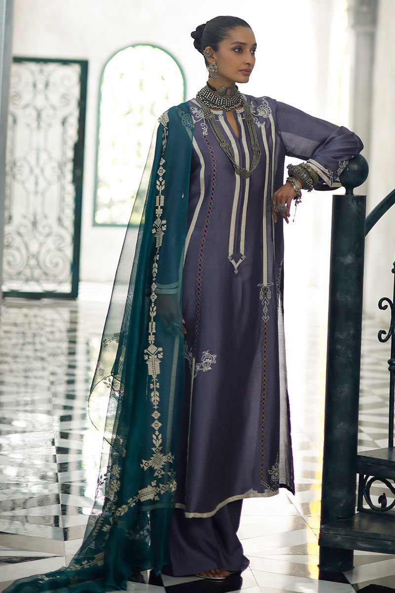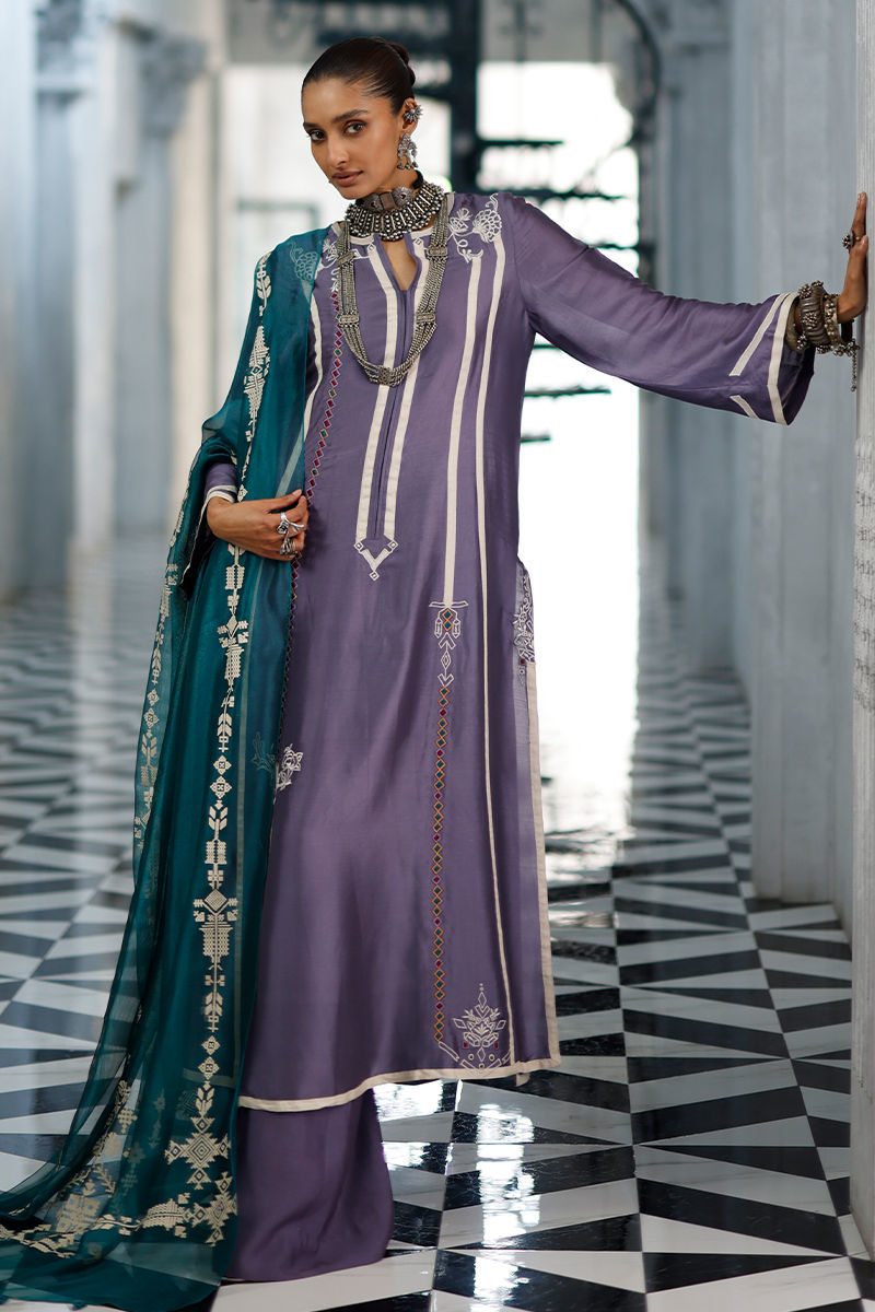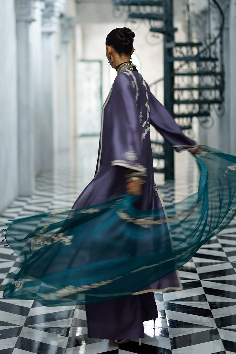 The grape jam panel shirt, crafted from butter silk, features intricate appliqué work and coloured resham embroidery across the front, back, and sleeves, creating a refined and artisanal finish. It is paired with cotton charmeuse culottes for a fluid and elegant silhouette, and completed with an antique green shisha organza dupatta, detailed with screen print and finished with handmade tassels for a graceful, elevated touch.