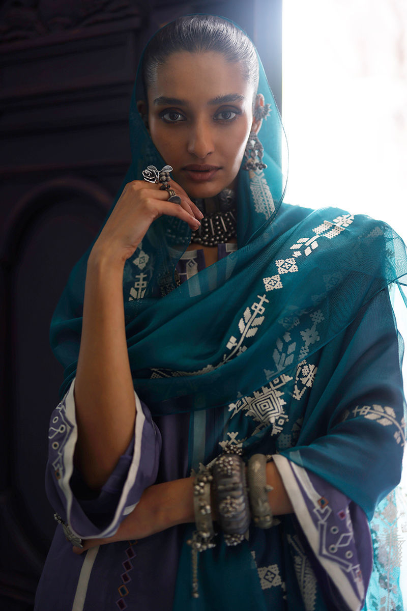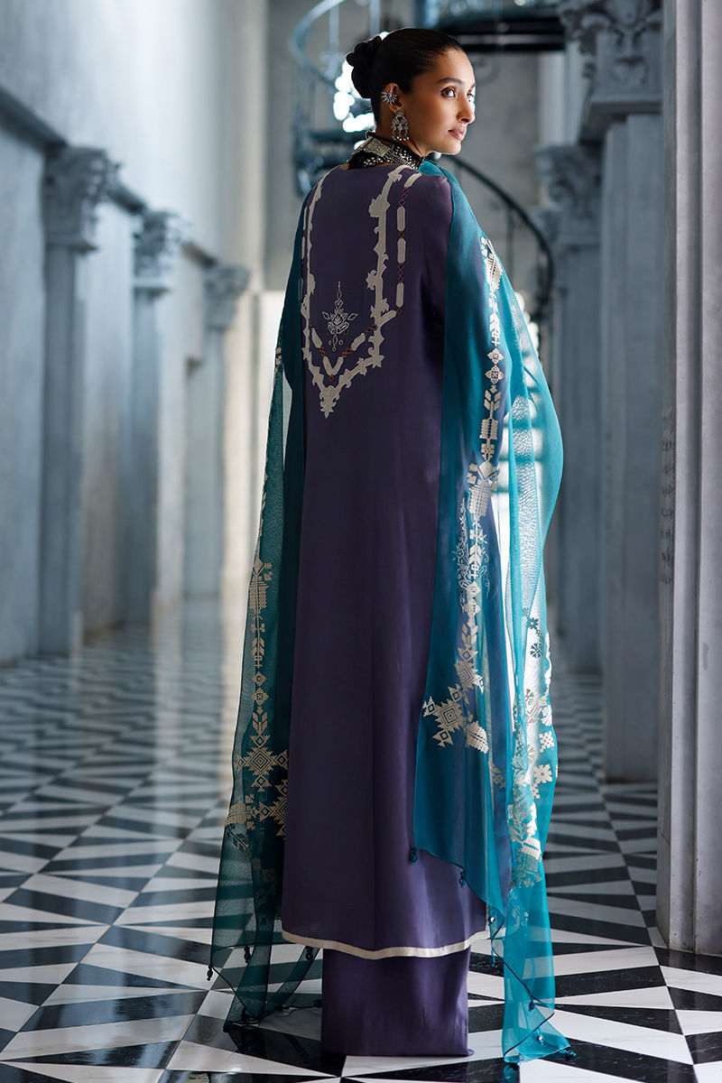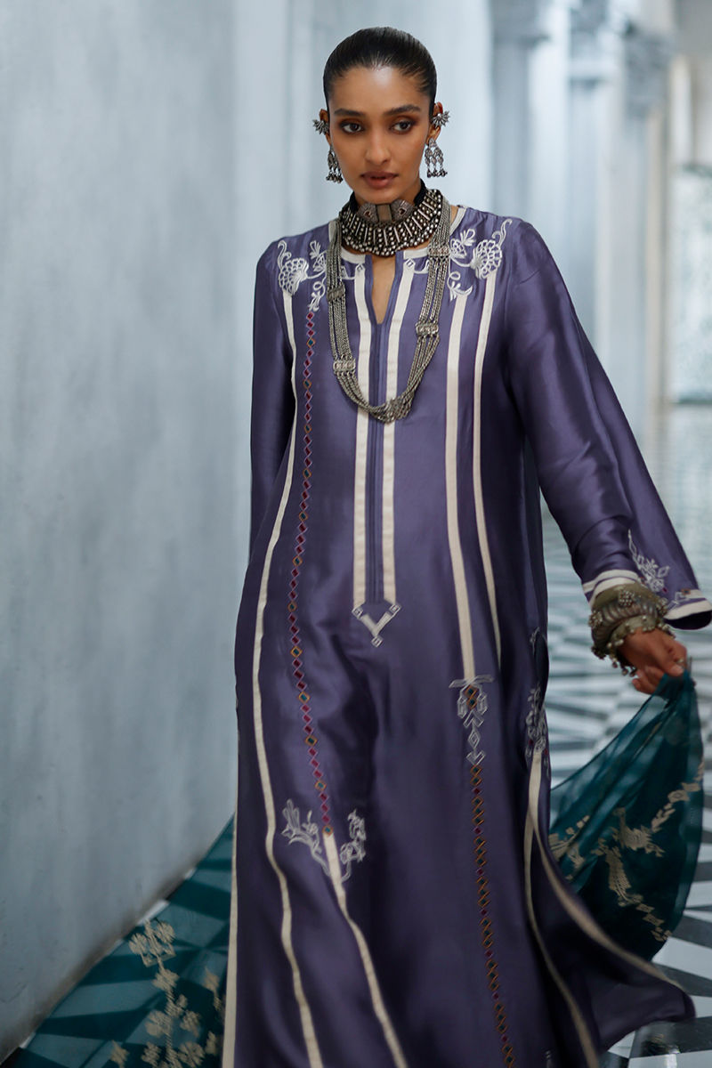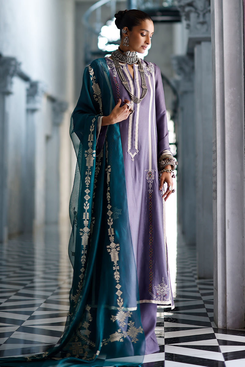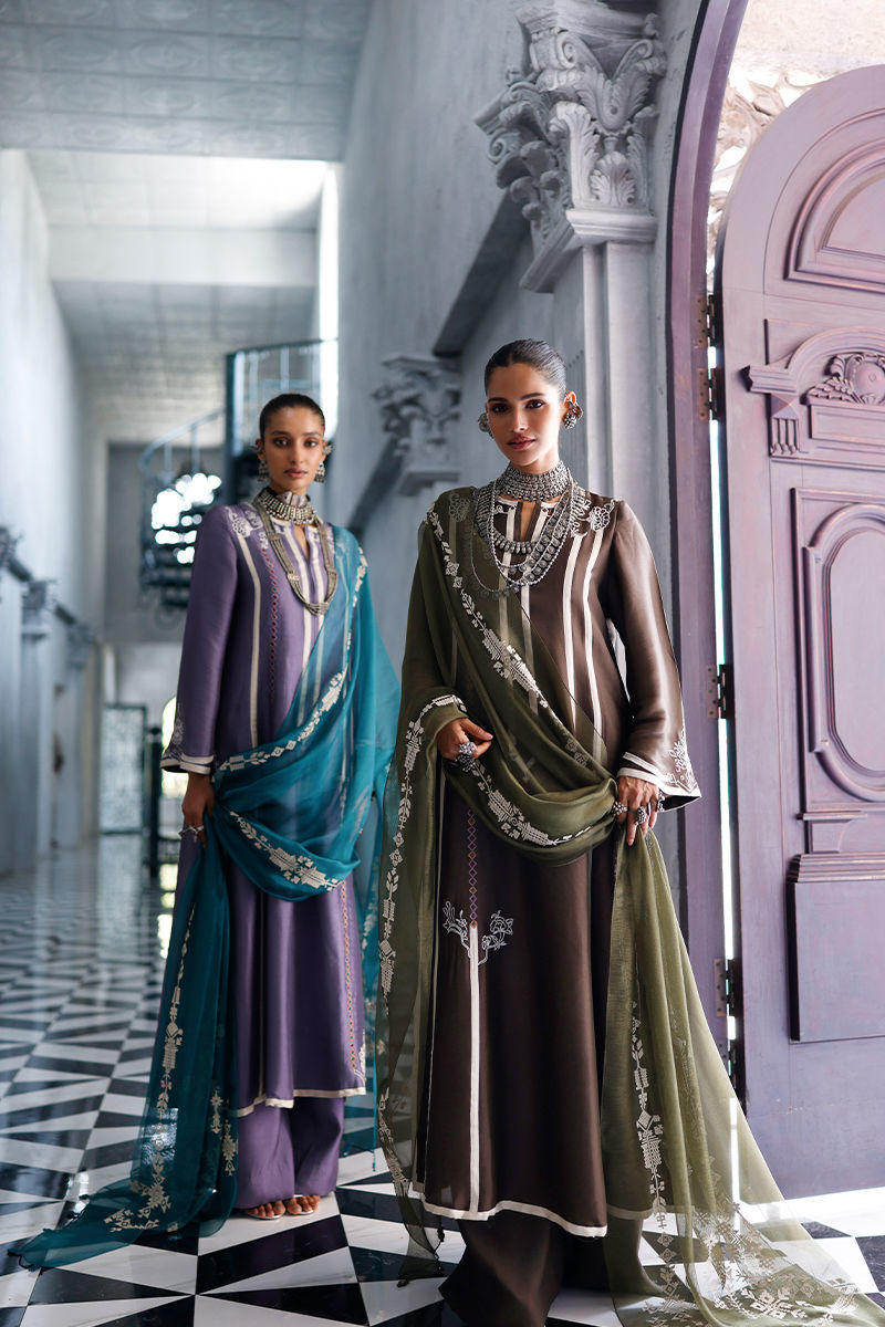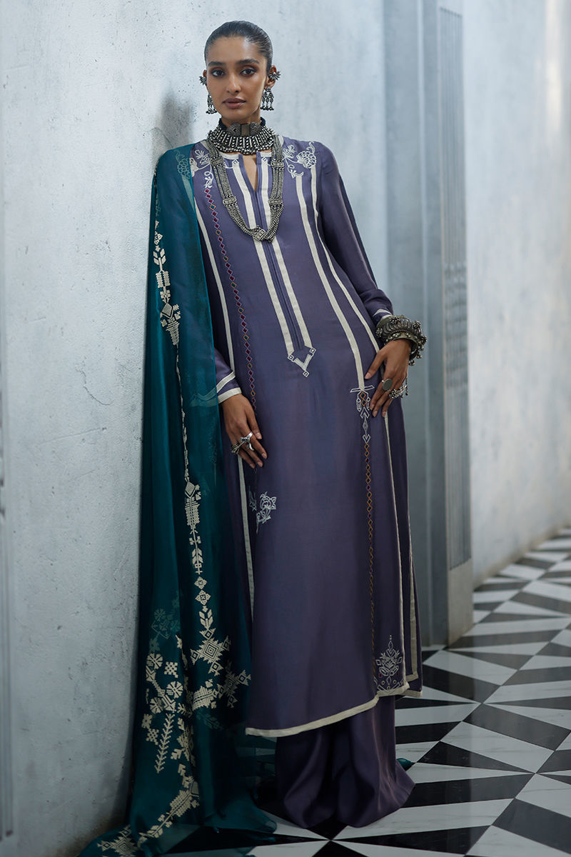 The grape jam panel shirt, crafted from butter silk, features intricate appliqué work and coloured resham embroidery across the front, back, and sleeves, creating a refined and artisanal finish. It is paired with cotton charmeuse culottes for a fluid and elegant silhouette, and completed with an antique green shisha organza dupatta, detailed with screen print and finished with handmade tassels for a graceful, elevated touch.