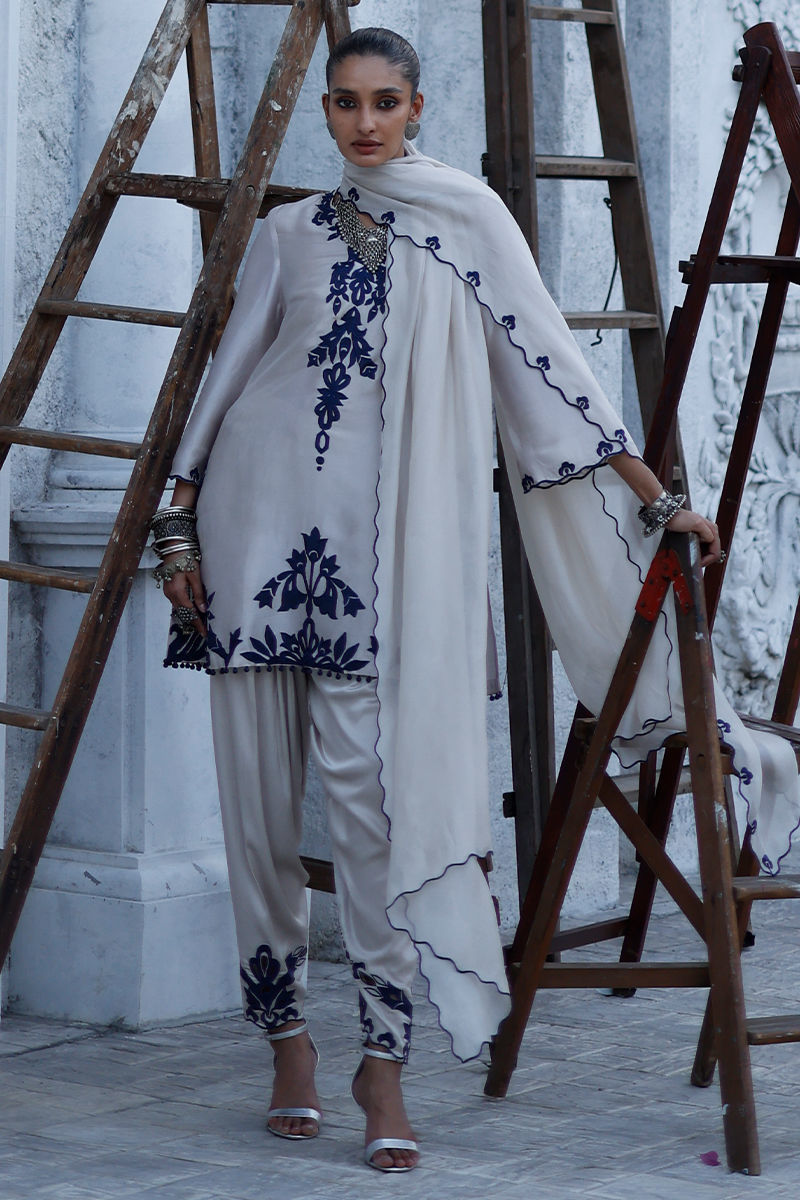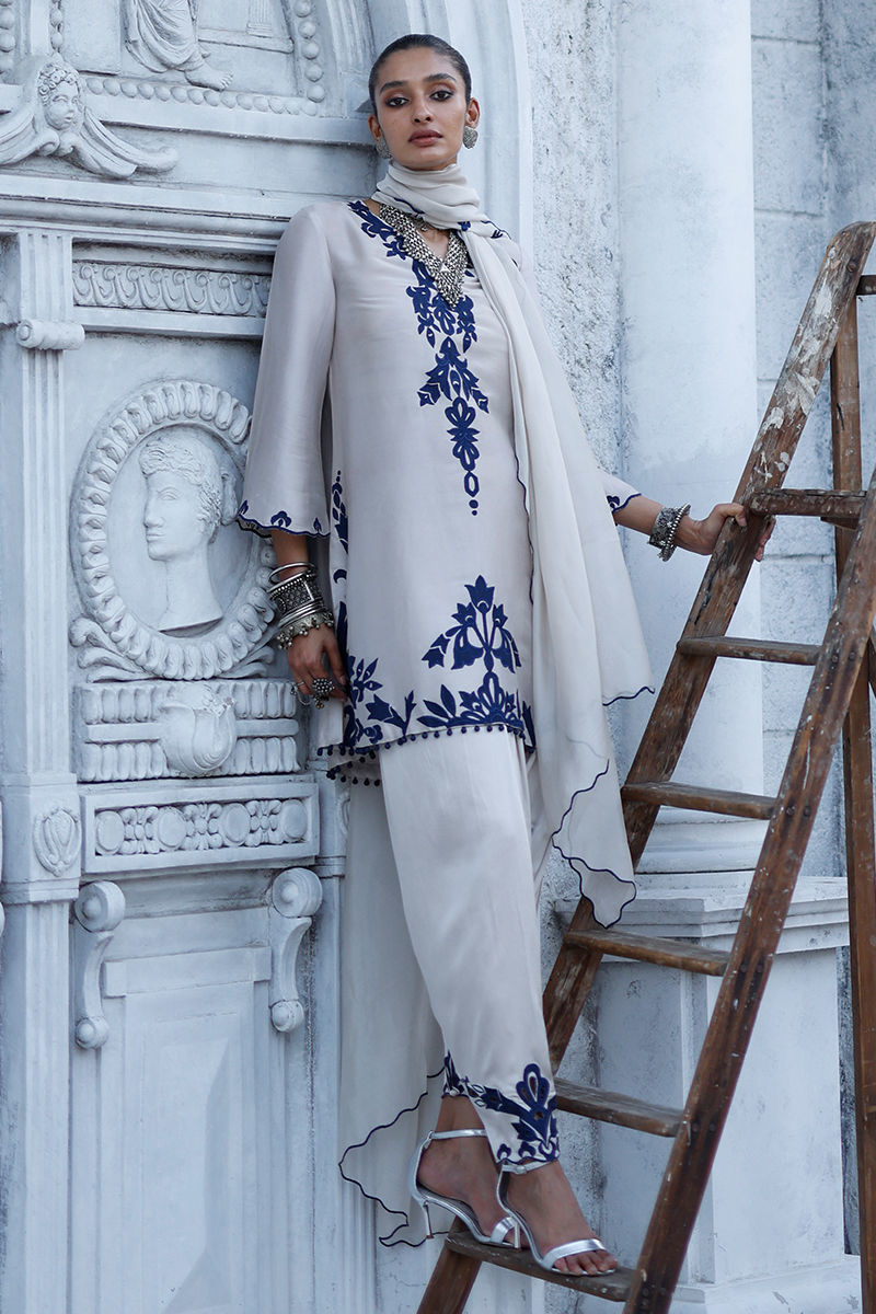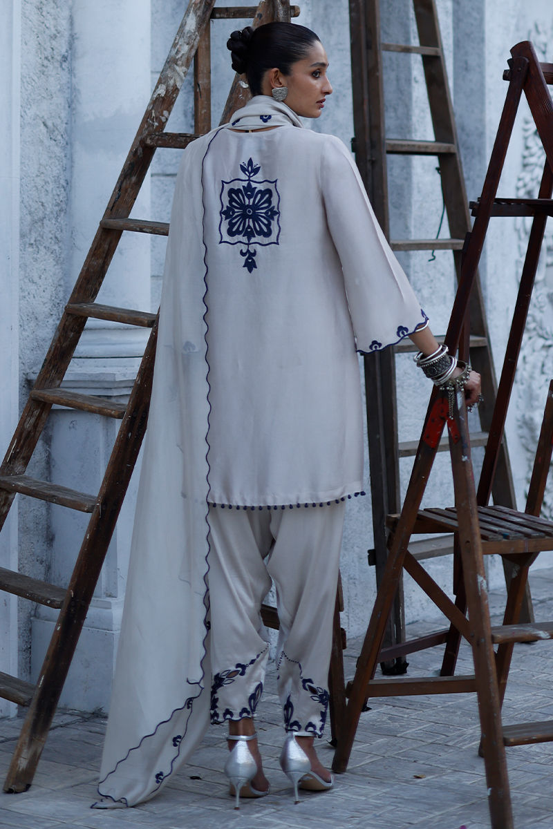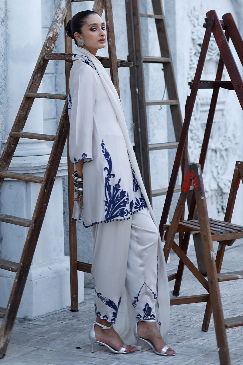 The cloud dancer short A-line shirt, crafted from butter silk, features intricate appliqué work, resham embroidery, and delicate handmade hangings on the front, back, and sleeves, creating a refined and artisanal finish. It is paired with khari shalwar in cotton charmeuse, detailed with appliqué work, resham embroidery, and subtle cutwork for an elegant silhouette. The ensemble is completed with a cloud dancer shisha organza dupatta, featuring resham embroidery along all four sides and scalloped edges, adding a graceful and elevated touch.