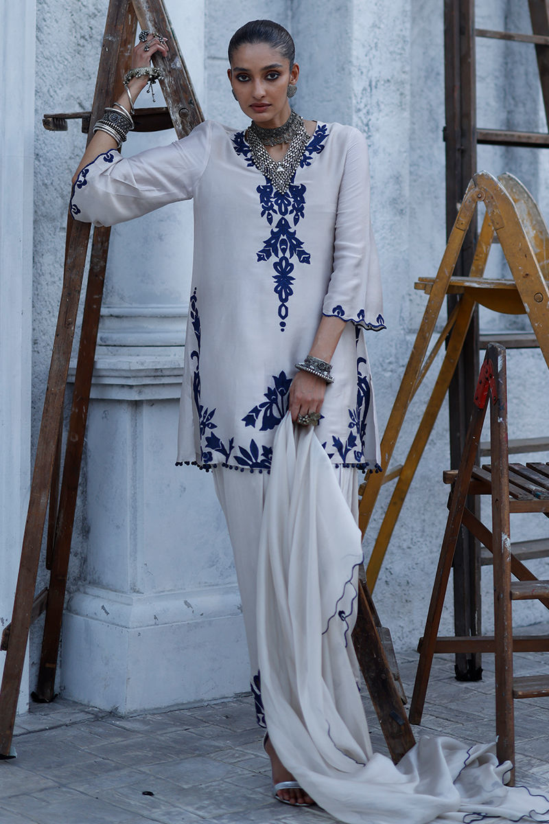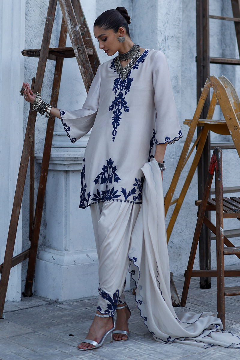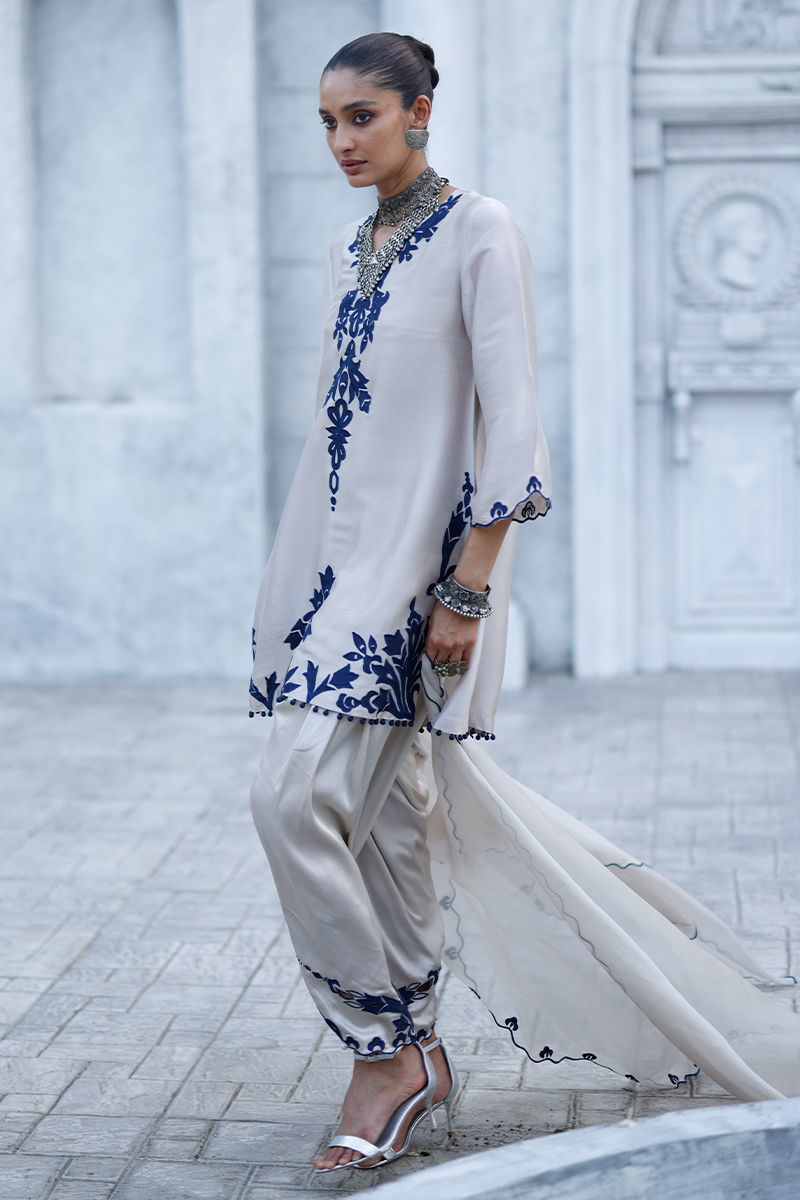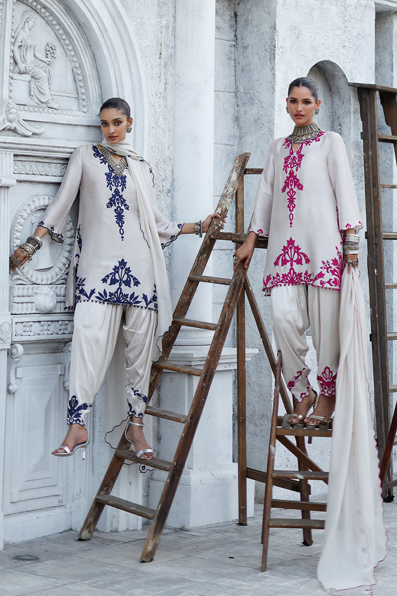 The cloud dancer short A-line shirt, crafted from butter silk, features intricate appliqué work, resham embroidery, and delicate handmade hangings on the front, back, and sleeves, creating a refined and artisanal finish. It is paired with khari shalwar in cotton charmeuse, detailed with appliqué work, resham embroidery, and subtle cutwork for an elegant silhouette. The ensemble is completed with a cloud dancer shisha organza dupatta, featuring resham embroidery along all four sides and scalloped edges, adding a graceful and elevated touch.