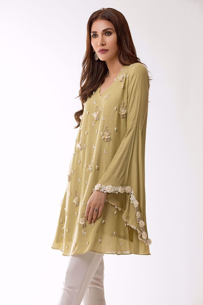 Olive khadi net Shirt hand worked with different handwork materials such as pearls, cut dana, sequins, moti and 3D flowers etc.
