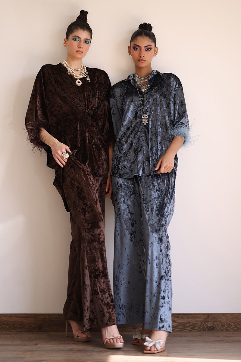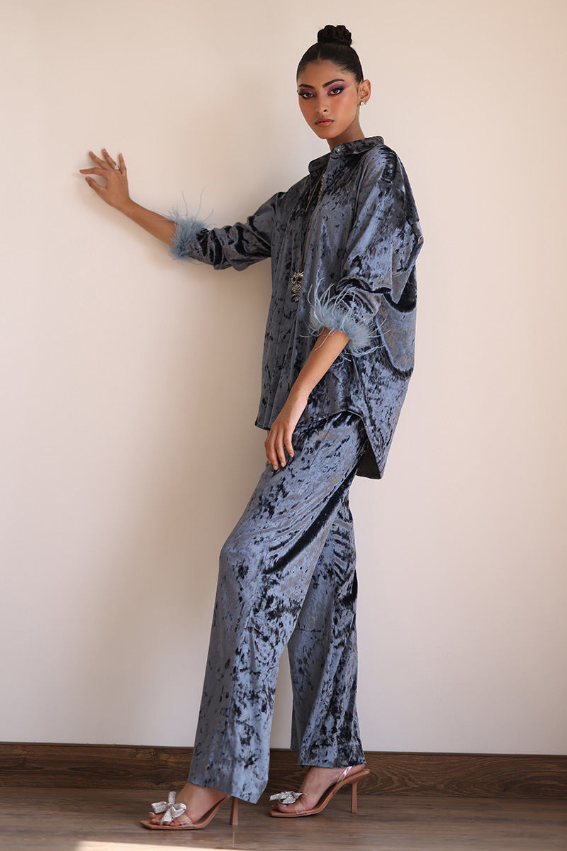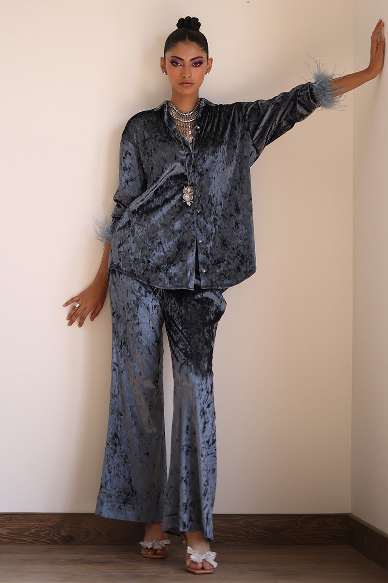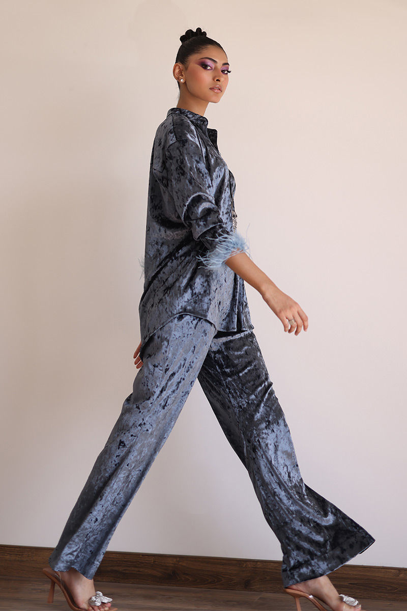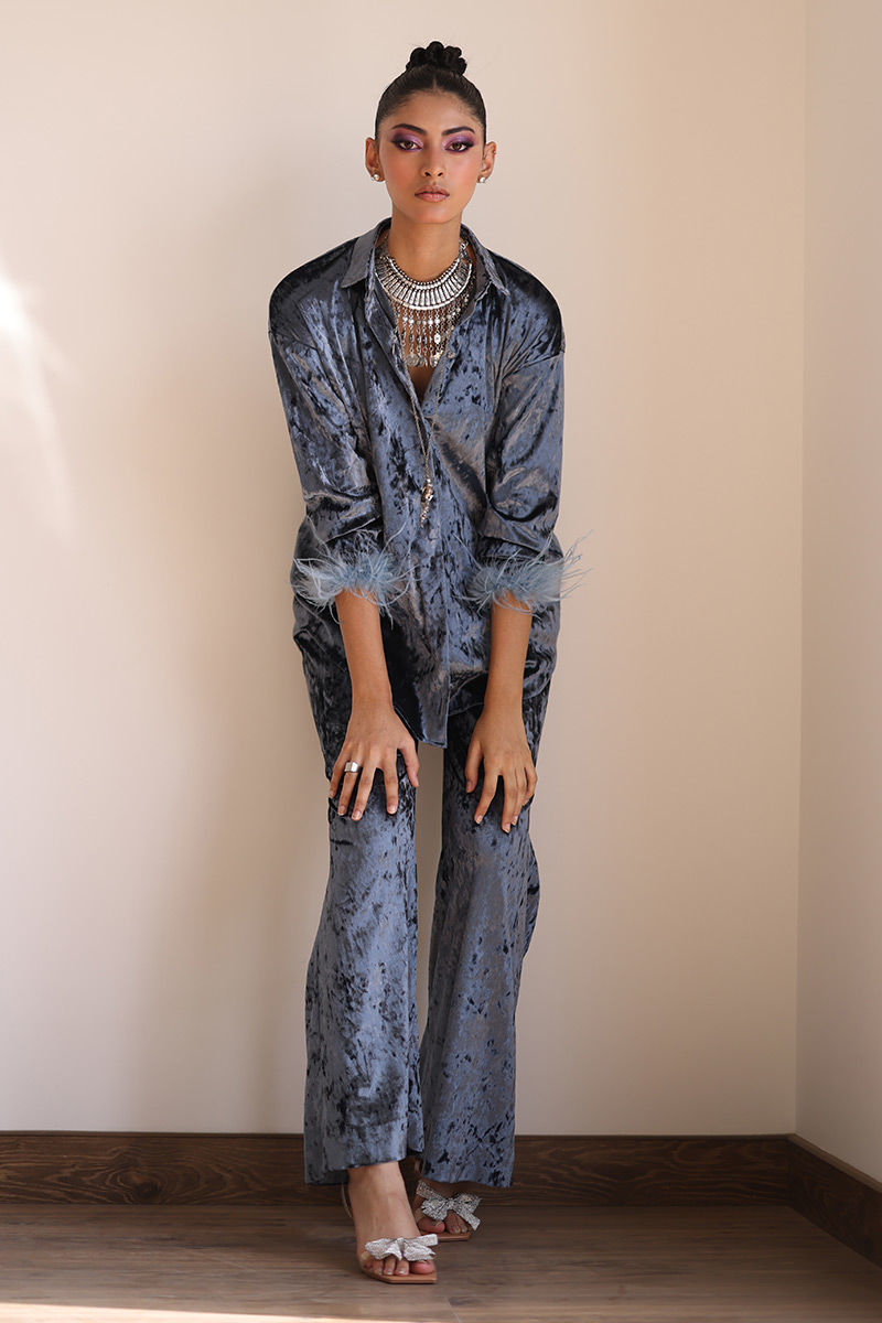 From gala events to sophisticated evenings out, our steeple grey velvet ensemble ensures you're always dressed in impeccable style. Crafted from velvet, this ensemble invites you to experience sheer opulence. The bell-bottom sleeves are adorned with lavish fur lace, adding an element of sophistication and charm to this ensemble. The bell-bottom pants complete the look with a touch of retro charm.