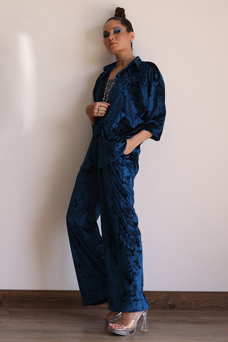 Elevate your style with our teal blue ice velvet ensemble. This outfit effortlessly blends sophistication with comfort, ensuring you shine in every setting. Crafted from ice velvet, this ensemble invites you to experience sheer opulence. The Culottes complete the look with a touch of retro charm. The loose culottes provide an easy and relaxed fit, perfect for both casual gatherings and formal occasions.