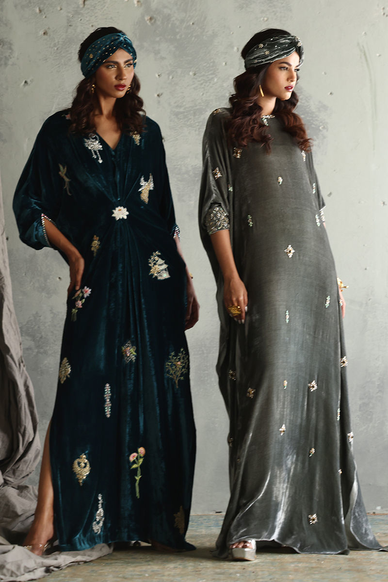 Elevate your wardrobe with our stunning Granite Green Kaftan. Crafted from luxurious pure velvet, this kaftan features a length of 58 inches, designed to create a graceful silhouette. The allover botis design is intricately embellished with exquisite handwork, including tikki stones, crystals, colored stones, pearls, kora, and cutdana. Detailed handwork on the back and cuffs adds an extra layer of sophistication. Perfect for special occasions or elegant evenings, this kaftan pairs beautifully with the accompanying band for a cohesive look. Embrace timeless elegance and artistry with this captivating piece! It includes Kaftan and Pants.