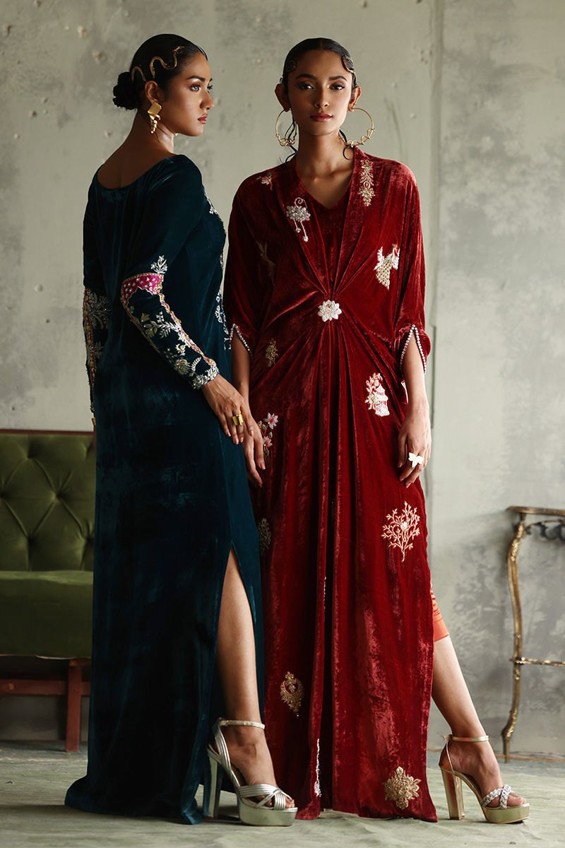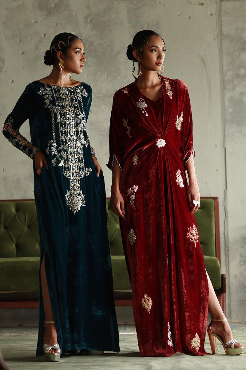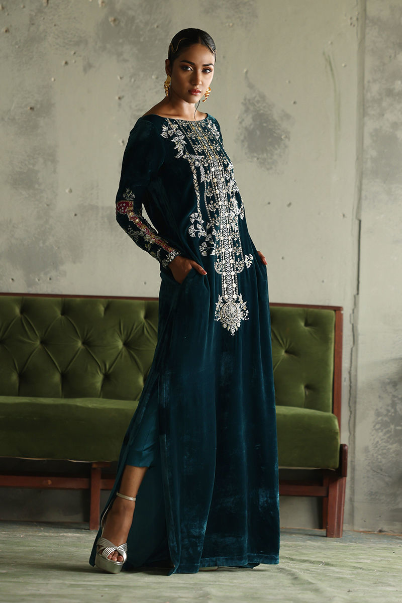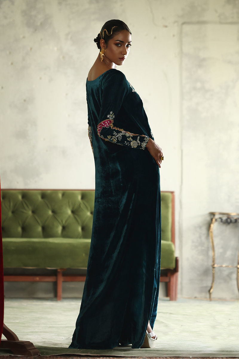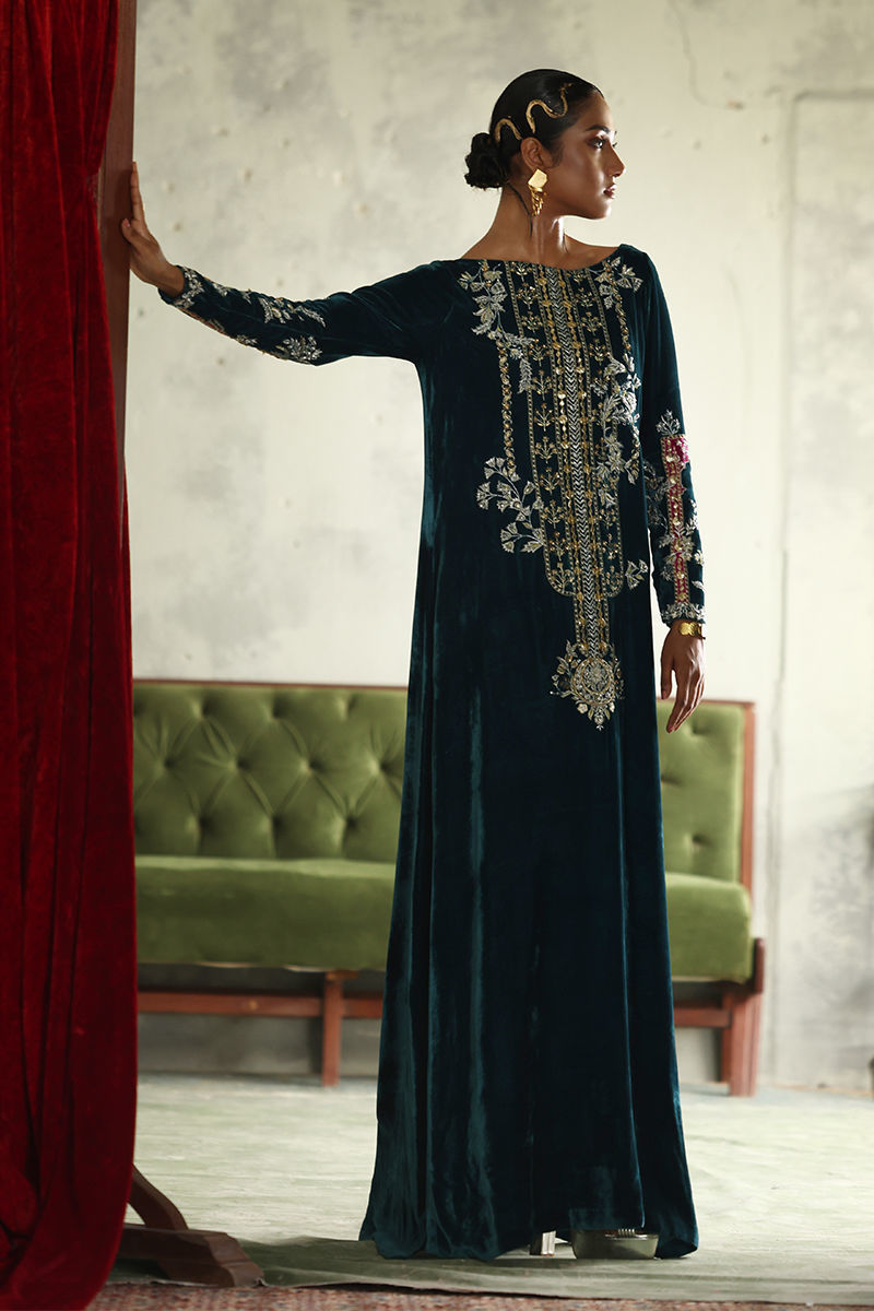 Elevate your elegance with our stunning Peacock Teal Straight Kaftan, crafted from pure velvet for a luxurious feel. This exquisite piece features a length of 58 inches, designed to create a flattering silhouette. The long neckline and sleeves are intricately adorned with a mesmerizing blend of silver and gold embellishments, including resham, zari, kora, dabka, naqshi, sequins, gota, moti, cutdana, tikki stones, and pearls, resulting in a truly opulent design. Perfect for special occasions or elegant evening events, this kaftan is a versatile addition to your wardrobe that showcases both style and sophistication. Embrace the beauty of artistry with this captivating kaftan!