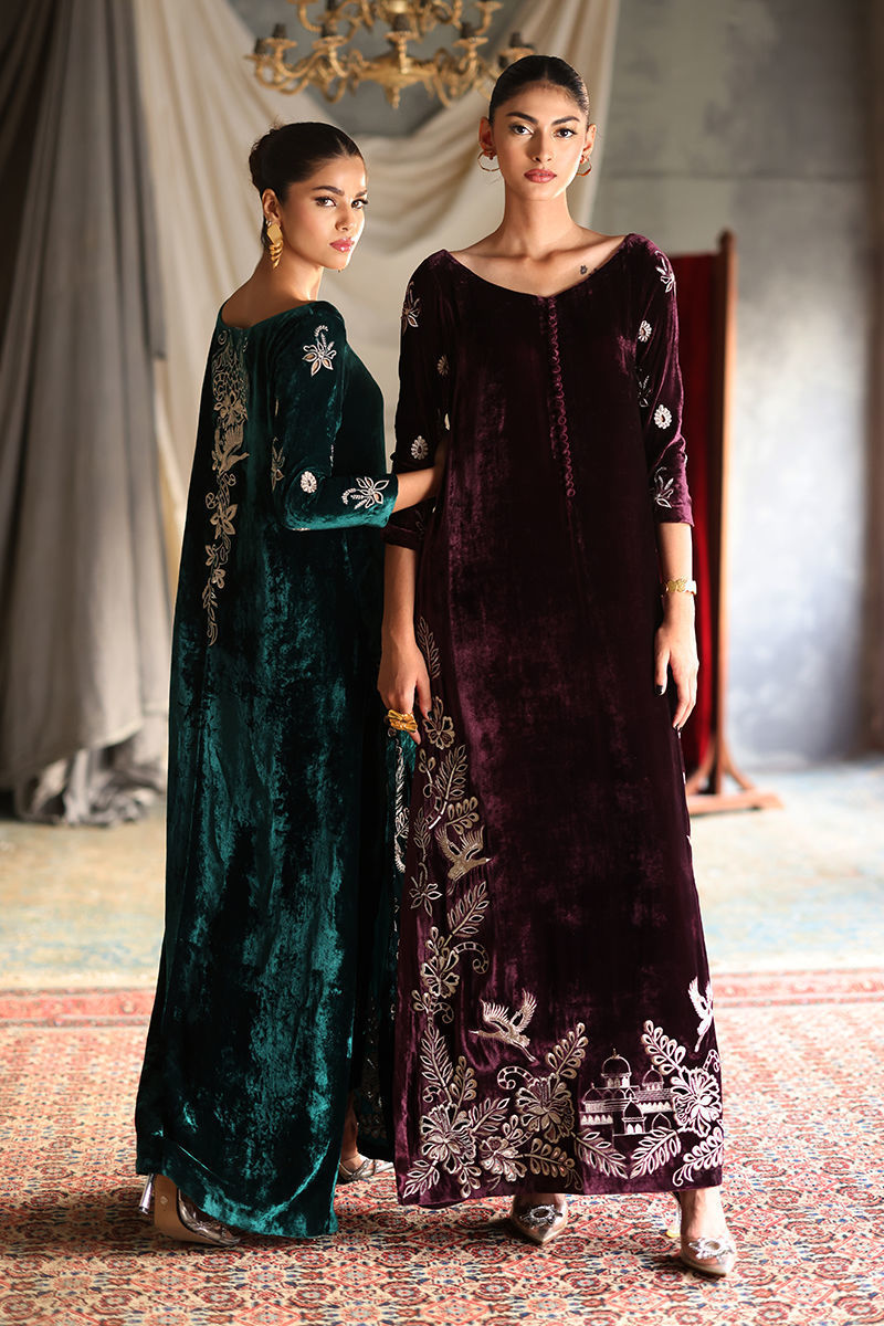 Introducing a Straight Kaftan in Dark Plum, crafted from pure velvet for a luxurious touch. With a length of 58 inches, this elegant kaftan features intricate zari embroidery and exquisite cut work on the daman, back, and sleeves. Perfectly paired with pure velvet pants, this ensemble offers a sophisticated look for any occasion. Elevate your style with this stunning combination that radiates grace and artistry!