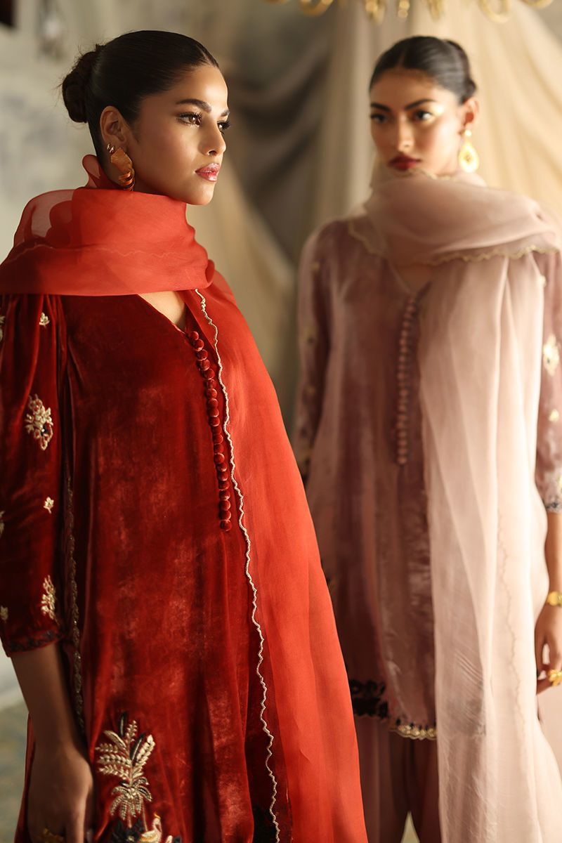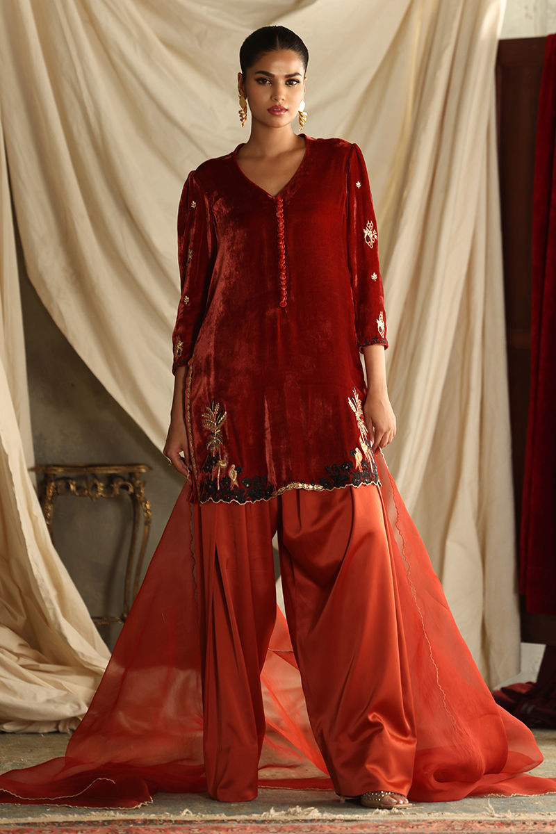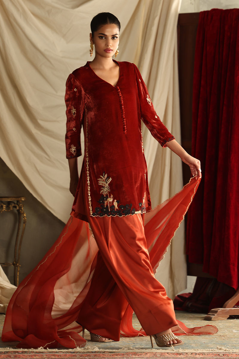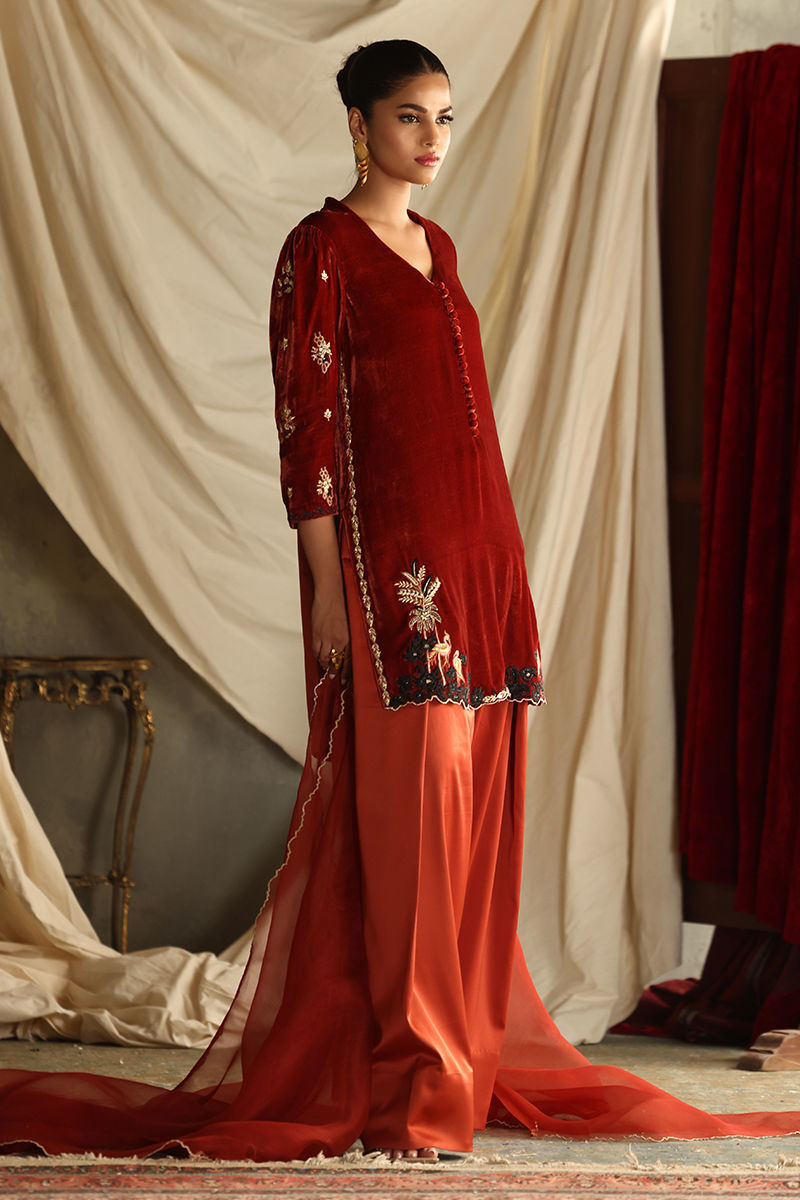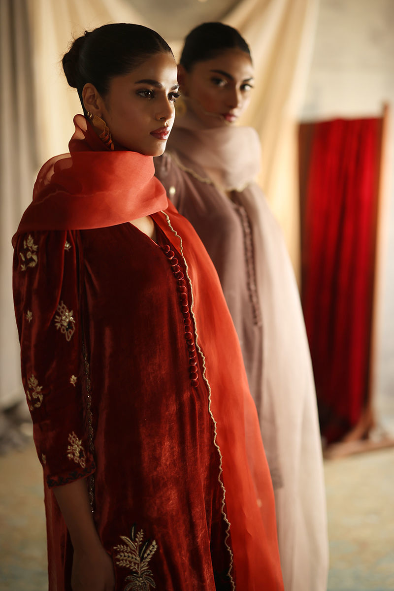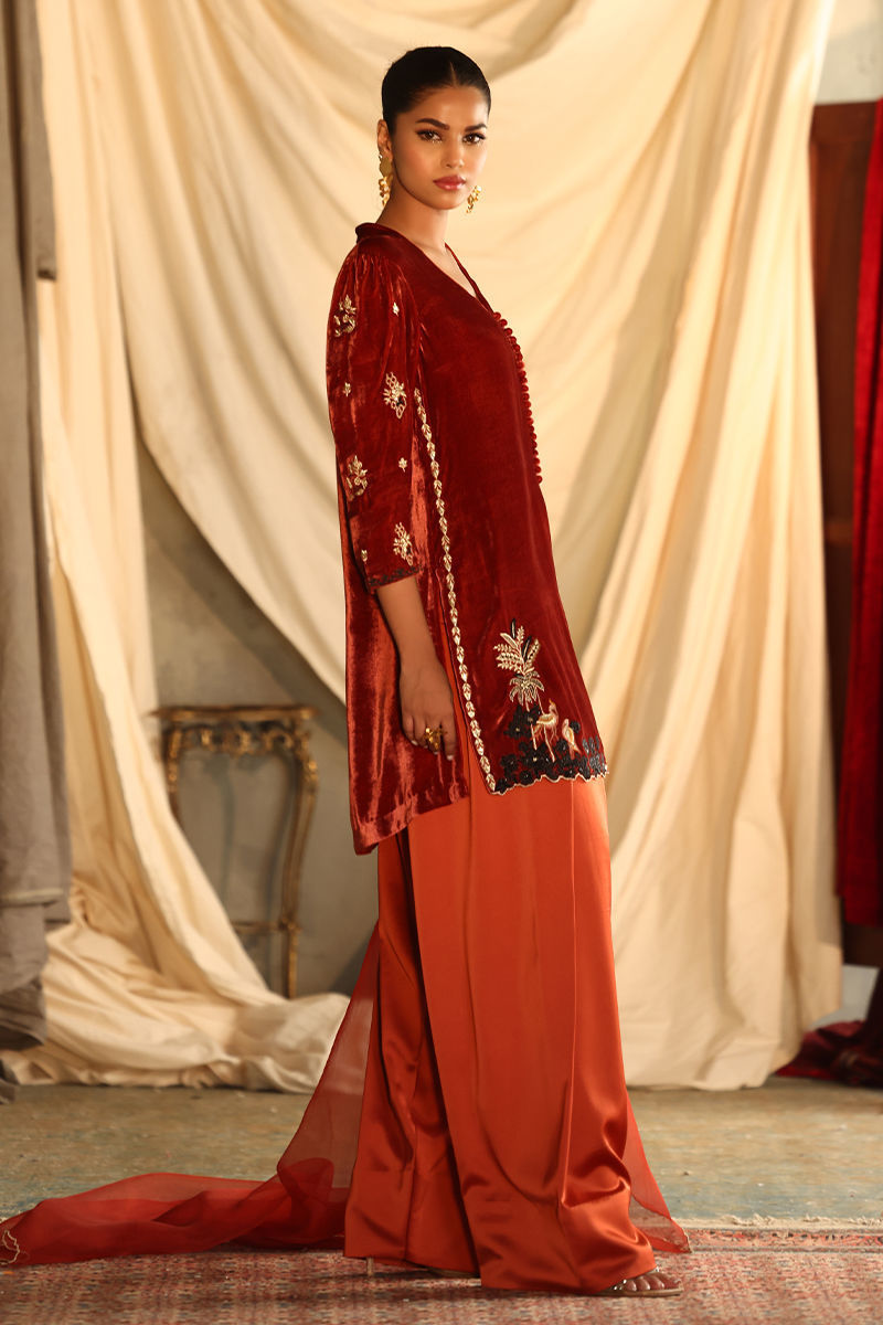 This luxurious burnt rust short shirt combines classic elegance with intricate craftsmanship. Made from pure velvet, the 33-inch shirt features gold and black zari embroidery on the daman and sleeves, offering a rich, textured aesthetic. Paired with 42-inch shimmer crepe shalwar, the ensemble exudes refined style. The pure organza dupatta, with its four-sided zari scallop embroidery, adds a delicate finishing touch.